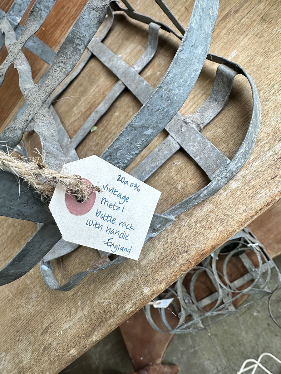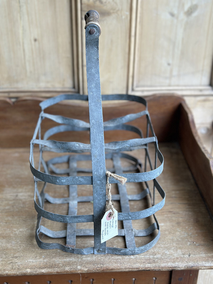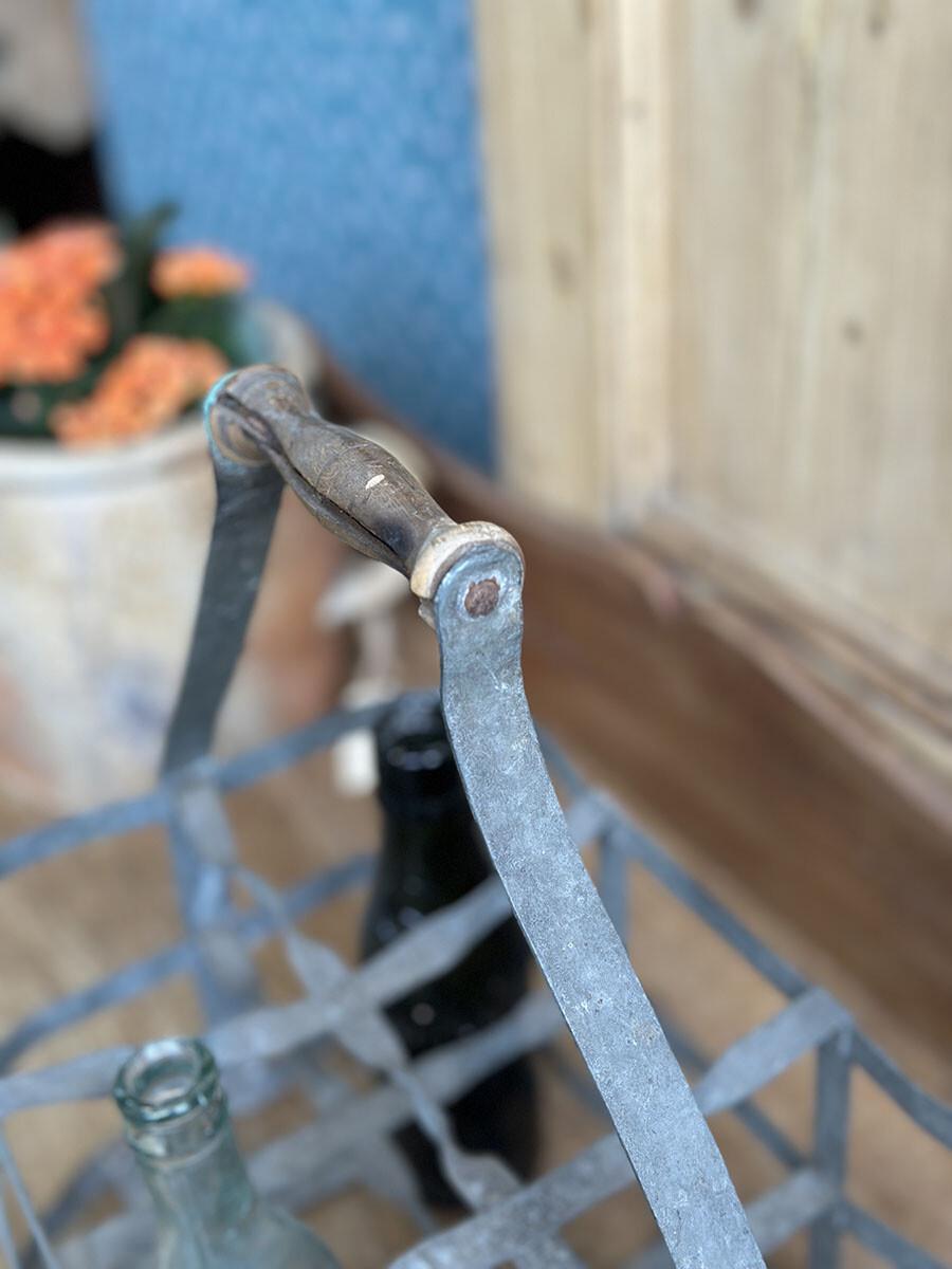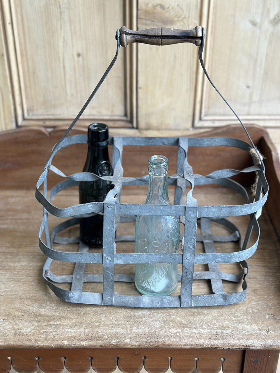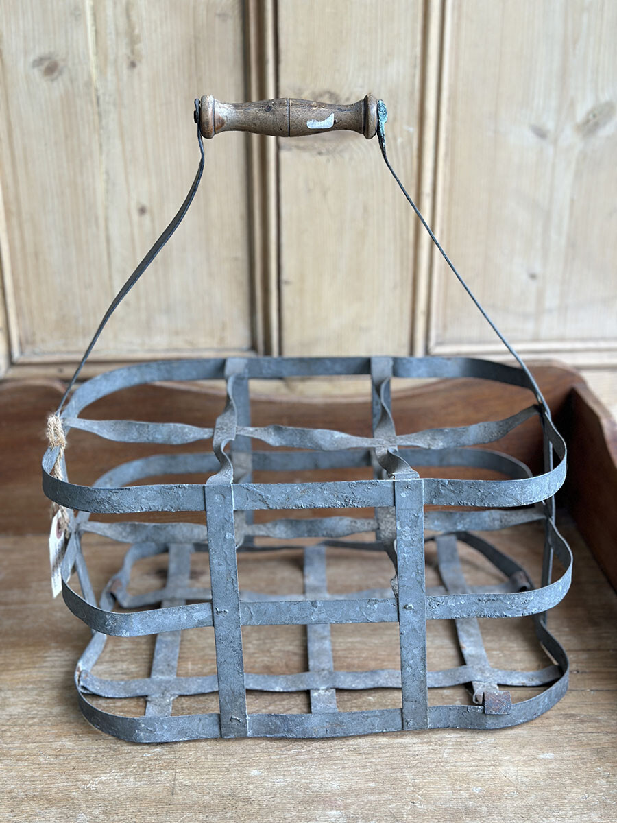손잡이가 달려 있는 철제 보틀 랙입니다. 병입 상품을 안전히 옮기기 위해 제작된 것으로 보입니다. 사용된 철의 종류는 녹에 강한 소재인 징크(zinc)입니다.
