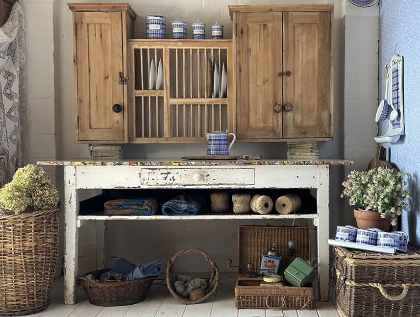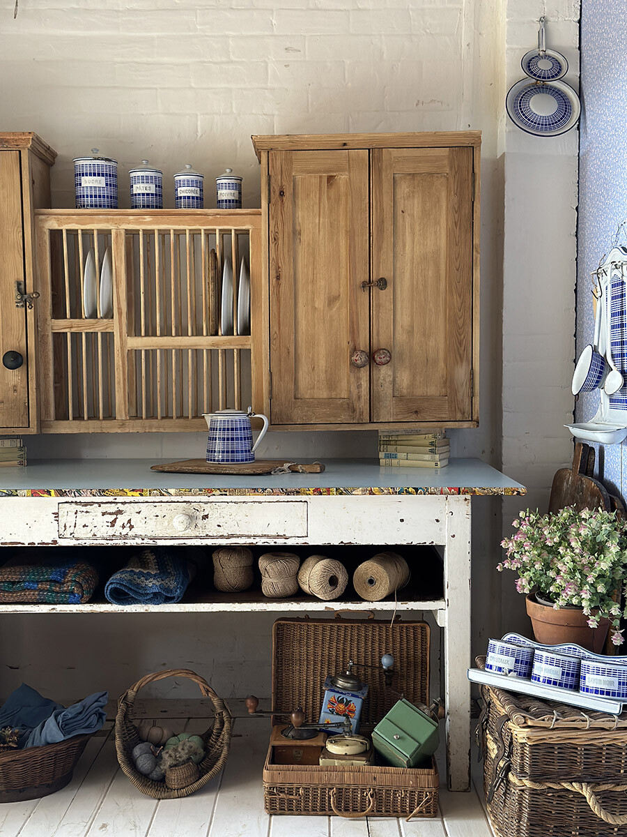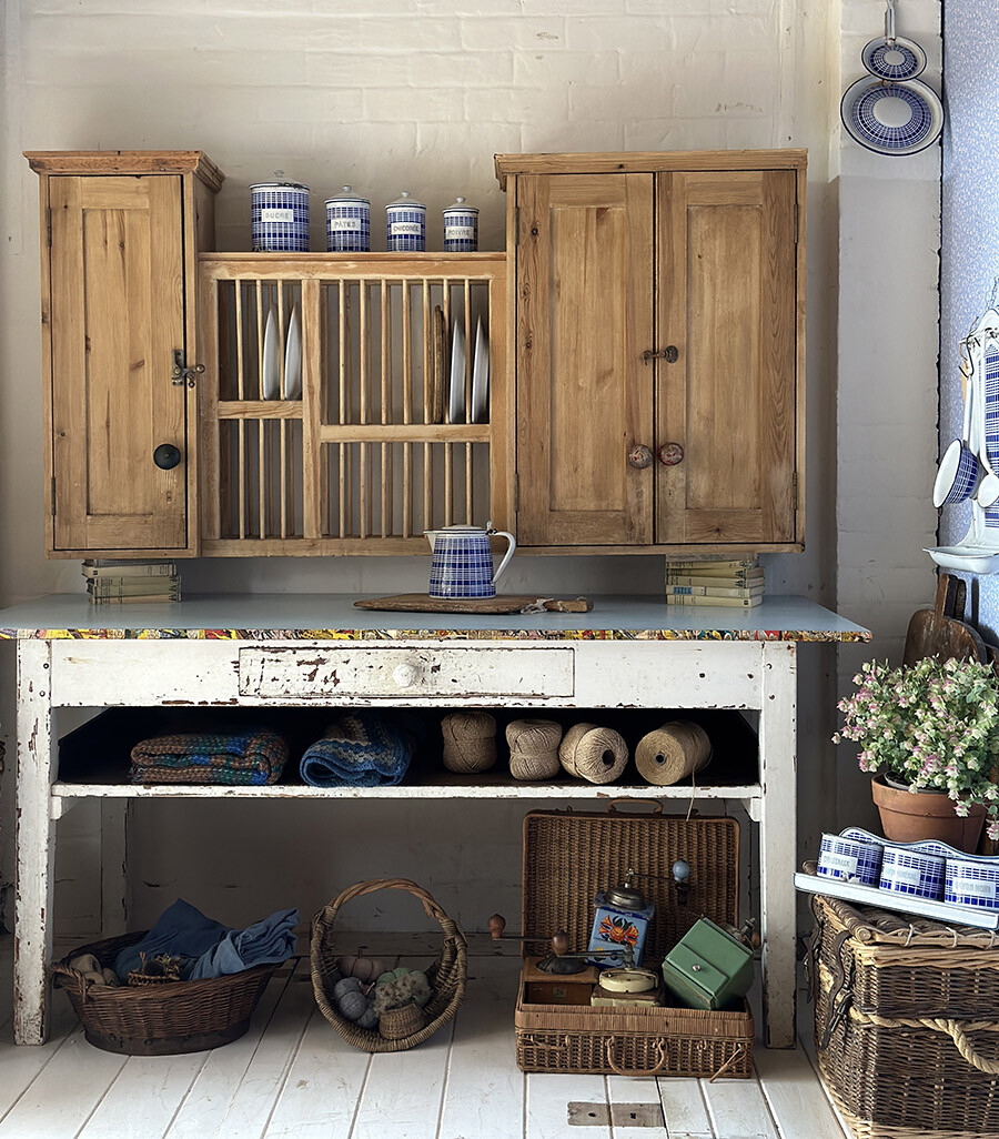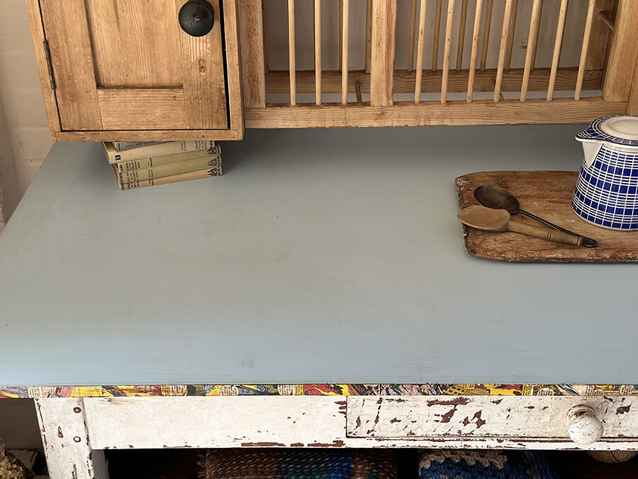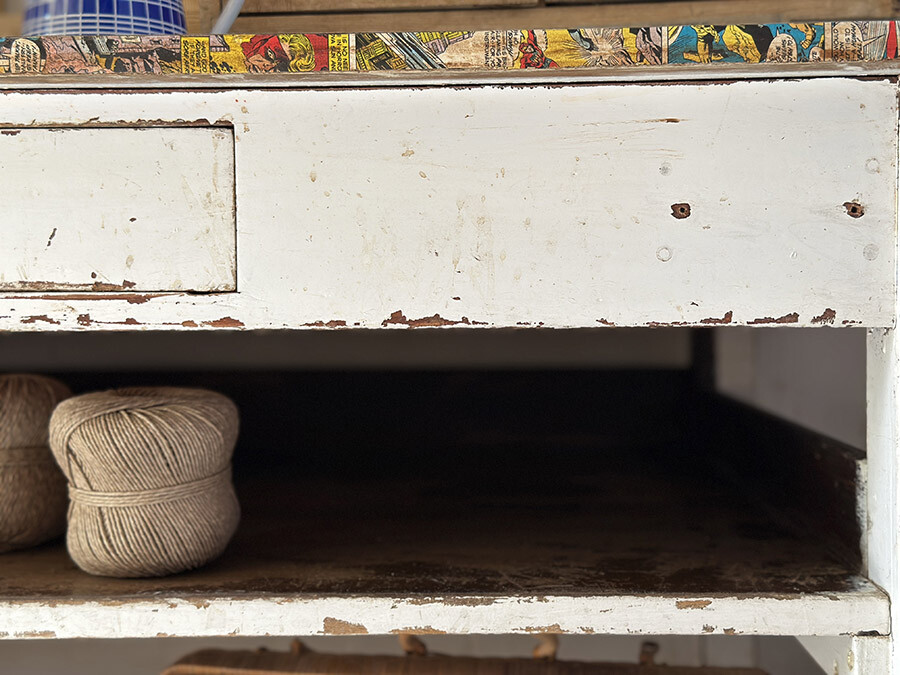 꽤 큼직한 사이즈의 빈티지 포마이카 테이블입니다. 상부에는 라이트 블루 컬러의 포마이카 상판이, 테이블 하부는 화이트 컬러의 쉐비 시크로 되어 있습니다. 큰 서랍이 하나 딸려 있는데 그 아래에 선반이 하나 마련되어 있습니다. 필요한 물건들을 수납하기 위한 쉘프로, 여기에 다양한 소품으로 다양한 연출이 가능해집니다. 이러한 구조로 보아 일반적인 식사용 다이닝 테이블이 아니라 준비용 프리페어링 테이블이나 작업용 워크 테이블. 혹은 디스플레이용 테이블과 같은 다른 목적을 위해 제작된 것임을 알 수 있습니다. 이에 따라 높이도 77cm로 높은 편에 속합니다.
