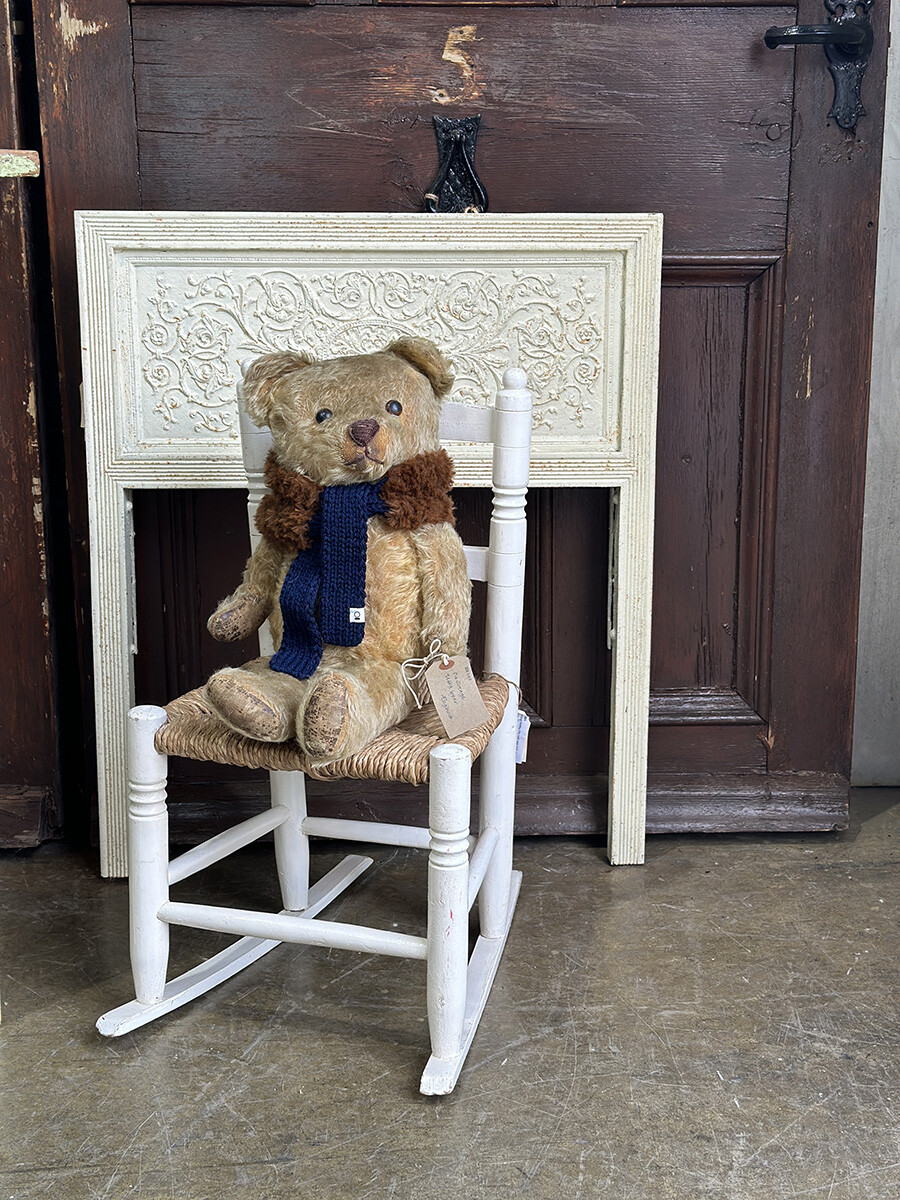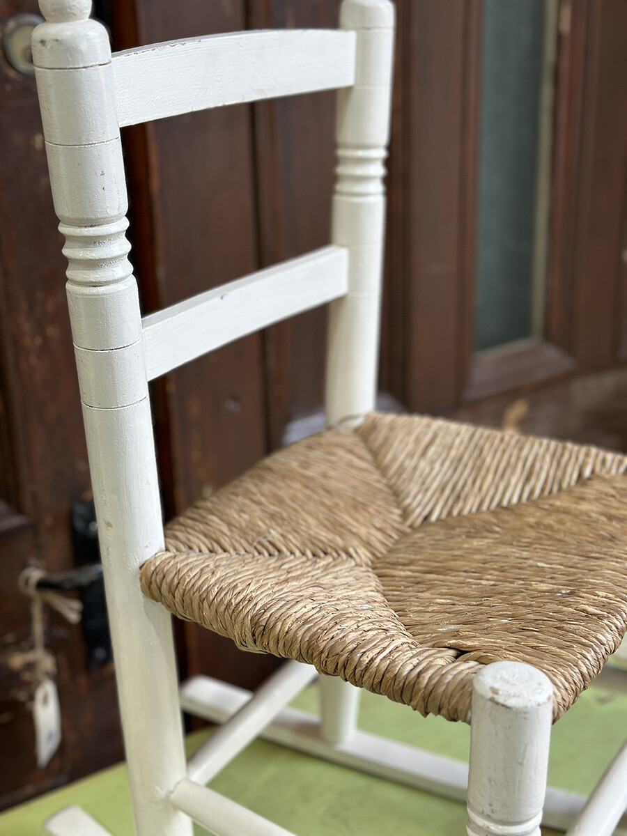 아기자기하게 귀여운 사이즈의 화이트 컬러의 빈티지 키즈 락킹 체어입니다. 의자의 형태는 락킹 체어 - 즉, 흔들의자로 제작되어 있지만 키즈 체어라는 점을 감안해서 앞뒤로 크게 흔들리지 않도록 만들어져 있습니다. 시트 부분은 러쉬(rush)라는 수변에서 자라는 식물을 수확한 후, 이를 건조-직조하여 만든 '러쉬 시트'로 제작되어 있다는 점도 특징입니다. 상대적으로 말끔한 도색 때문에 자칫 그리 오래되지 않은 체어로 보일 수 있지만, 시트에 사용된 러쉬의 종류가 골든 위트(golden wheat)인 것을 보면, 실제 제작된 시기는 최소 70년은 넘긴 것으로 추정 됩니다. 긴 세월이 흘렀으나 러쉬 시트는 매우 탄탄한 내구도를 갖고 있기 때문에 실사용이 얼마든지 가능합니다.