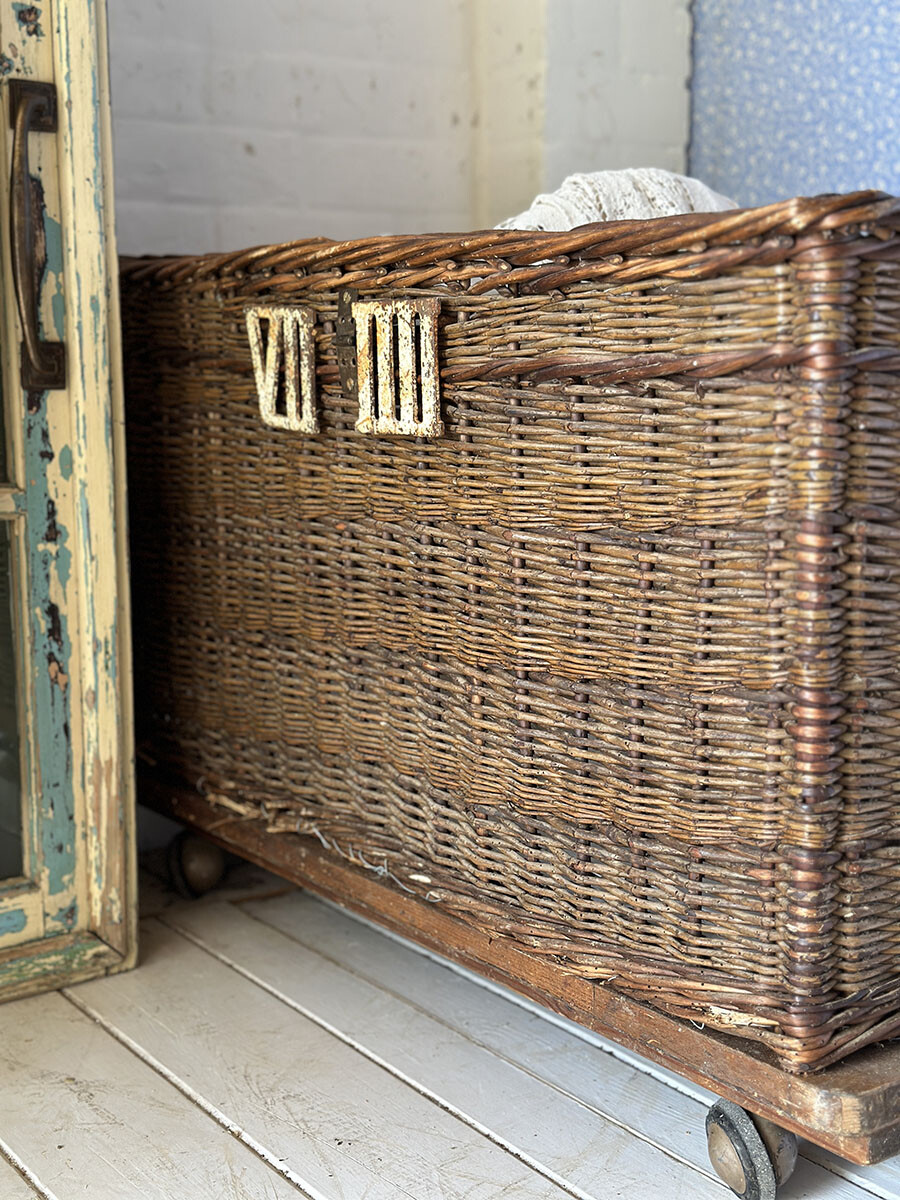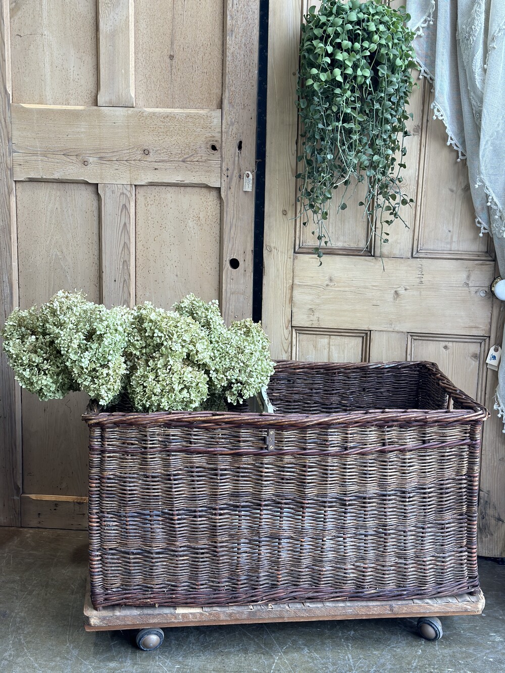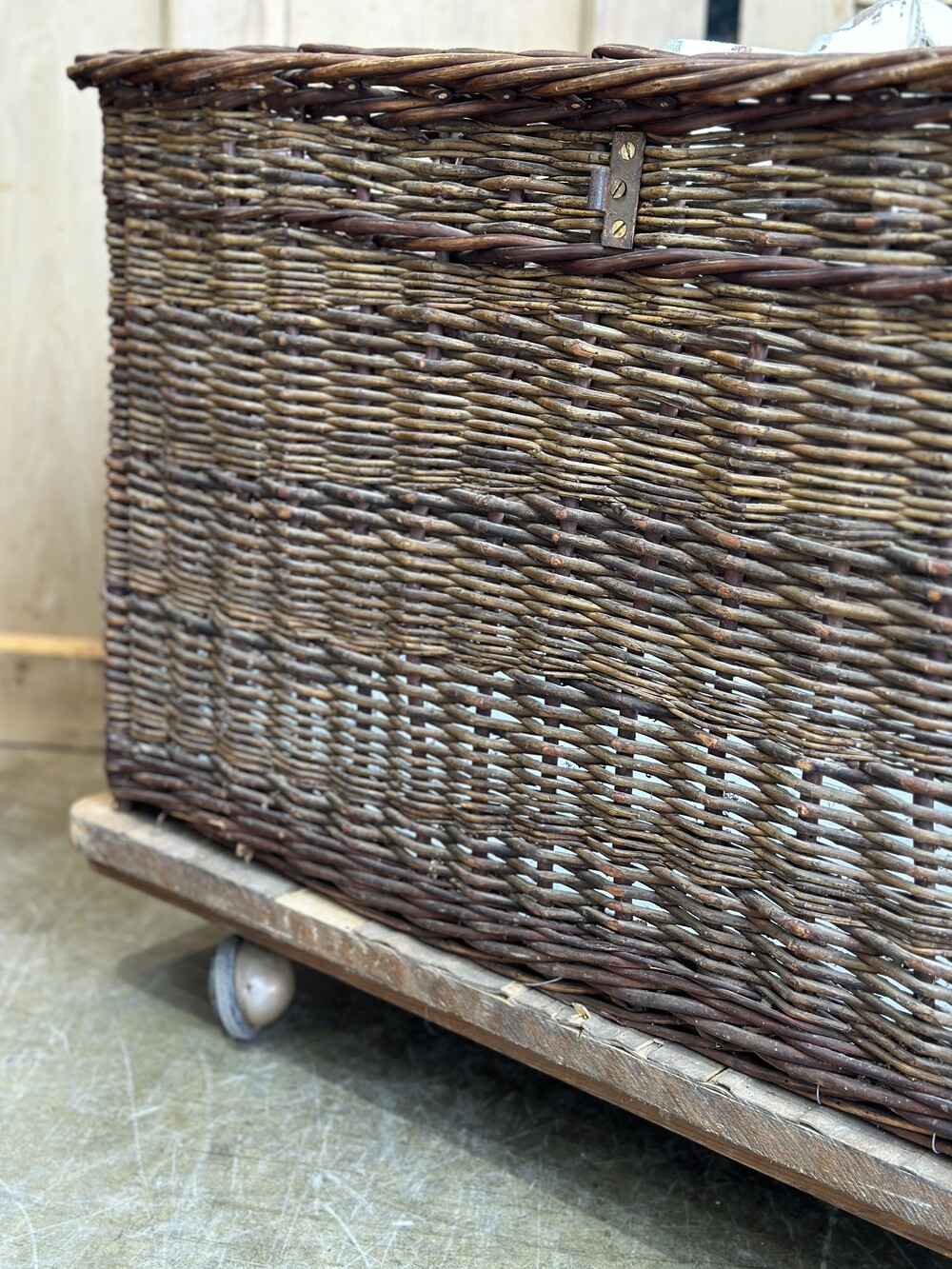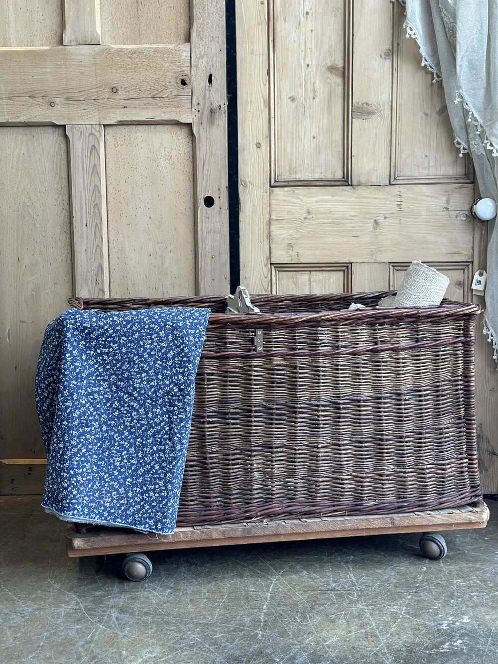 위커(wicker)로 제작된 커다란 바구니입니다. 런던의 한 상점에서 디스플레이용으로 사용되었던 것으로 꽤 커다란 크기이지만 바닥에 바퀴가 달려 있어서 이동성이 좋습니다. 다양한 상품의 디스플레이 연출용으로 사용하기에 좋습니다.
