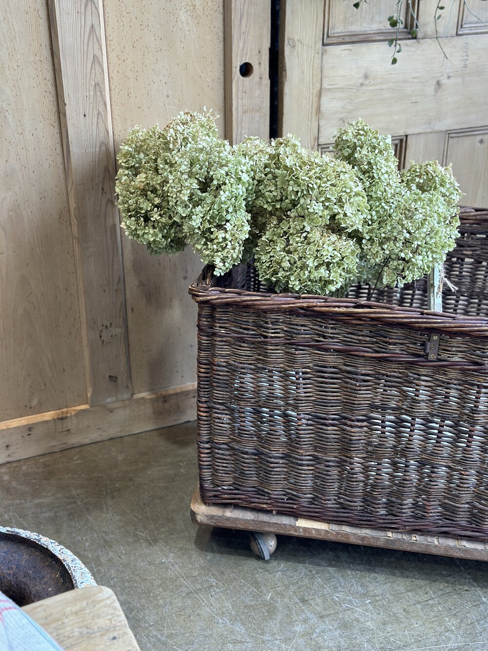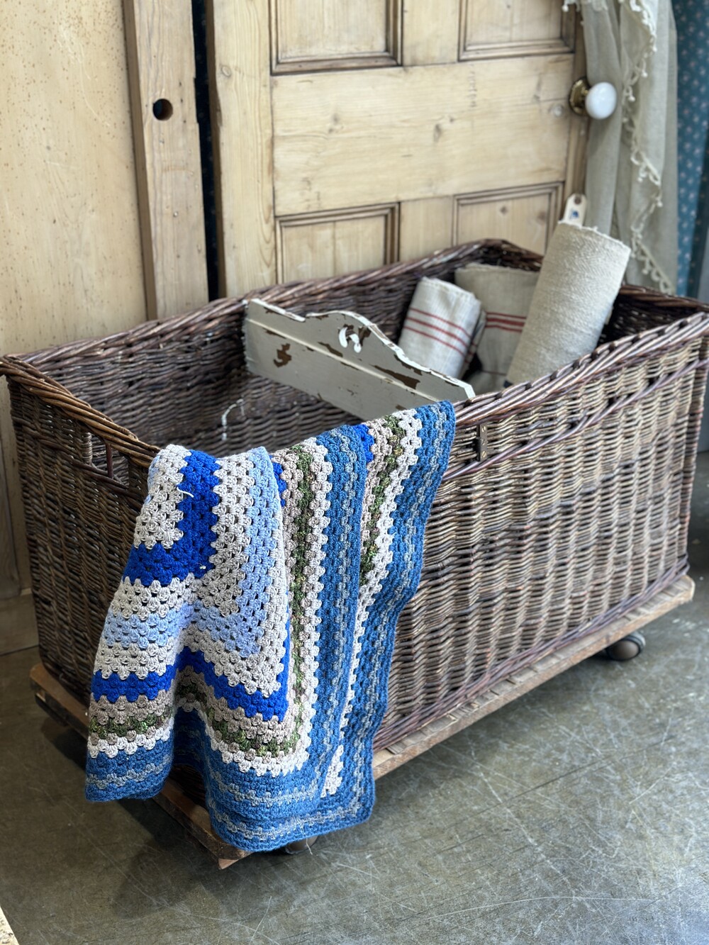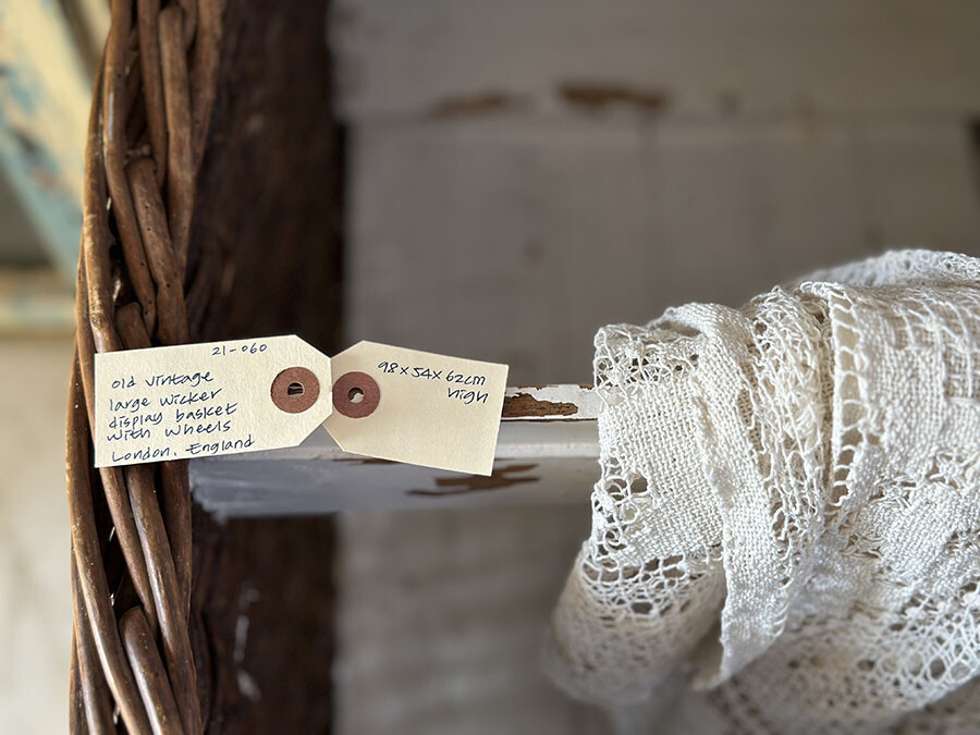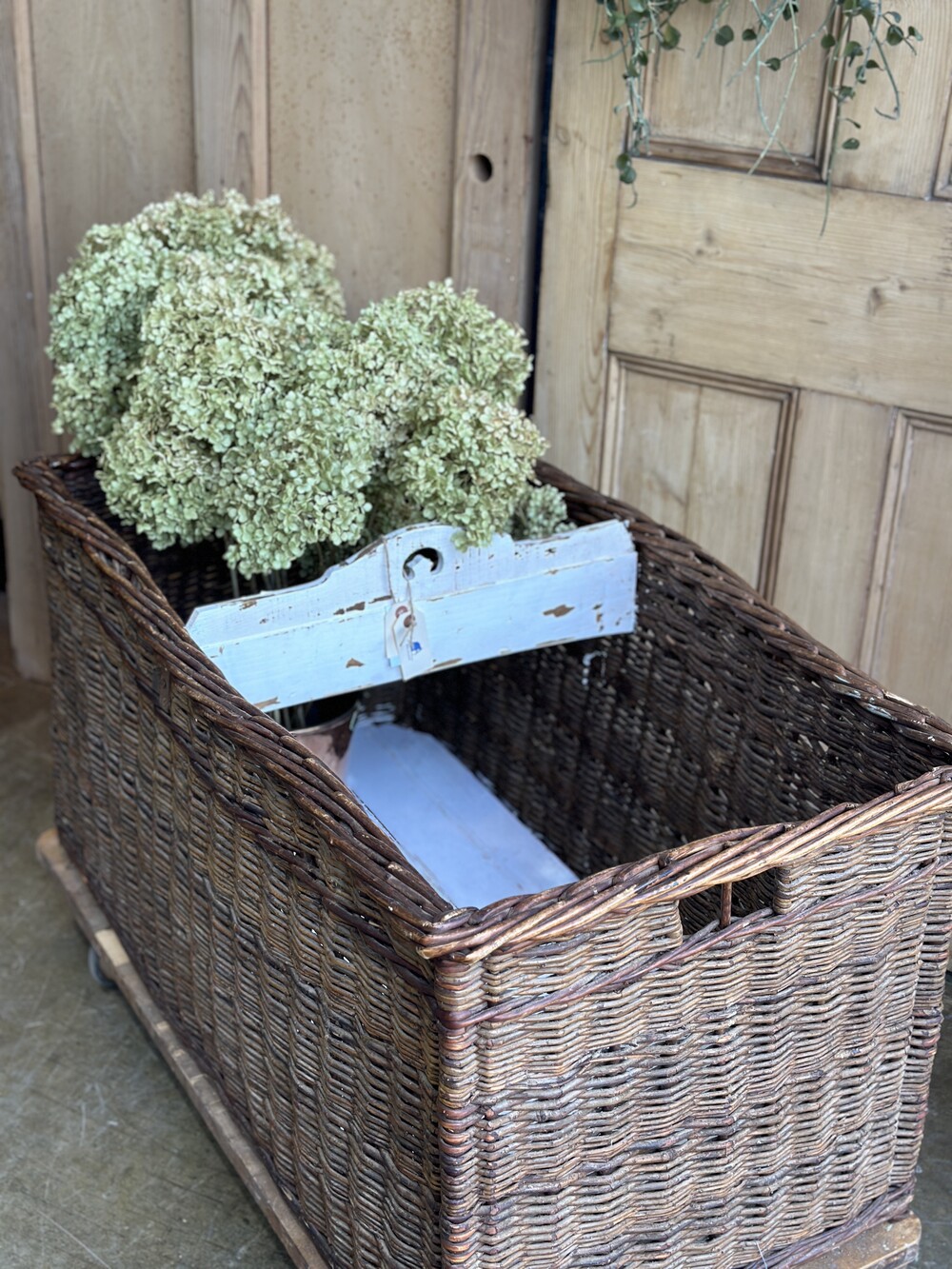 위커(wicker)로 제작된 커다란 바구니입니다. 런던의 한 상점에서 디스플레이용으로 사용되었던 것으로 꽤 커다란 크기이지만 바닥에 바퀴가 달려 있어서 이동성이 좋습니다. 다양한 상품의 디스플레이 연출용으로 사용하기에 좋습니다.