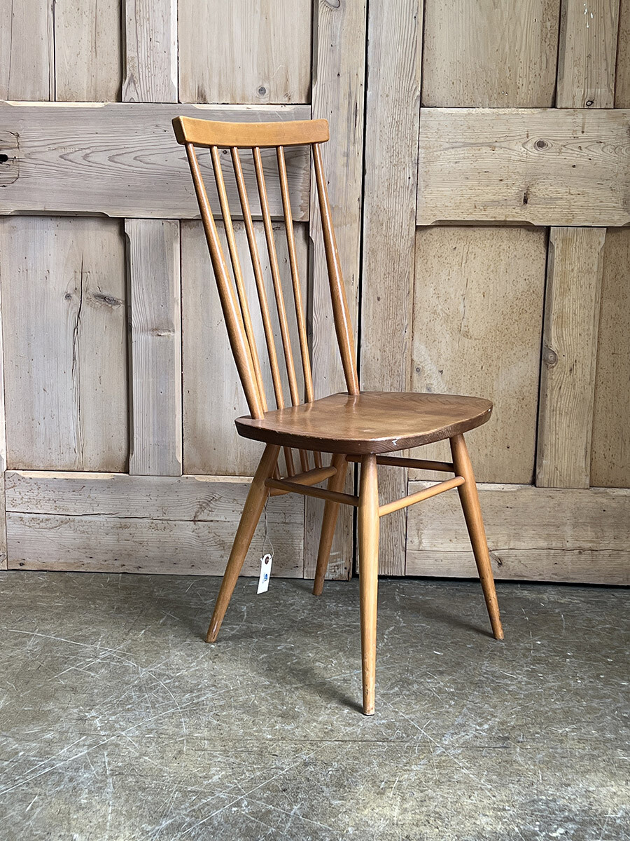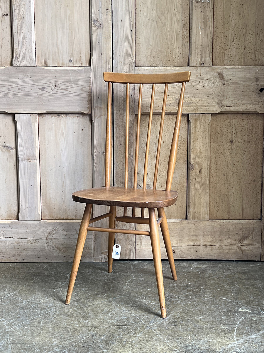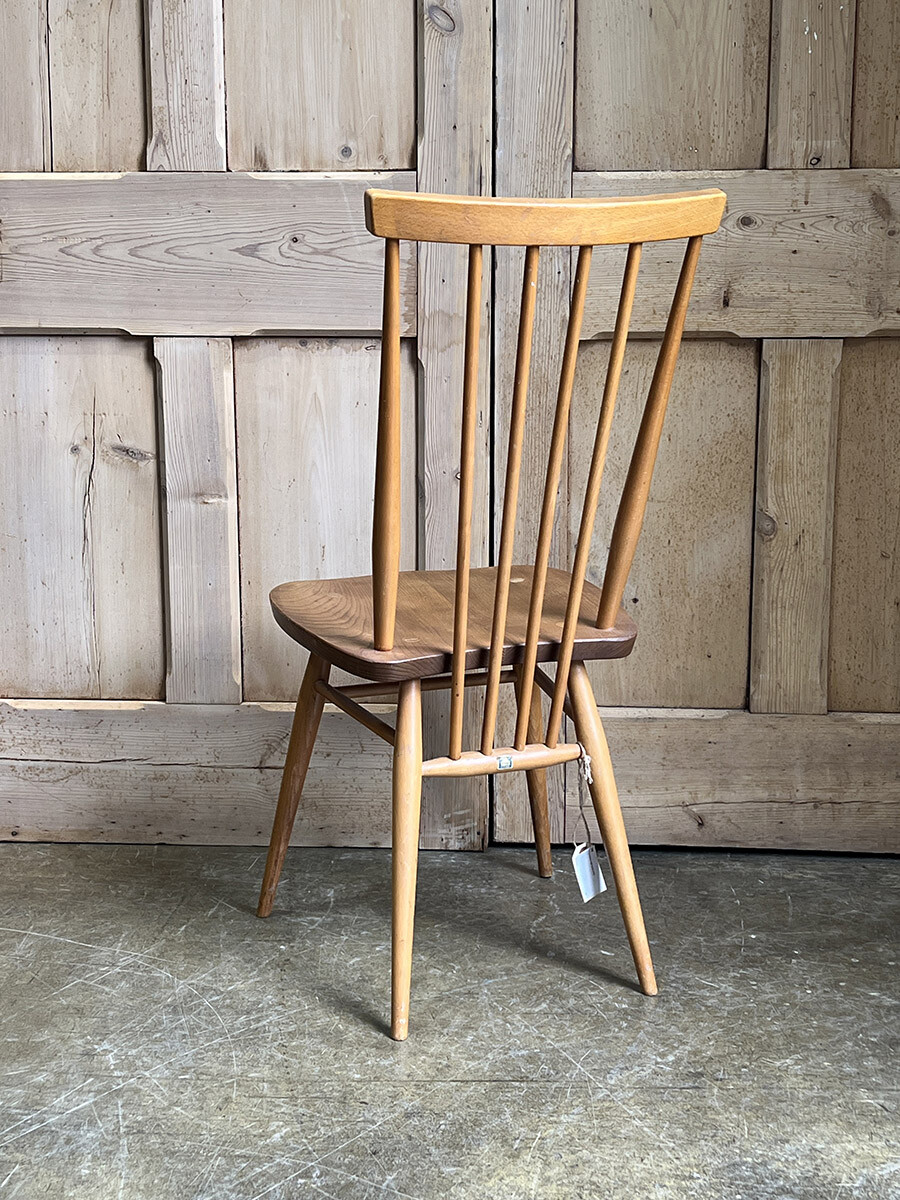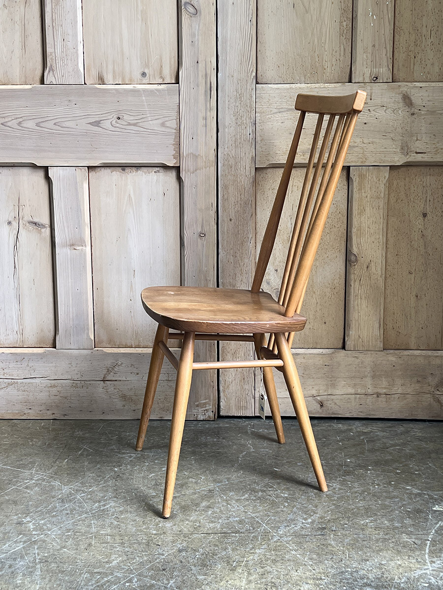 클래식한 윈저 스틱백 체어를 매우 현대적인 컨템포러리 디자인으로 변화 시킨 얼콜(ercol)의 스테디 셀링 체어입니다. 얼콜의 창업자이자 디자이너였던 루치안 R. 얼콜라니가 이 체어를 모더나이즈하면서 적용한 특이한 점이 있다면 기본적으로 클래식 윈저 체어의 구조는 모든 상부와 하부의 파츠들이 시트 부분에 심어지는 특징이 있는데, 이 올 퍼포즈 체어의 등받이의 스핀들은 시트가 아닌 하부 뒷편의 다리 사이를 잇는 스트레쳐에 심어져 있다는 것입니다. 어찌 보면 윈저 체어의 정체성이나 다름 없는 요소를 절묘하게 비틀어 놓은 것이 되었고, 덕분에 올 퍼포즈 체어는 뒷모습이 남다르게 매력적인 윈저 체어가 되었습니다. 덕분에 아예 이 체어에는 칠턴 스틱백 체어(Chiltern stickback chair)라는 별명이 붙게 되기도 했죠. 시트 모양도 다른 모델에 비해 사각형에 더 가깝게 변형이 되어 있는 점도 특징입니다. 체어에 사용된 수종은 시트 부분이 엘름(elm), 나머지 파츠들은 애쉬(ash), 비치(beech)가 사용되었습니다.
