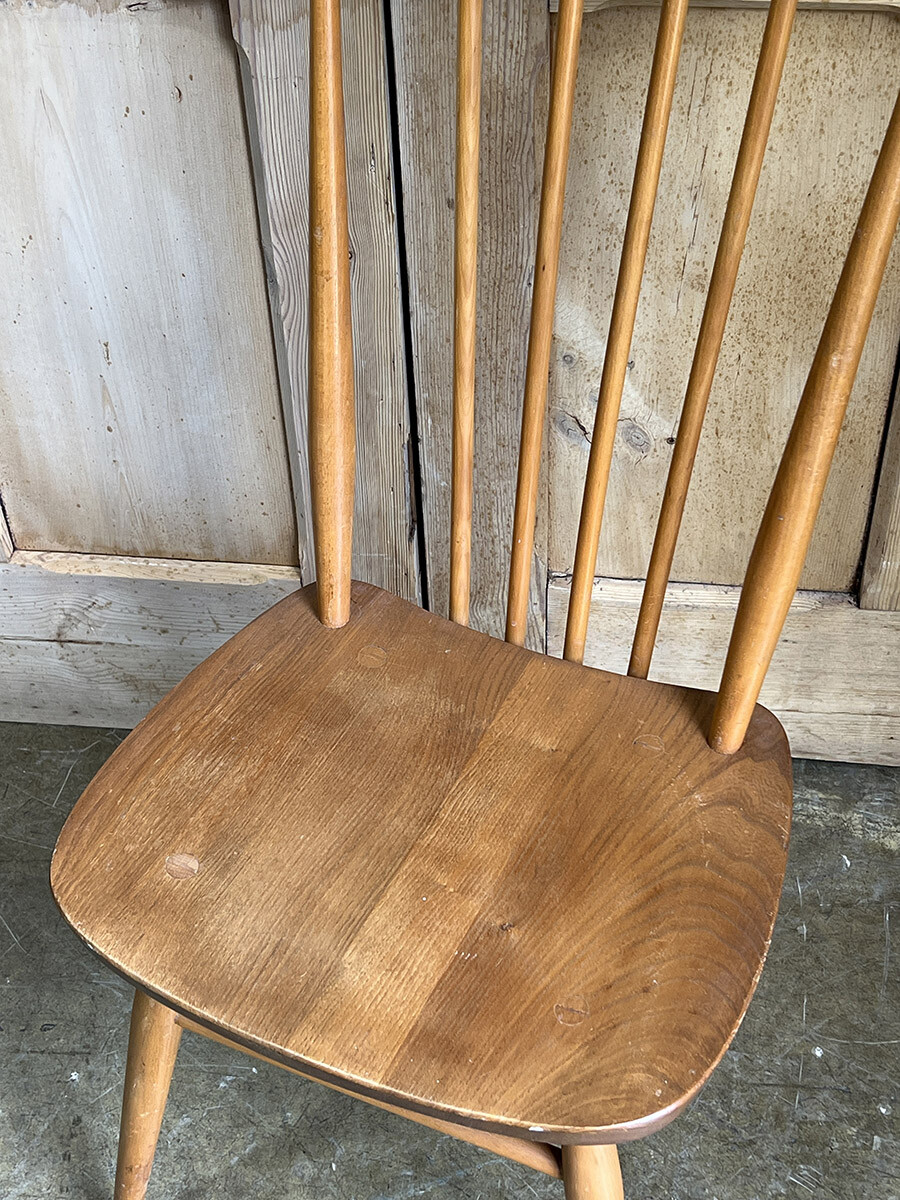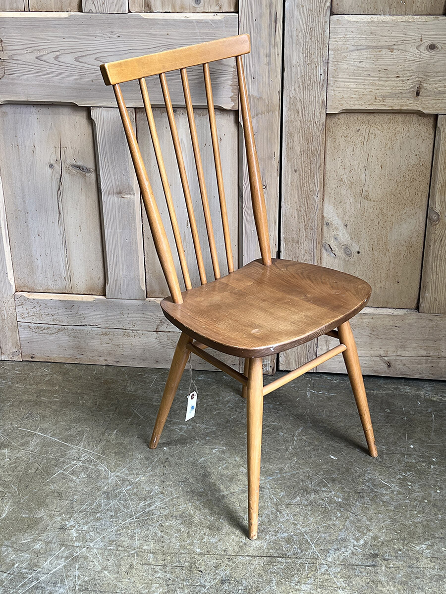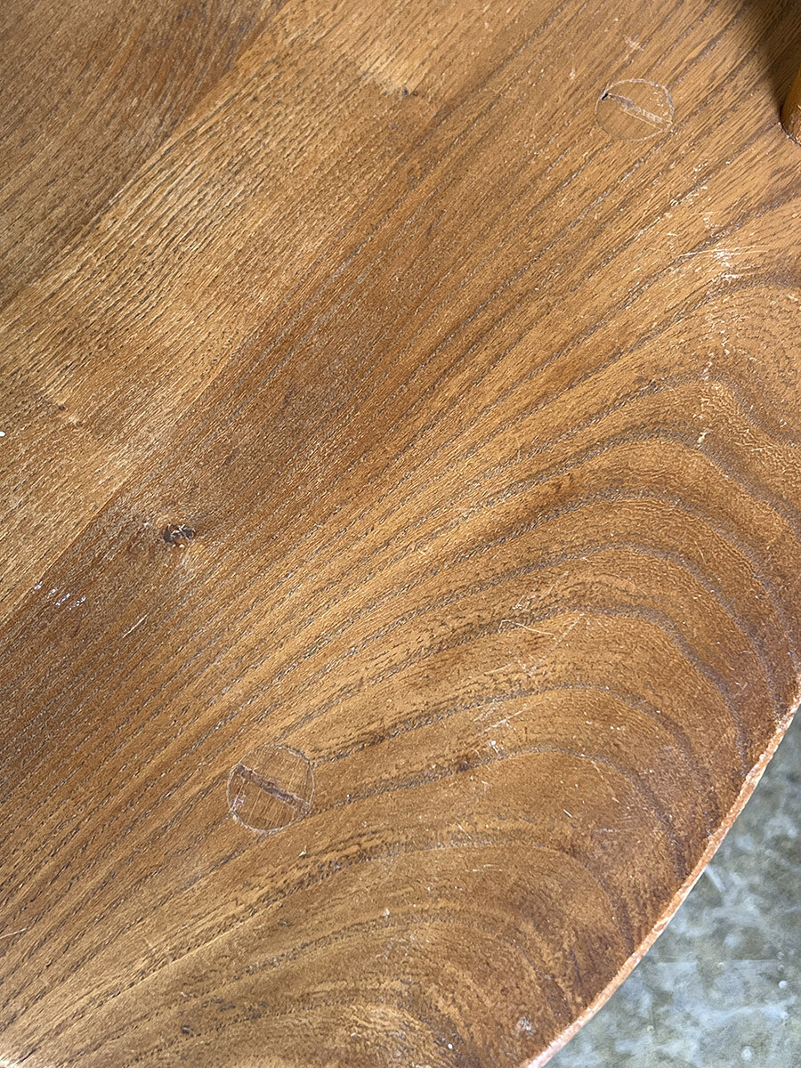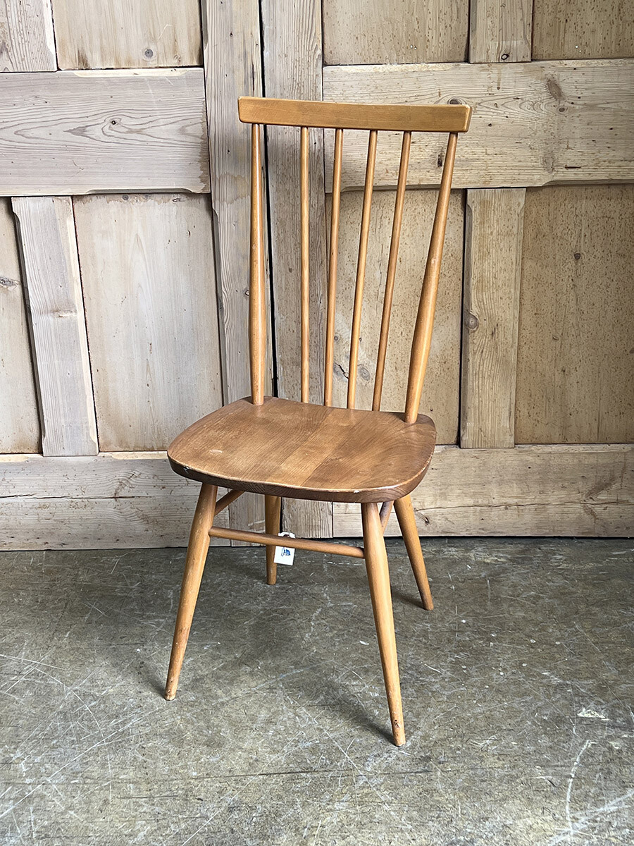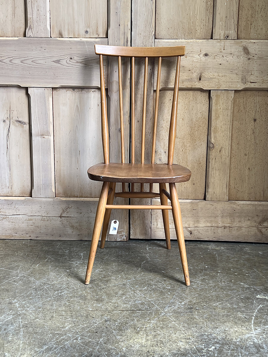 클래식한 윈저 스틱백 체어를 매우 현대적인 컨템포러리 디자인으로 변화 시킨 얼콜(ercol)의 스테디 셀링 체어입니다. 얼콜의 창업자이자 디자이너였던 루치안 R. 얼콜라니가 이 체어를 모더나이즈하면서 적용한 특이한 점이 있다면 기본적으로 클래식 윈저 체어의 구조는 모든 상부와 하부의 파츠들이 시트 부분에 심어지는 특징이 있는데, 이 올 퍼포즈 체어의 등받이의 스핀들은 시트가 아닌 하부 뒷편의 다리 사이를 잇는 스트레쳐에 심어져 있다는 것입니다. 어찌 보면 윈저 체어의 정체성이나 다름 없는 요소를 절묘하게 비틀어 놓은 것이 되었고, 덕분에 올 퍼포즈 체어는 뒷모습이 남다르게 매력적인 윈저 체어가 되었습니다. 덕분에 아예 이 체어에는 칠턴 스틱백 체어(Chiltern stickback chair)라는 별명이 붙게 되기도 했죠. 시트 모양도 다른 모델에 비해 사각형에 더 가깝게 변형이 되어 있는 점도 특징입니다. 체어에 사용된 수종은 시트 부분이 엘름(elm), 나머지 파츠들은 애쉬(ash), 비치(beech)가 사용되었습니다.