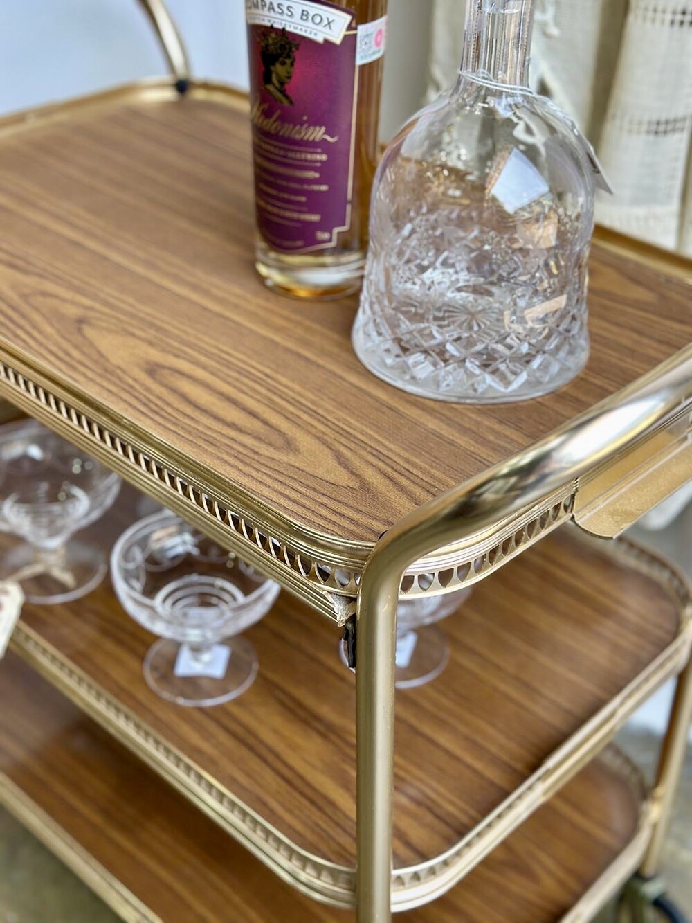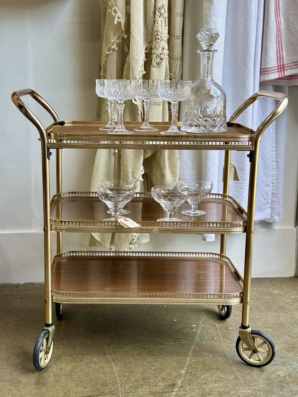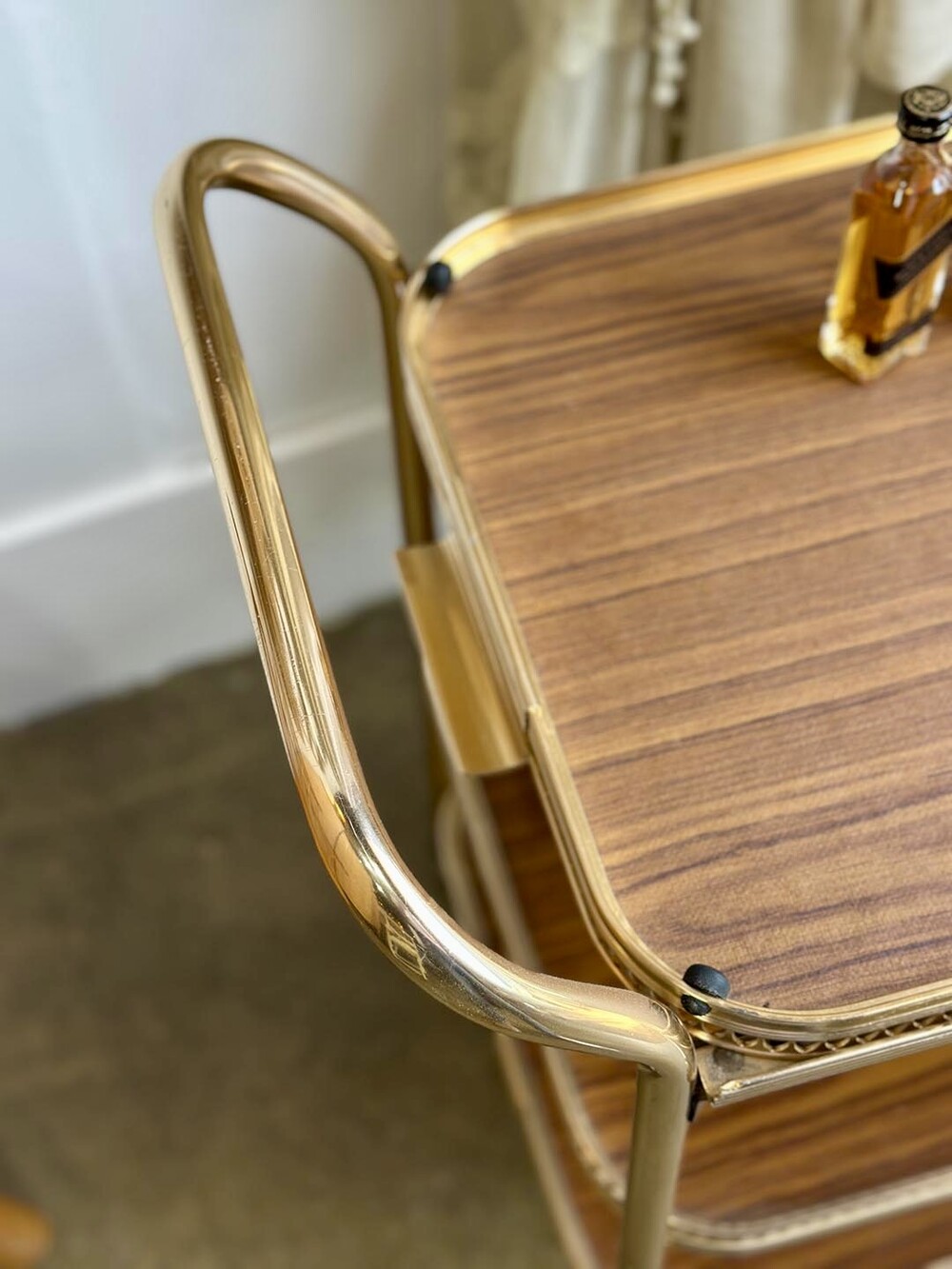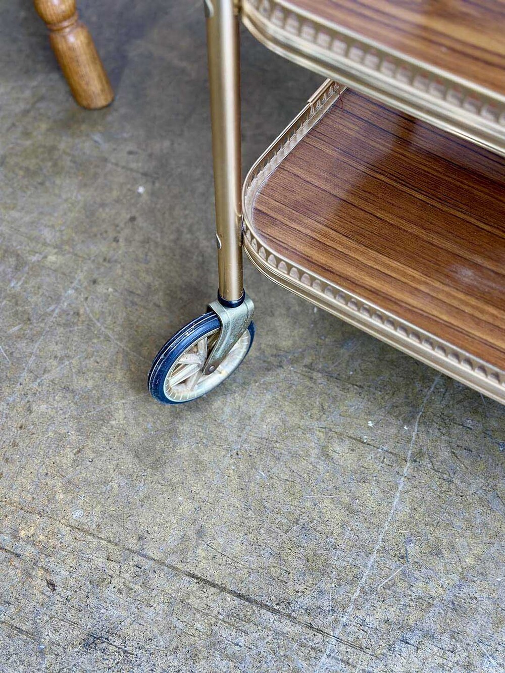 3단 트레이로 구성된 드링크 서빙 트롤리입니다. 1900년대 초반의 아르데코 뉘앙스가 남아 있는 미드-센츄리 모던 시대에 제작된 이 서빙 트롤리는, 중산층의 가정마다 홈 바(home bar)를 갖추던 유행이었던 1960년대에 제작되었습니다. 골드 컬러를 분체도장한 알루미늄 바디는 가볍고, 골드와 블랙의 컬러가 조화로운 바퀴는 고무로 덧대어 조용하게 미끄러집니다. 트레이는 각각 분리가 되어 따로 사용할 수도 있어 매우 실용적입니다.