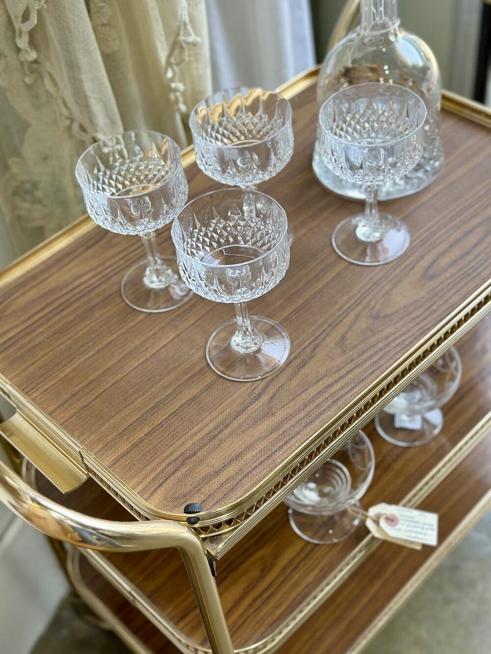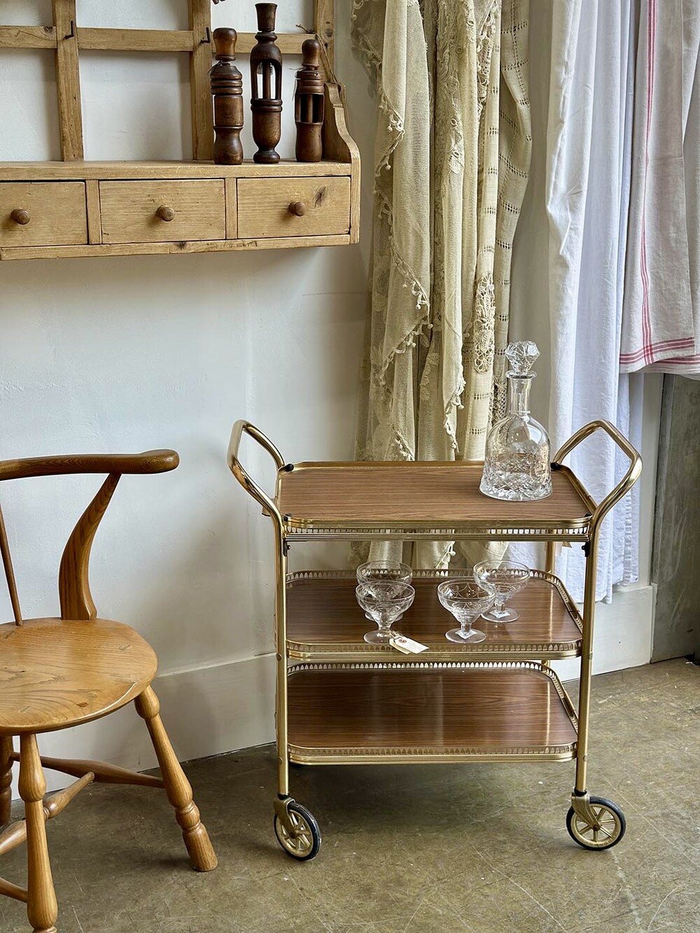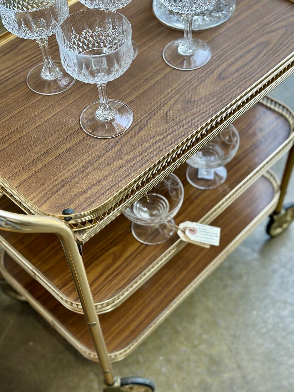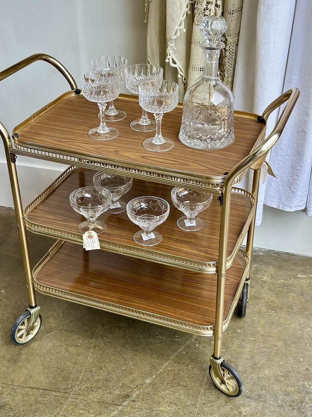 3단 트레이로 구성된 드링크 서빙 트롤리입니다. 1900년대 초반의 아르데코 뉘앙스가 남아 있는 미드-센츄리 모던 시대에 제작된 이 서빙 트롤리는, 중산층의 가정마다 홈 바(home bar)를 갖추던 유행이었던 1960년대에 제작되었습니다. 골드 컬러를 분체도장한 알루미늄 바디는 가볍고, 골드와 블랙의 컬러가 조화로운 바퀴는 고무로 덧대어 조용하게 미끄러집니다. 트레이는 각각 분리가 되어 따로 사용할 수도 있어 매우 실용적입니다.