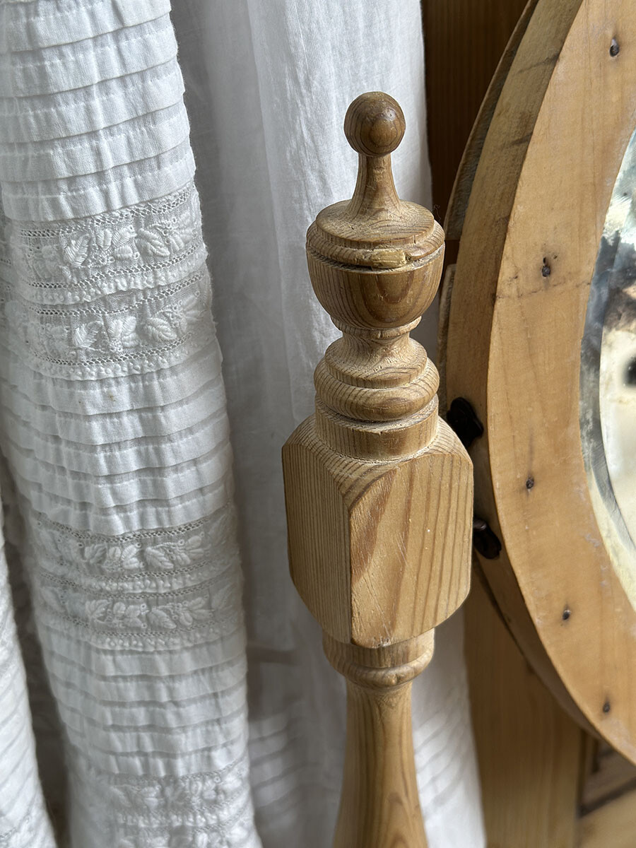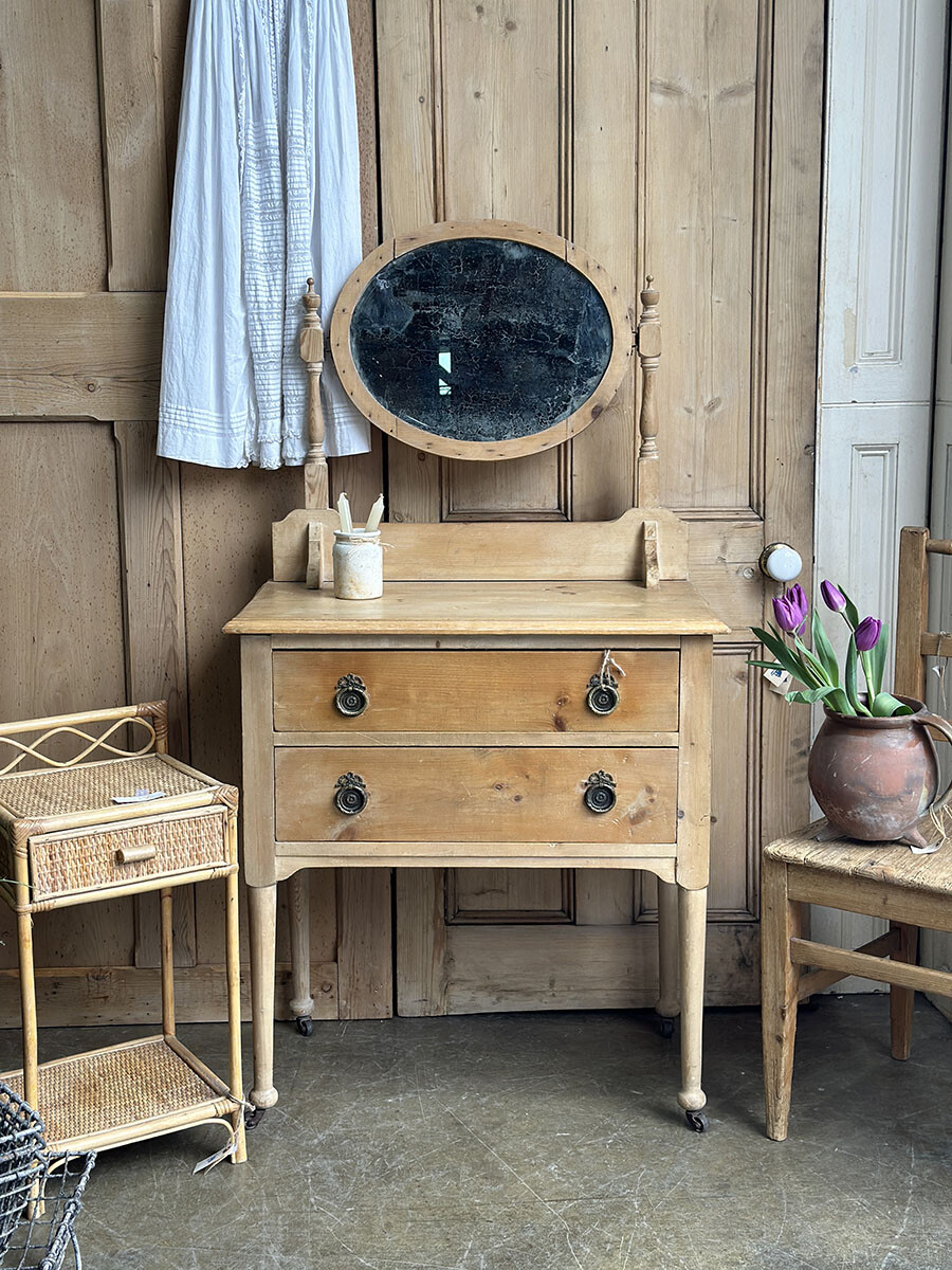 빈티지 파인 소재의 드레싱 테이블(dressing table ; 화장대)입니다. 리젠시 스타일에 영향을 크게 받은 아담한 사이즈의 볼륨 덕분에 여성적인 장식미가 느껴지는 아이템입니다. 하부 베이스는 2단 서랍장이 길게 원형 테이퍼드 터닝 레그로 제작되어서 개방감도 느껴집니다. 다리에는 주물로 된 카스트 아이언 휠이 달려 있어서 이동하기에도 편리한 편입니다. 타원 형태의 거울은 각도 조정이 가능한 스위블 타입으로 장착되어 있습니다. 거울 부분에 빈티지 미러 특유의 파티나가 형성되어 있어서 러스틱한 느낌을 원하시는 분들께서는 더욱 선호하실만한 타입입니다.