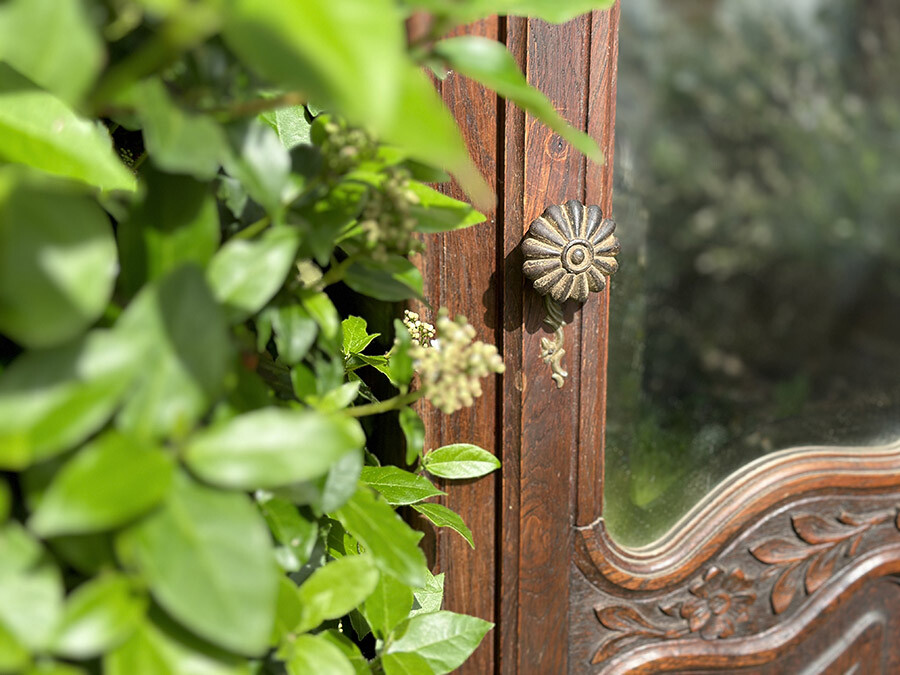 오크(oak ; 참나무)와 파인(pine ; 소나무) 두 가지의 원목으로 제작된 프렌치 워드로브입니다. 이 워드로브는 리젠시 스타일로 제작되었는데, 둥근 지붕같은 머리에 식물과 꽃 장식, 도어에는 곡선의 몰딩과 측면에는 직선 형태의 디자인이 반영되어 있습니다. 도어는 탈착이 가능한 디테쳐블 도어로 제작되어 있으며 두 개의 긴 거울이 달려 있습니다. 다리는 캐브리올 형태의 다리를 갖고 있는데, 하부 다리와 패널의 장식에도 꽤 많은 공을 들였음을 볼 수 있습니다. 내부에는 3개의 쉘프 패널이 있는데 분리와 위치 조정이 가능하여 다양한 높이로 사용이 가능합니다. 본 가구의 수종은 가구 전면부와 측면, 장식적인 부분에는 오크가 사용되었으며 내부면과 후면에는 파인 원목이 사용 되었습니다.