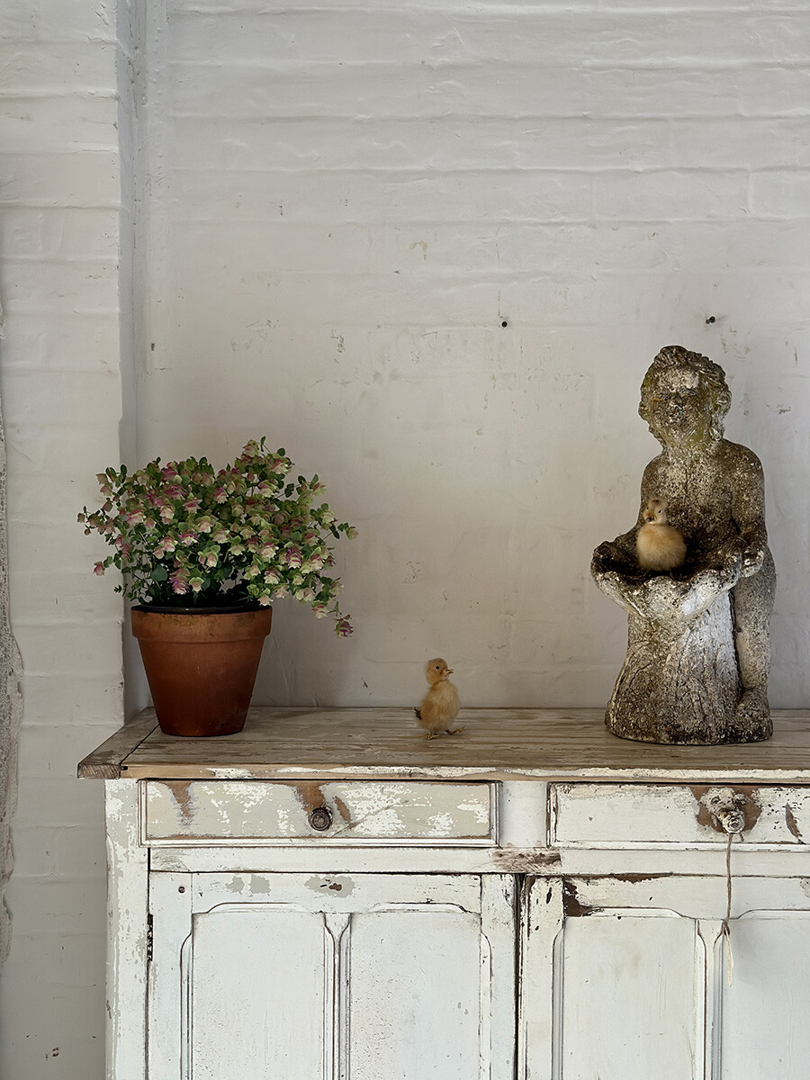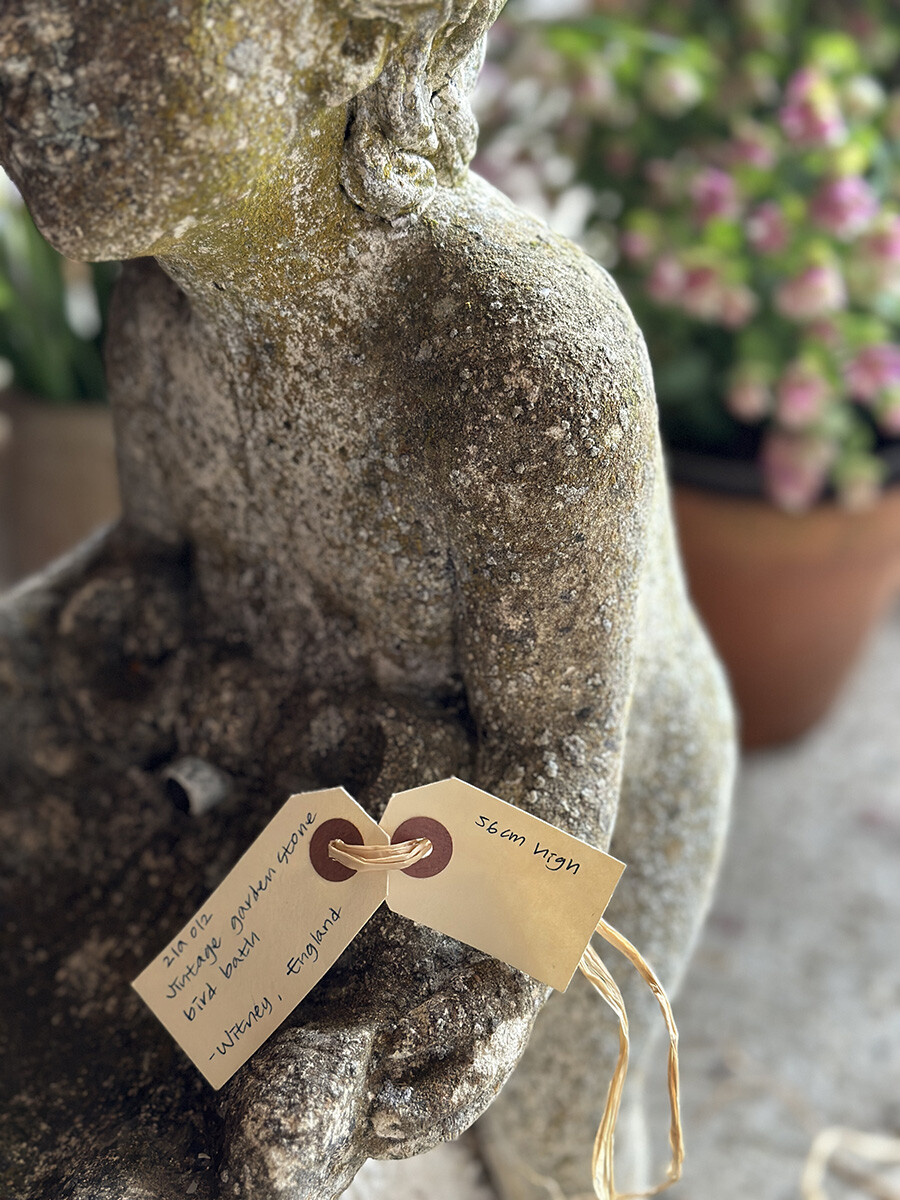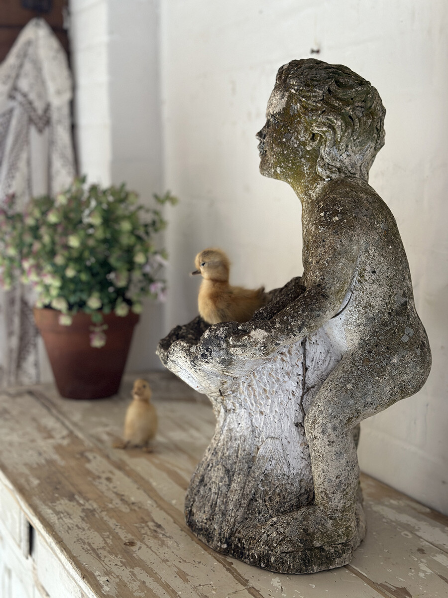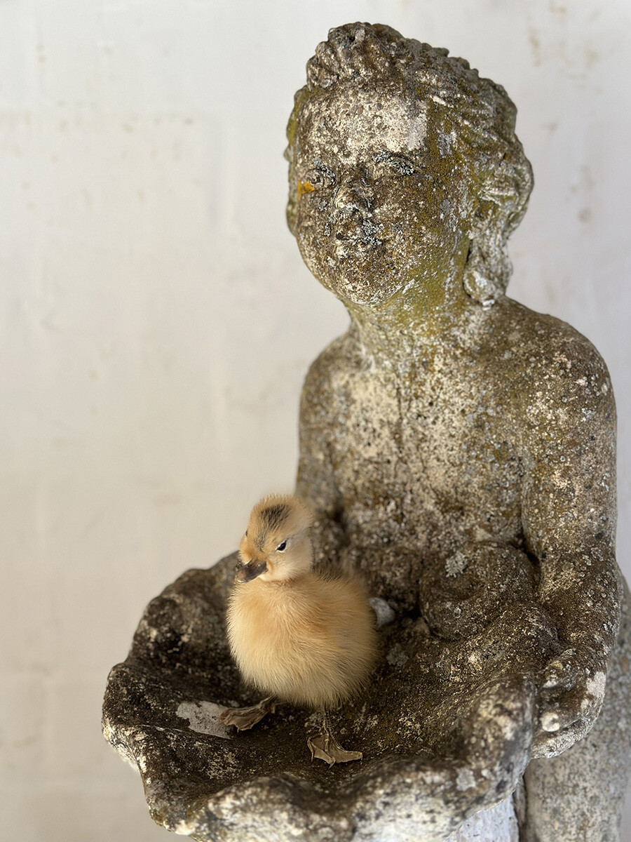 아담한 크기의 가든 스톤 버드 바스입니다. 버드 바스(bird bath)는 정원에서 빗물이나 인위적으로 물을 담아 두고 새들이 날아와 물도 마시고, 목욕도 할 수 있도록 하는 장치를 말합니다. 버드 바스가 있고, 없고에 따라 새들이 날아와주는 빈도가 전혀 달라지기 때문에 서양권에서는 지금까지도 거의 필수품인 가든 아이템으로 사랑 받고 있습니다. 해당 상품은 아기 천사가 가리비 모양의 조개 껍질을 들고 있는 모양의 버드 바스로, 아래 사진에서 병아리가 담겨져 있는 부분에 작게 물이 담길 수 있도록 만들어져 있습니다.