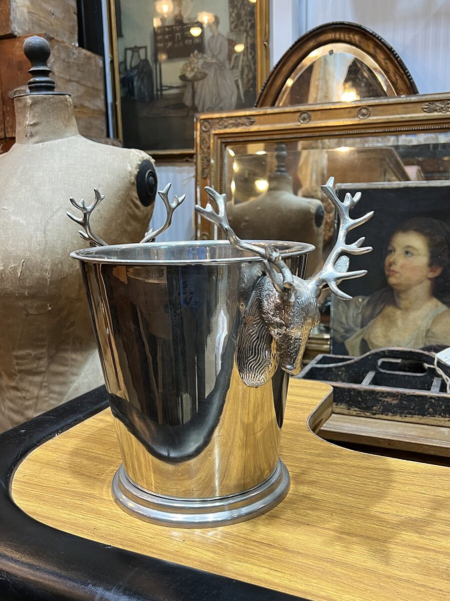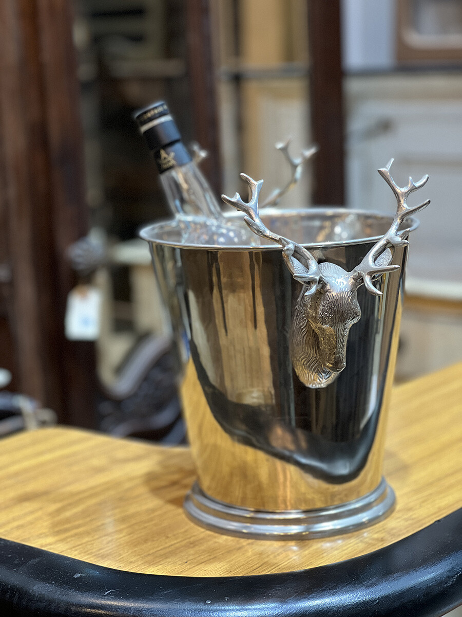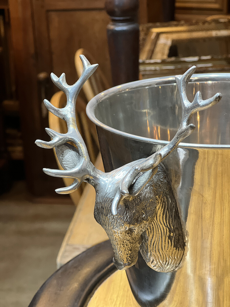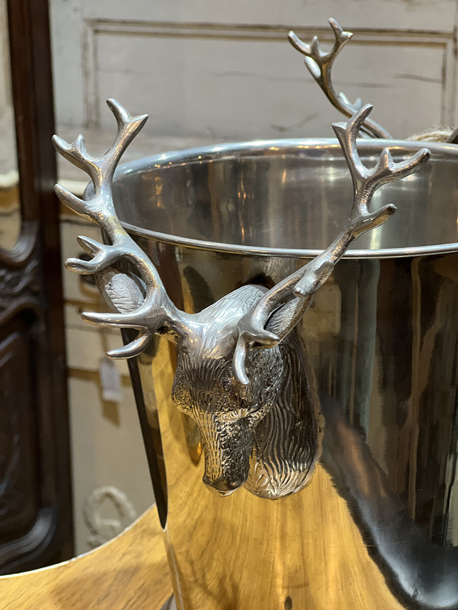 핸들 부분에 묵직한 사슴 장식이 달려 있는 빈티지 와인 칠러입니다. 소재는 스테인레스로 제작되어 있습니다. 스탠다드 사이즈의 와인 2병 정도를 동시에 칠링할 수 있는 사이즈입니다.