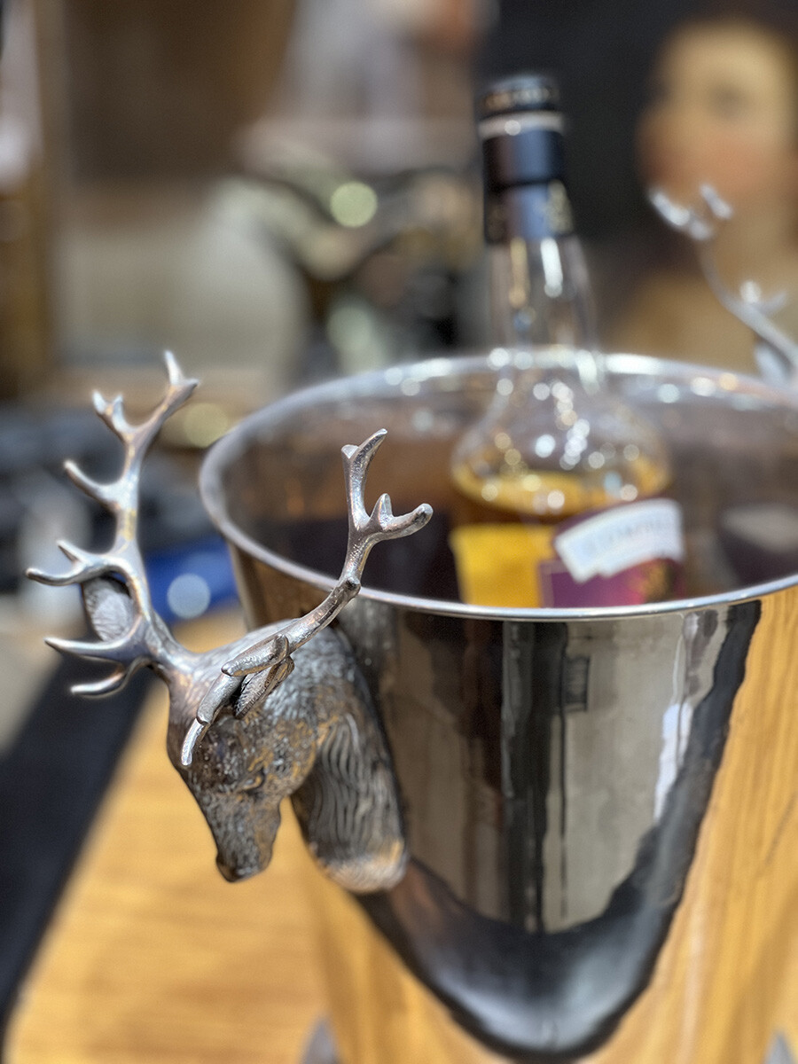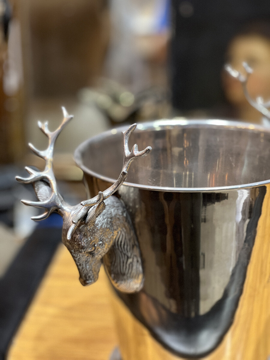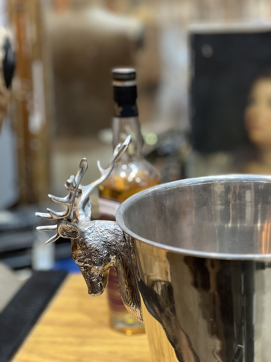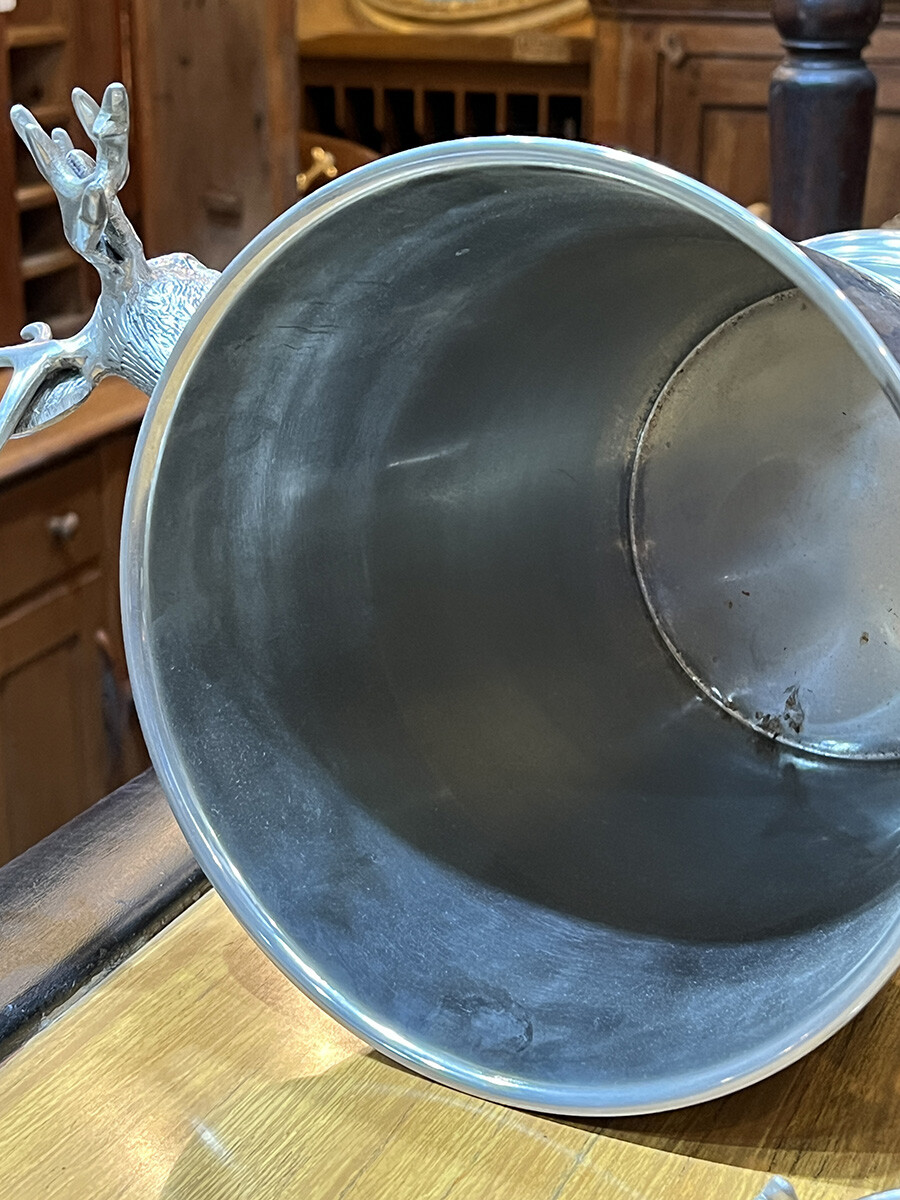 핸들 부분에 묵직한 사슴 장식이 달려 있는 빈티지 와인 칠러입니다. 소재는 스테인레스로 제작되어 있습니다. 스탠다드 사이즈의 와인 2병 정도를 동시에 칠링할 수 있는 사이즈입니다.