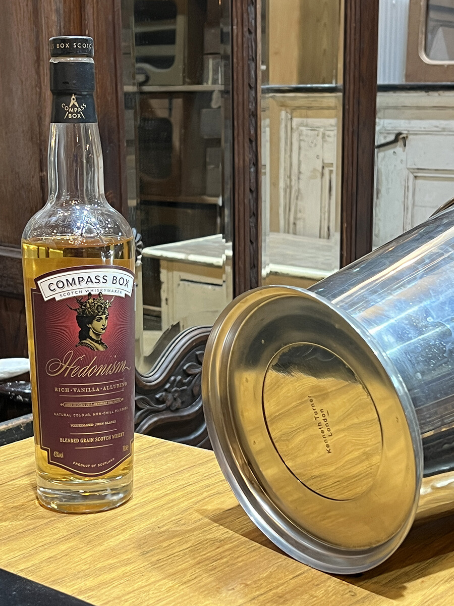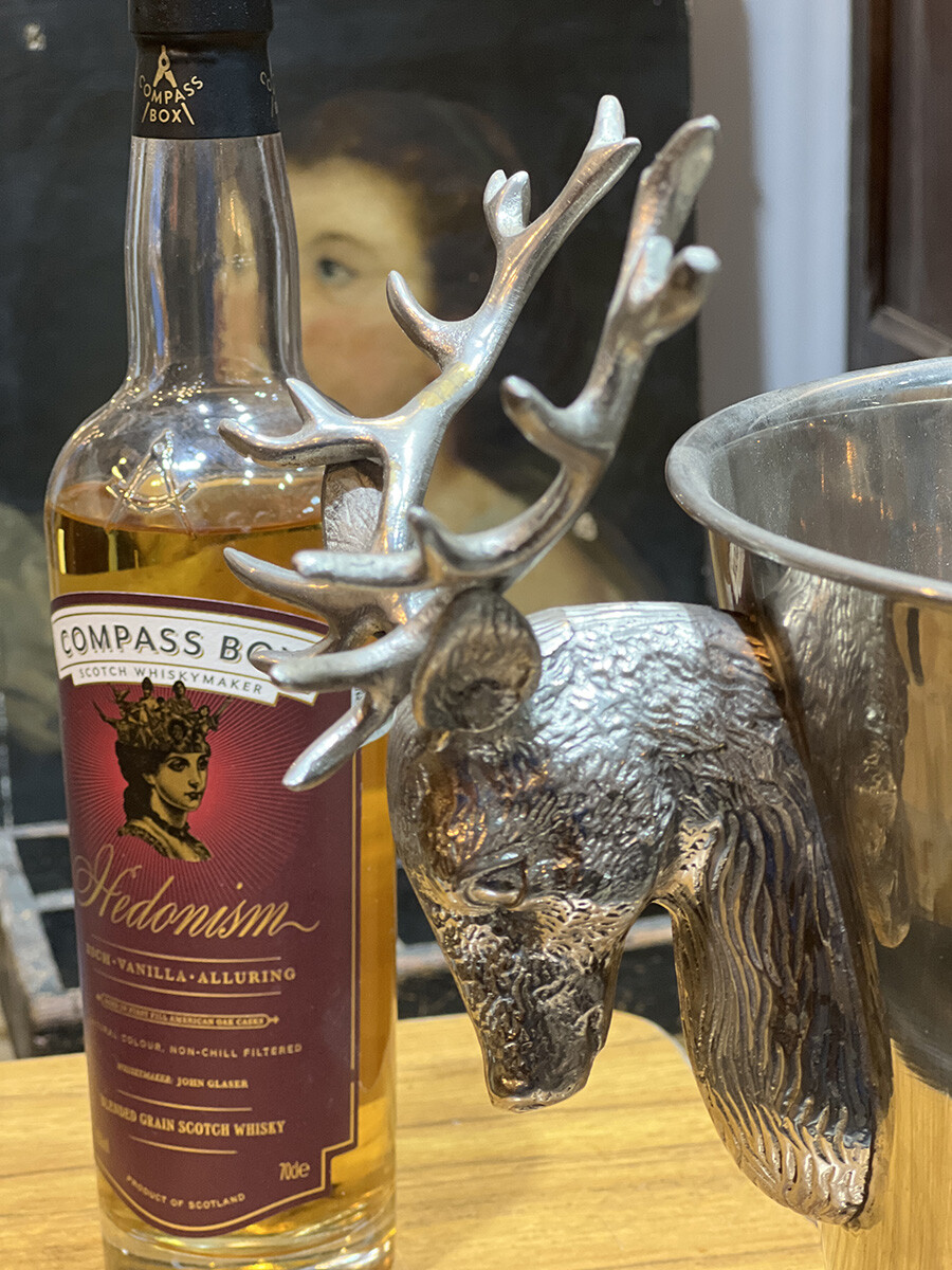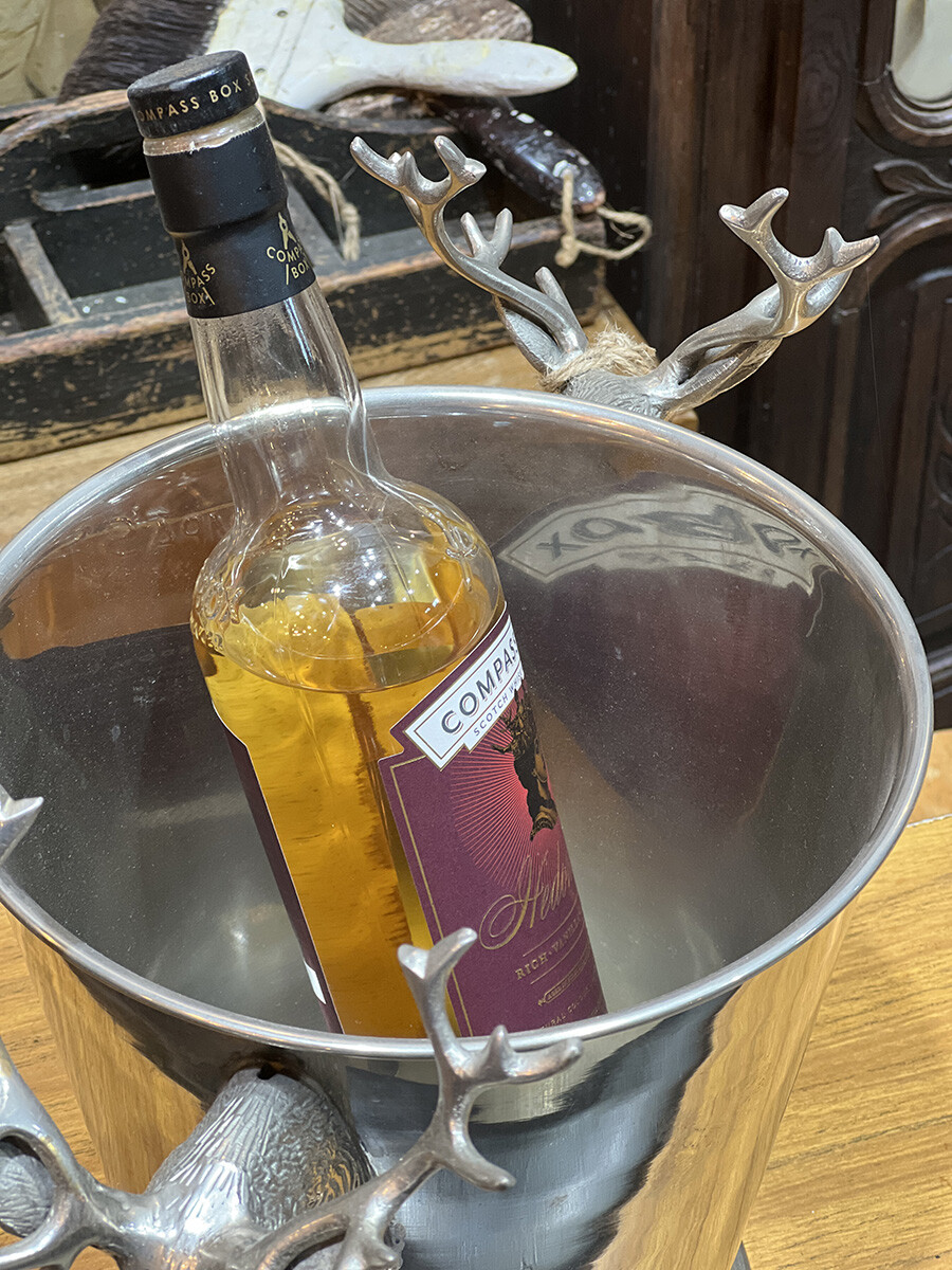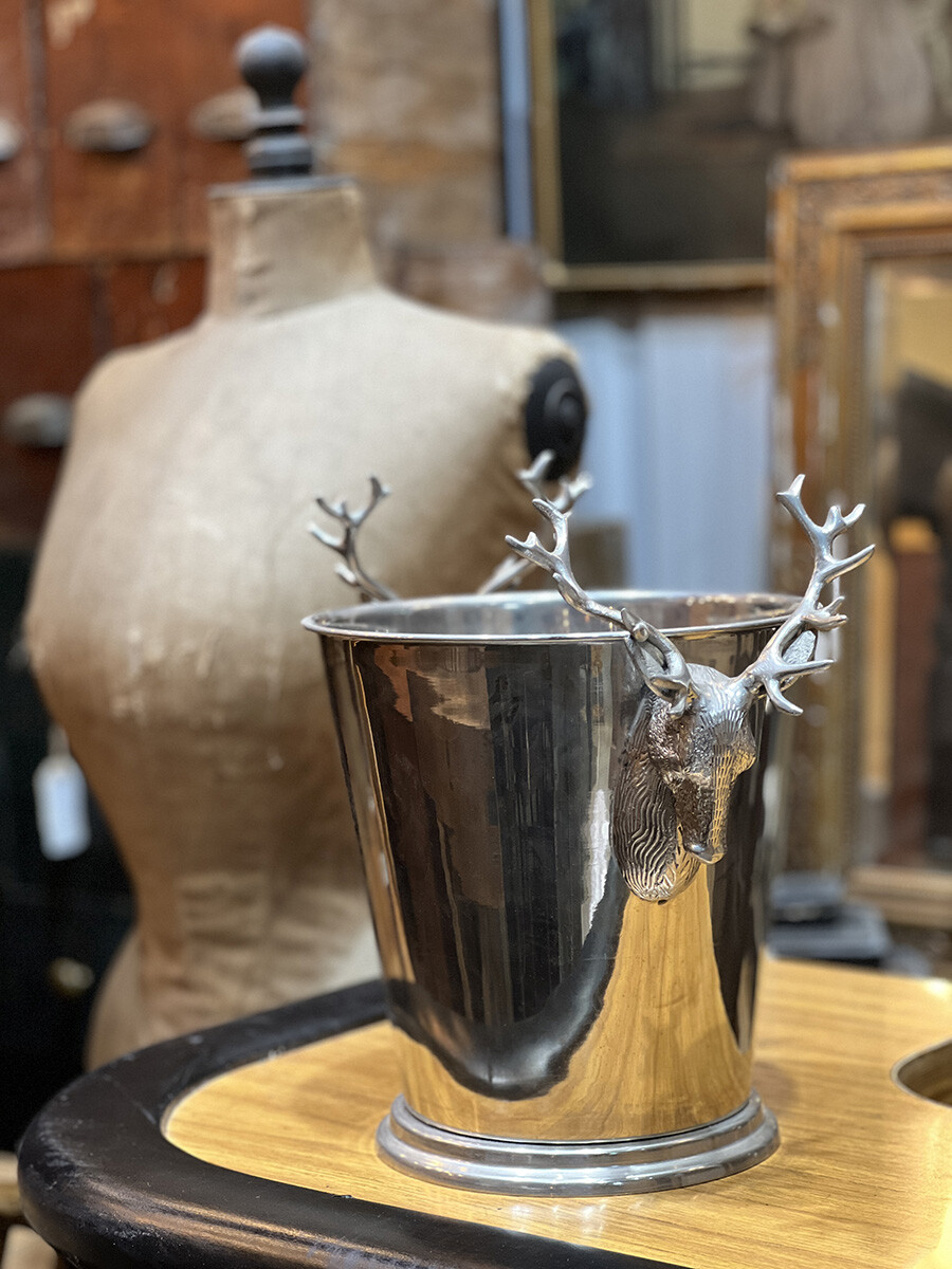 핸들 부분에 묵직한 사슴 장식이 달려 있는 빈티지 와인 칠러입니다. 소재는 스테인레스로 제작되어 있습니다. 스탠다드 사이즈의 와인 2병 정도를 동시에 칠링할 수 있는 사이즈입니다.
