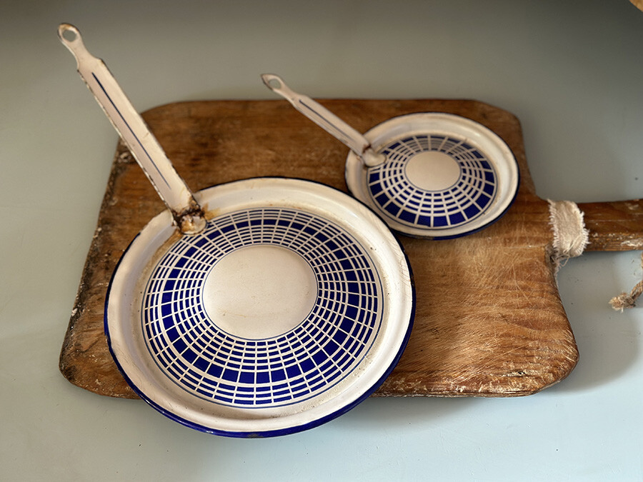 프렌치 빈티지 에나멜(법랑) 소재의 리드 2종입니다. 보통 이렇게 자체 손잡이가 달려 있는 리드(lid ; 덮개 혹은 뚜껑)는 냄비나 솥에 딸려 있는 것이 아니라, 사이즈가 맞는 다양한 곳에 덮개로 쓸 수 있도록 전용으로 만든 것입니다. 사이즈는 라지 사이즈와 스몰 사이즈 2종으로 나뉘어 있습니다. 조형 비율이 좋아 다양한 디스플레이 연출에 유용한 소품입니다. 프랑스에서 제작된 에나멜 용기들은 타 유럽 국가들에 비해서 경쾌하거나 색채가 강한 면이 있는데, 본 상품 역시 그러합니다. 에나멜(enamel ; 법랑) 소재에 대한 자세한 내용이 궁금하시다면, 사진들 아래에 관련 아티클 링크를 걸어 두었으니 한 번 읽어보시면 좋을 듯 합니다.