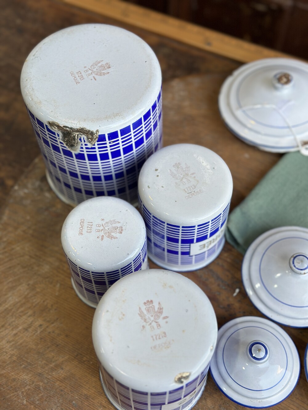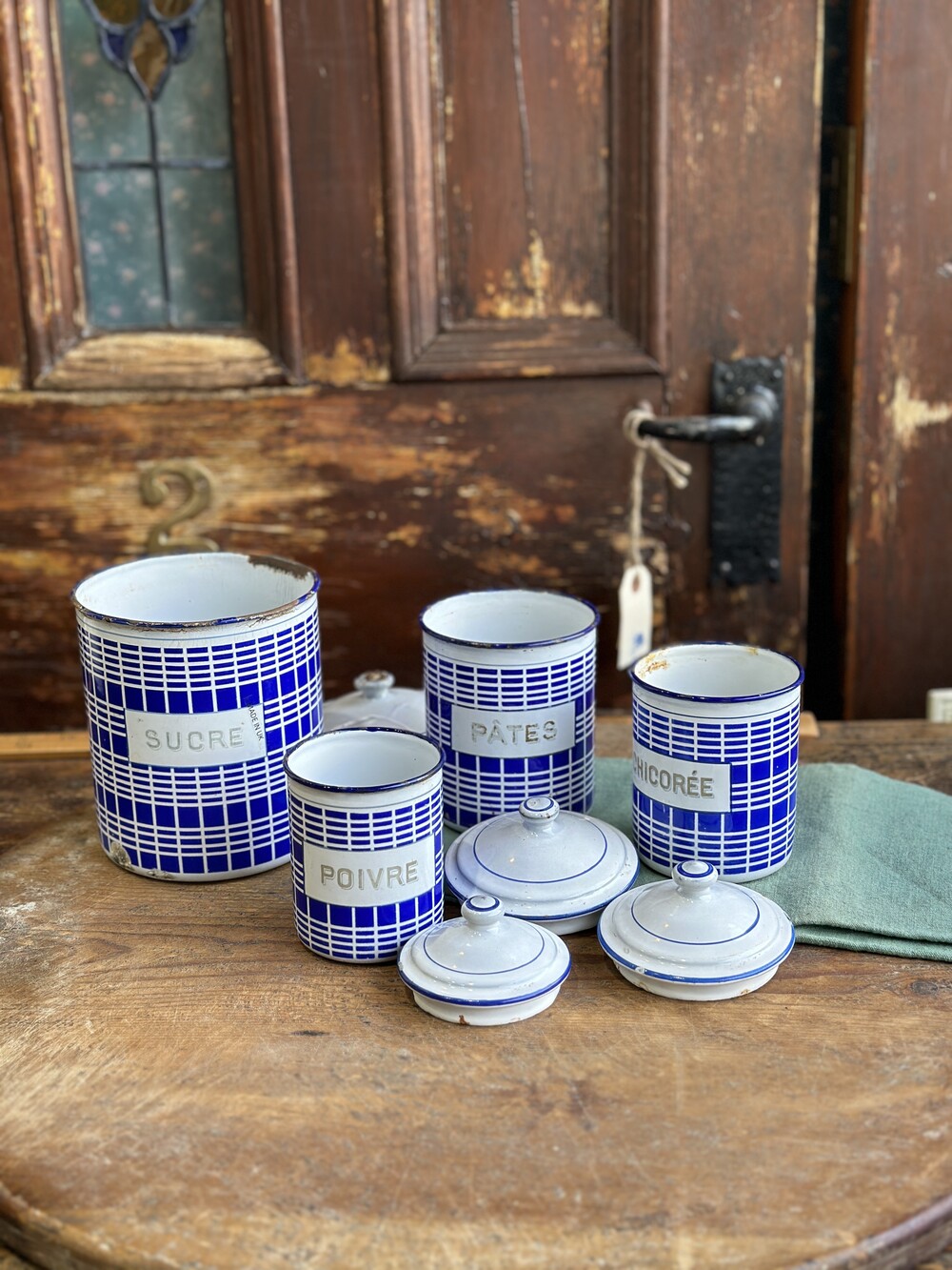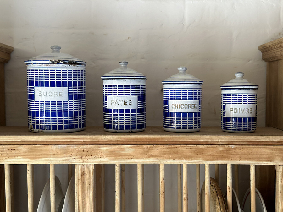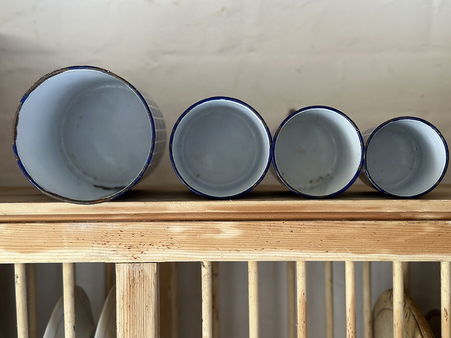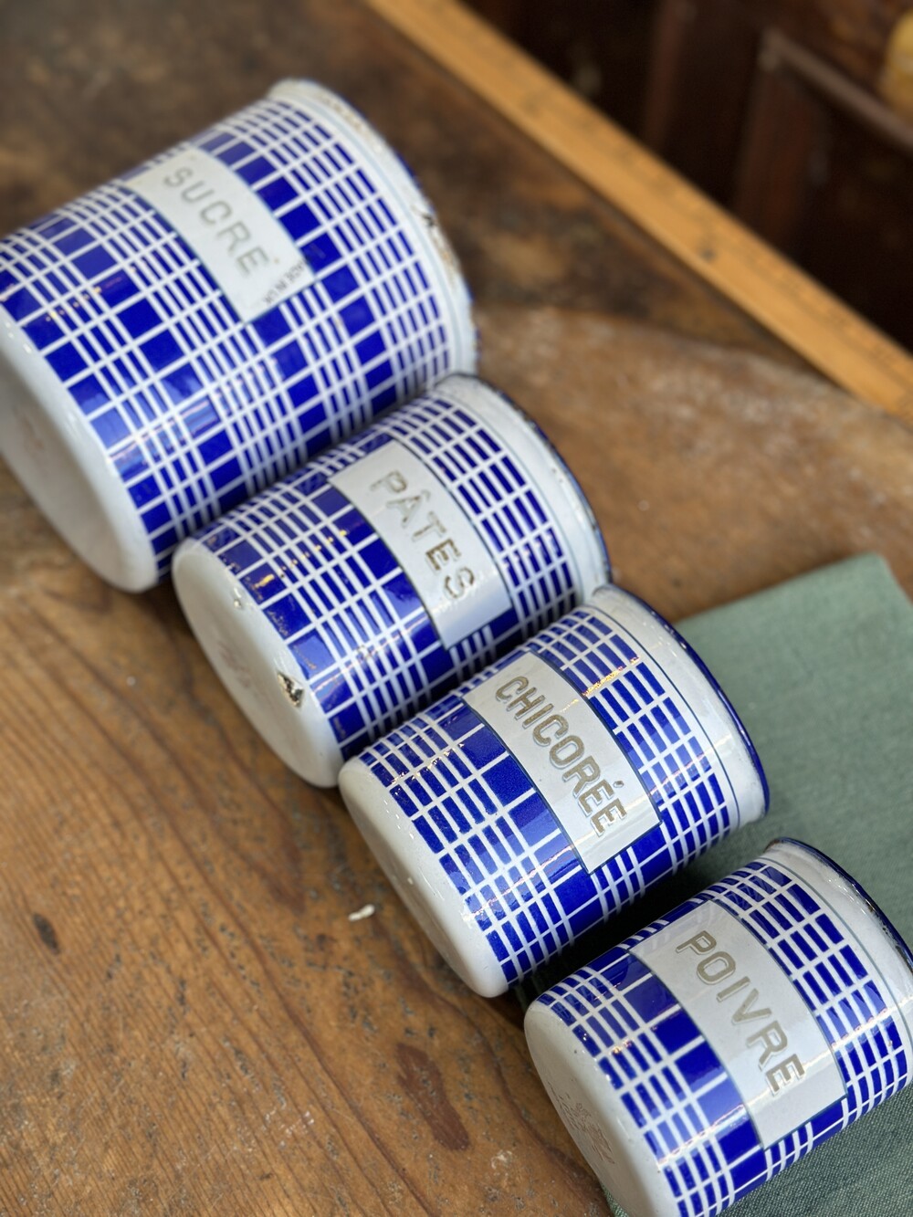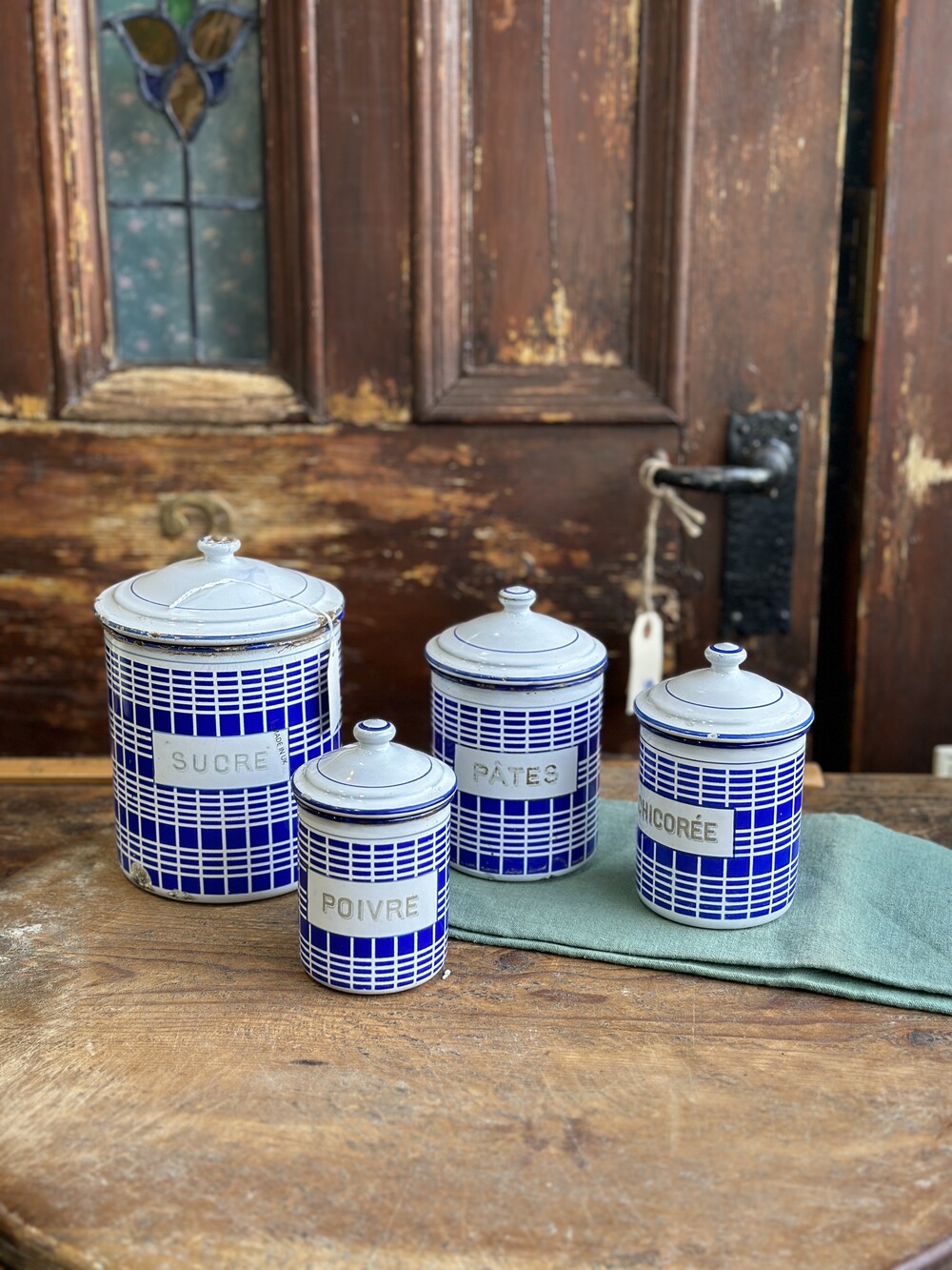 부엌에서 필요한 재료들을 담기 위해 제작된 에나멜 소재의 빈티지 프렌치 자(jar)입니다. 에나멜(법랑) 소재로 된 키친 웨어들은 다양한 국가에서 생산되었으나, 프렌치 에나멜은 특히 미적인 면에서나 공예적인 면에서 타 국가의 것들보다 뛰어난 편입니다. 덕분에 동유럽 빈티지 에나멜에 비해 가격 차이가 많이 나는 것이 사실이긴 하지만, 서로 비교가 불가하죠. 셋트로만 일괄 판매하며, 낱개로는 판매하지 않습니다. 에나멜(enamel ; 법랑) 소재에 대한 자세한 내용이 궁금하시다면 사진들 아래에 관련 아티클 링크를 걸어 두었으니 한 번 읽어보시면 좋을 듯 합니다.