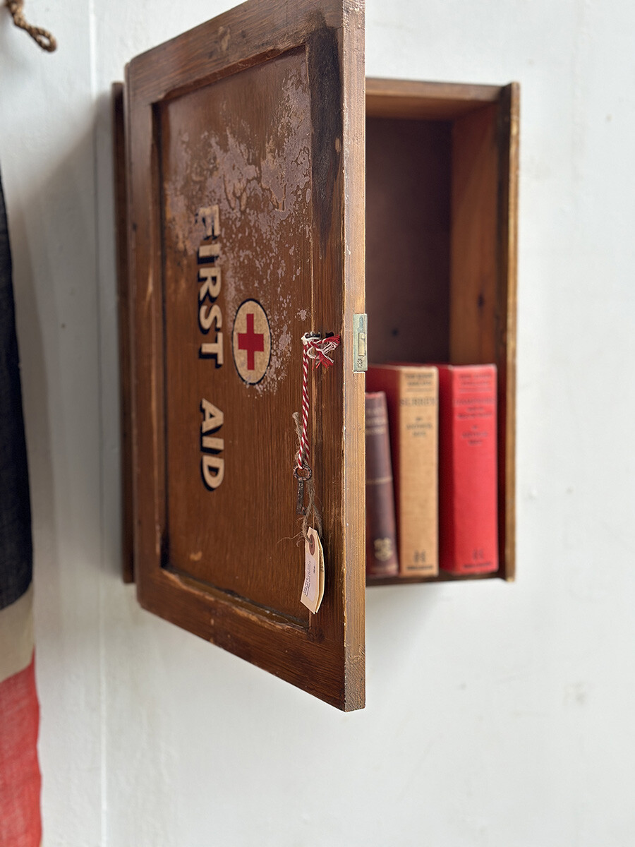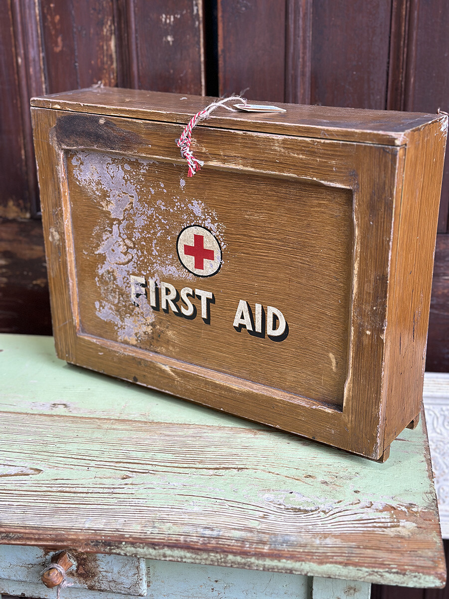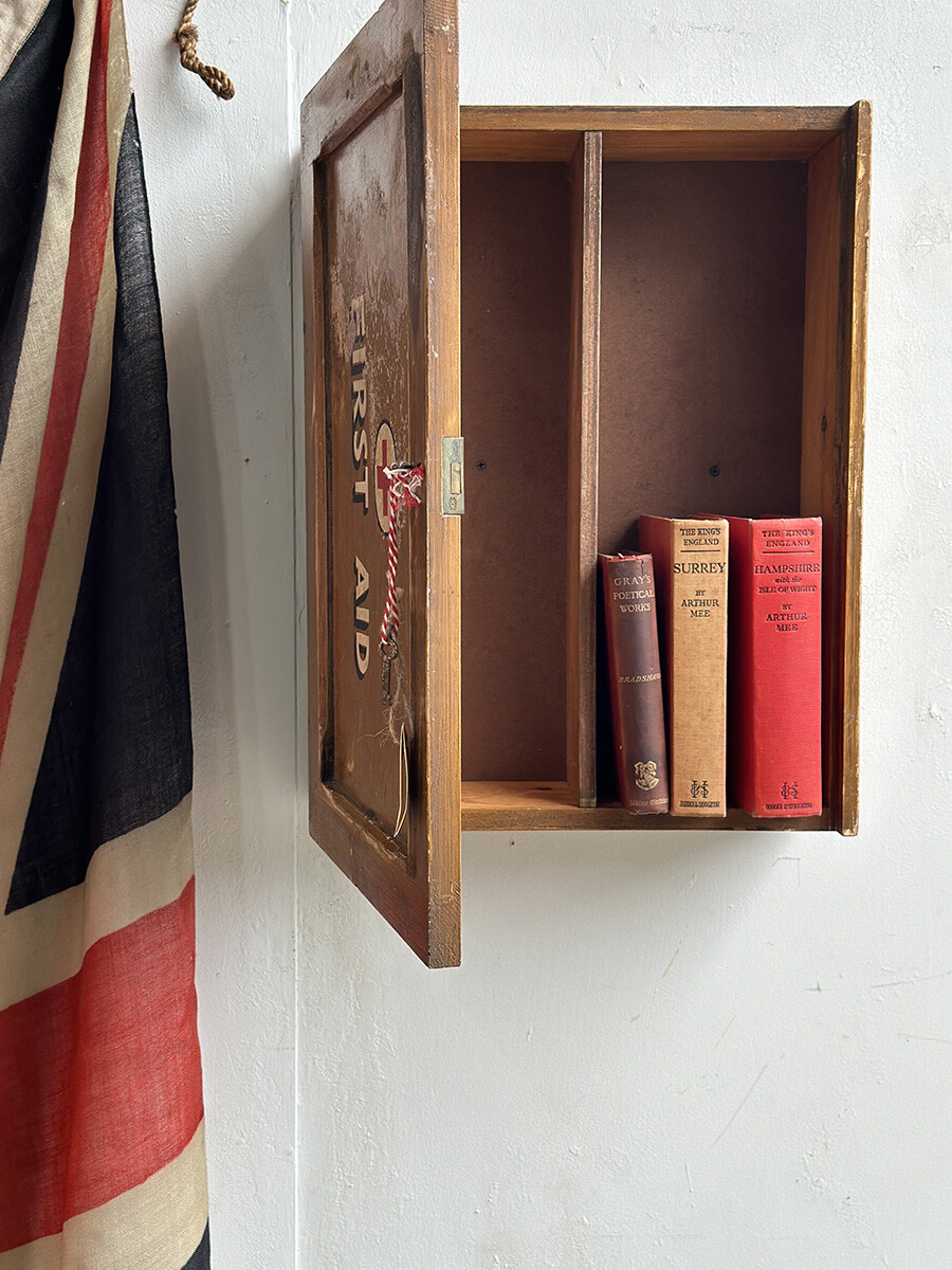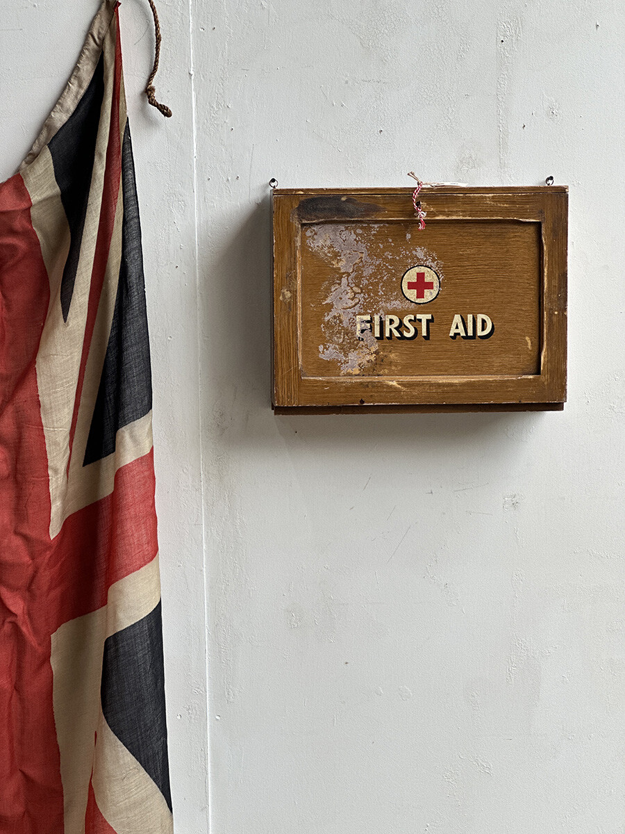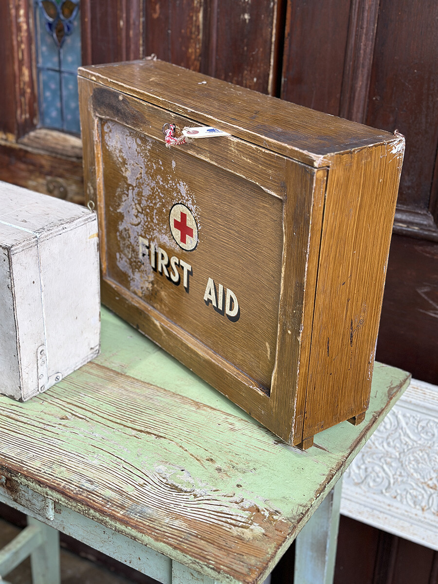 러스틱한 느낌의 세월감이 짙게 묻어나는 빈티지 응급처치 상자입니다. 원목과 플라이우드로 제작되어 있으며, 브라운 컬러의 우든 박스에 긴 세월이 흘러 입혀진 파티나가 멋스러움을 더해주고 있습니다. 퍼스트 에이드(First Aid)는 '응급처치'를 뜻하는 말로, 이에 필요한 약품이나 붕대, 의료 가위 등을 수납하던 상자였습니다. 지금은 이러한 빈티지 응급상자를 소품이나 디스플레이용 캐비넷으로 활용하곤 합니다. 벽에 걸 수 있게끔 모서리에 고리가 있어서, 벽걸이로도 사용 가능합니다. 내부는 2단으로 나뉘어 있습니다.