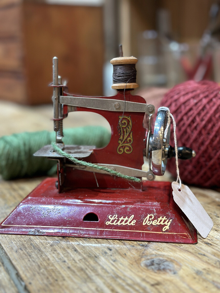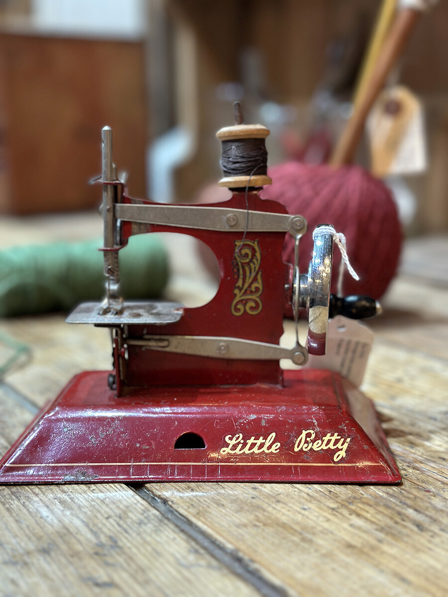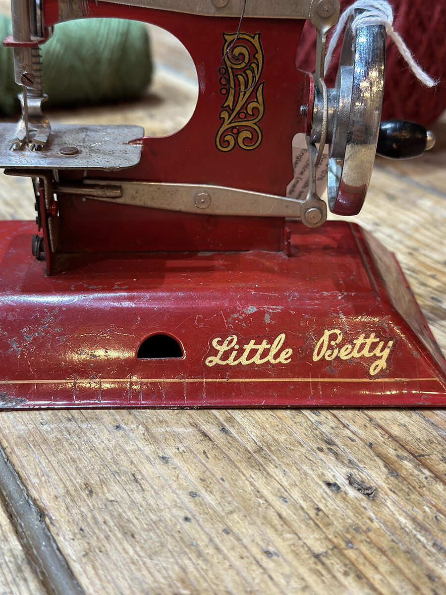 1940년대 후반에 생산된 리틀 베티 W3/03 모델입니다. 키즈 토이로 제작된 빈티지 소잉 머신이며, 실제 소잉머신처럼 크랭크로 연결된 핸들을 작동 시키면 바늘이 작동하고 실제 바느질도 가능 하게 만들어졌습니다. 리틀 베티(Little Betty)는 영국의 켄트 주 도버 지역에서 Eugene Marcel Gheysens가 1935년 경부터 시제품을 생산했다는 기록이 있으나, 본격적인 생산은 2차 세계대전이 끝난 이후부터로 알려져 있습니다. 미국의 토이 수입업체인 Straco와 파트너쉽을 맺고 지속적인 생산을 이어가다가, 1960년대에는 Straco에 인수되었으나 생산은 지속적으로 영국에서 하였습니다.