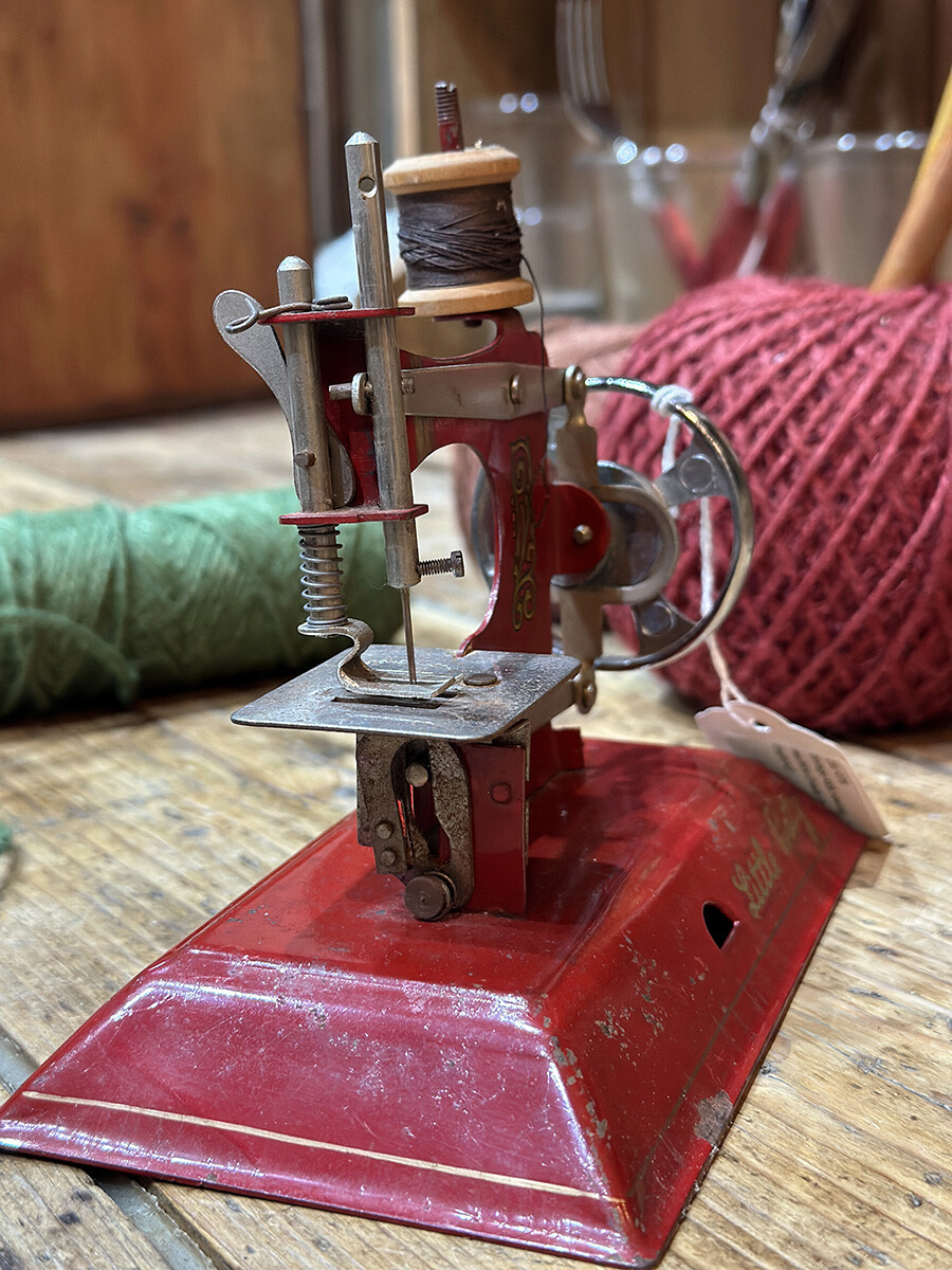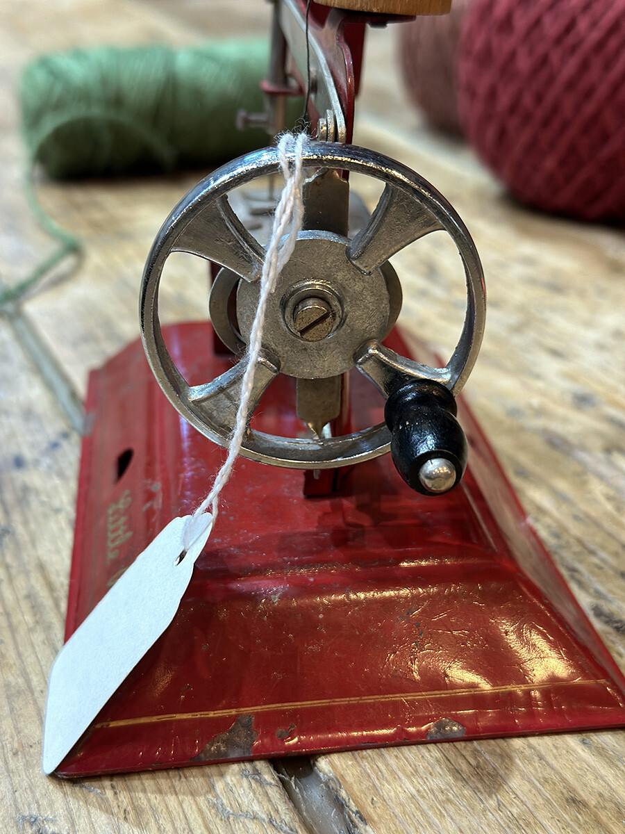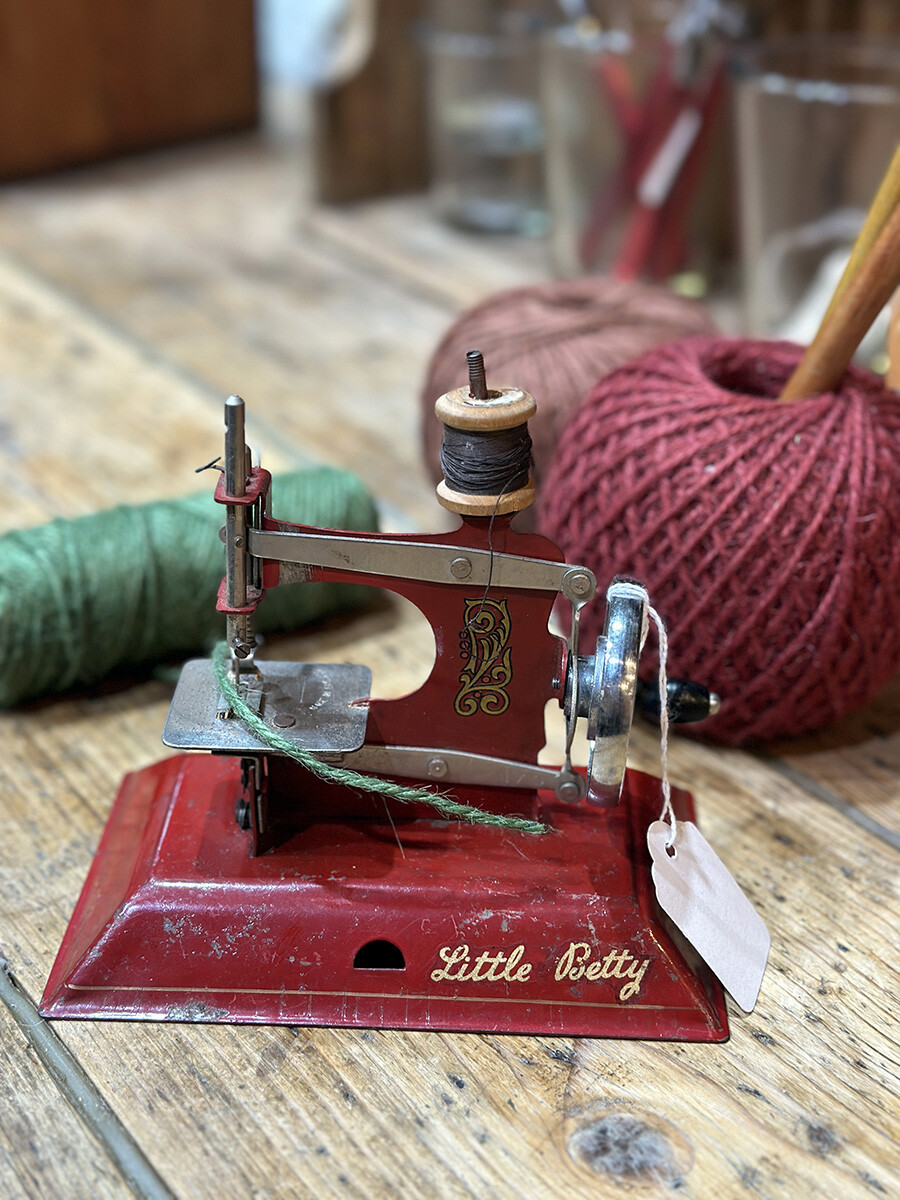 1940년대 후반에 생산된 리틀 베티 W3/03 모델입니다. 키즈 토이로 제작된 빈티지 소잉 머신이며, 실제 소잉머신처럼 크랭크로 연결된 핸들을 작동 시키면 바늘이 작동하고 실제 바느질도 가능 하게 만들어졌습니다. 리틀 베티(Little Betty)는 영국의 켄트 주 도버 지역에서 Eugene Marcel Gheysens가 1935년 경부터 시제품을 생산했다는 기록이 있으나, 본격적인 생산은 2차 세계대전이 끝난 이후부터로 알려져 있습니다. 미국의 토이 수입업체인 Straco와 파트너쉽을 맺고 지속적인 생산을 이어가다가, 1960년대에는 Straco에 인수되었으나 생산은 지속적으로 영국에서 하였습니다.