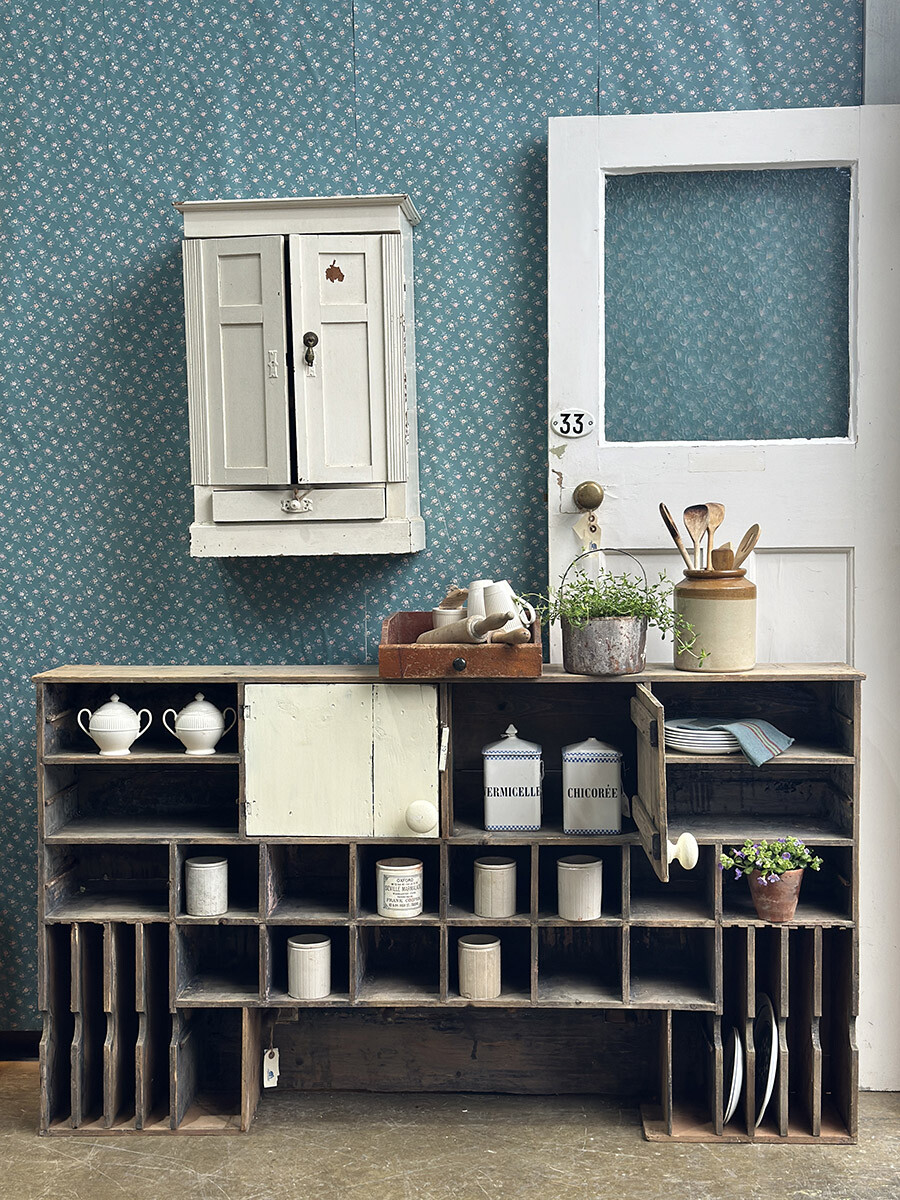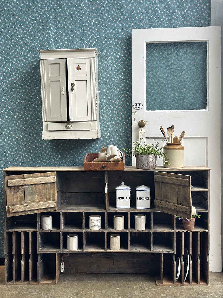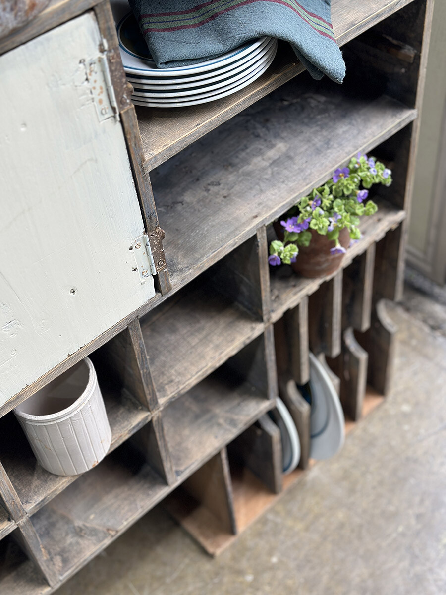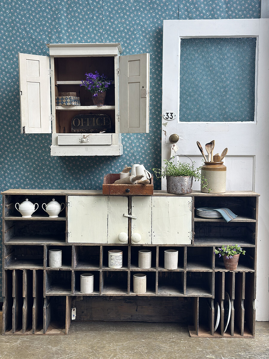*피전홀(pigeon hole)이란? 파티션으로 크고 작게 나뉜 스토리지들을 통칭하는 말로, 비둘기들을 사육하는 사육장의 모습과 닮았다고 하여 붙은 별명입니다. 영국 현지에서 앤틱과 빈티지 트렌드를 다루는 잡지 등에서 단골손님으로 소개되고 있으며, 앤틱-빈티지 데코레이션에서 빠질 수 없는 아이템이 되었습니다.