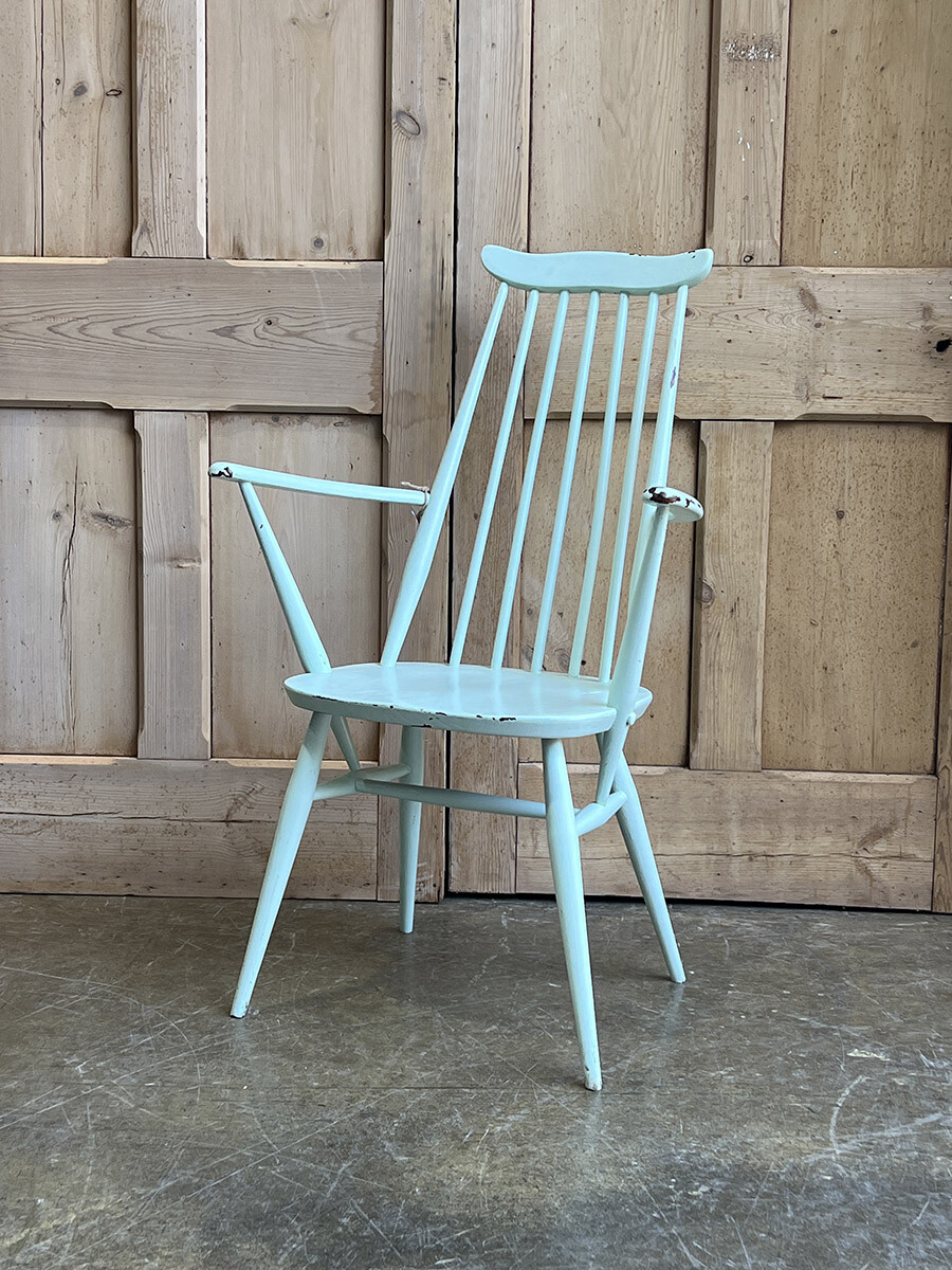 1920년에 창업한 얼콜(ercol)은 가구 디자이너로서는 영국에서 유일하게 미드-센츄리 모던 리딩 디자이너로 선정되었으며, 특히 그가 디자인한 얼콜의 체어들은 많은 빈티지 체어 러버들이 소장하고 싶어하는 필수 아이템 중 하나가 되었습니다. 해당 상품은 얼콜라니의 오리지널 디자인 체어 중 하나인 골드스미스(Goldsmith) 체어로, 원래는 짙은 컬러의 체어였는데 이전 소유자가 민트 컬러로 쉐비 시크 페인팅을 해서 사용한 것을 수집했습니다. 특히 골드스미스 체어는 1986년에 단종되어 현재는 새상품이 생산되지 않는데다가, 특히 스탠다드 타입의 체어가 아닌 팔걸이가 있는 이 암체어 버전은 특히 구하기가 쉽지 않다는 점을 말씀 드리고 싶네요.