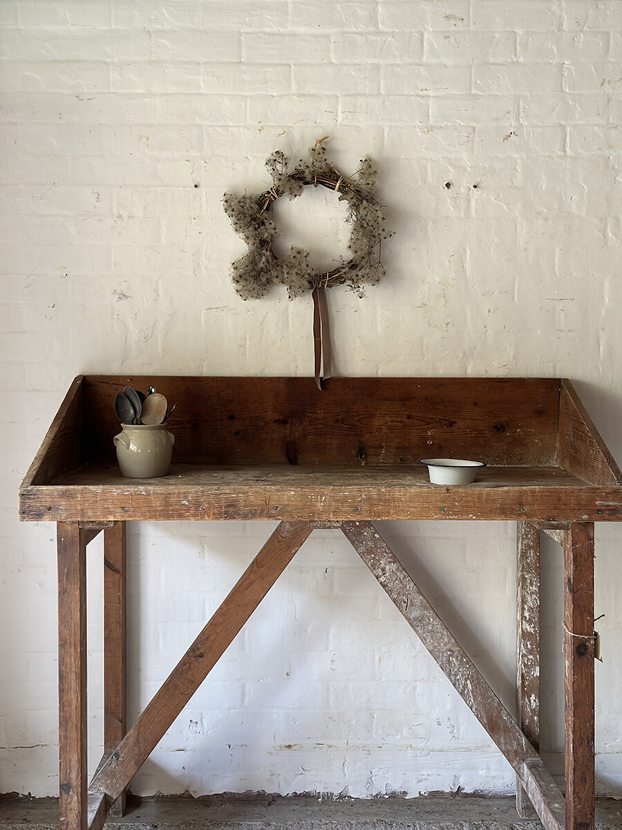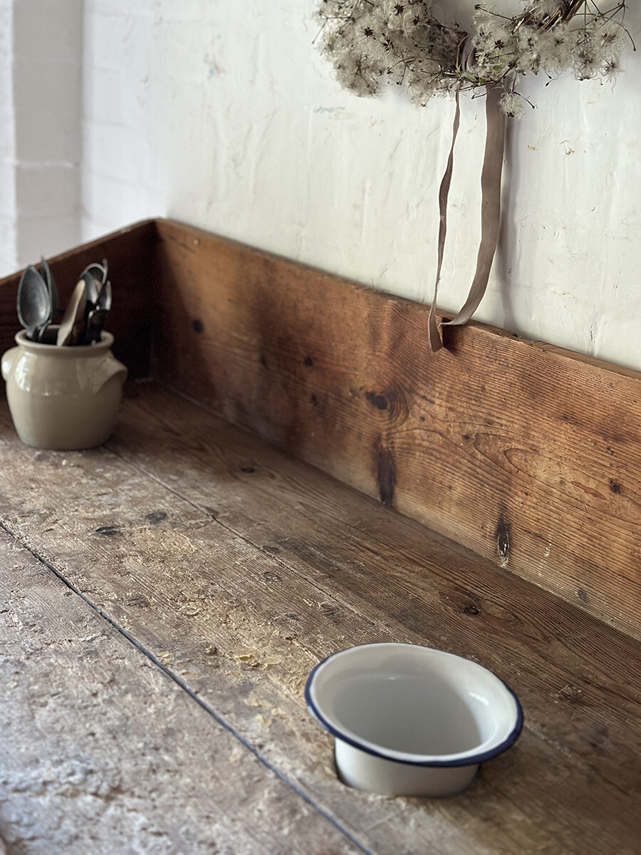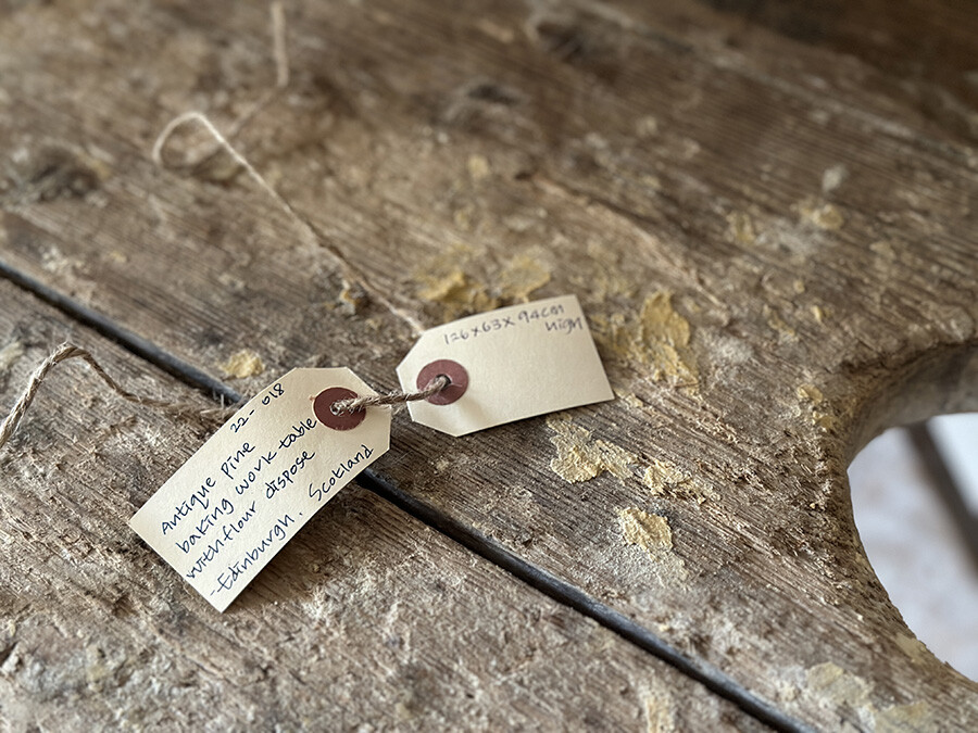 밀가루 반죽 작업을 위해 제작된 앤틱 파인 베이킹 워크 테이블입니다. 작업대 상판에는 밀가루가 날리거나 흘리지 않게끔 펜스를 쳐두었고, 다리 부분은 반죽을 할 때에 가해지는 힘을 받칠 수 있는 구조로 제작되었습니다. 밀가루를 반죽했던 흔적들이 고스란히 함께 파티나로 내려 앉아 있는데, 오리지널 앤틱 브레드 보드 등에서도 같은 흔적들을 쉽게 찾아 볼 수 있습니다. 작업대 상판의 오른편에 작은 구멍이 뚫려 있는데, 이것은 남는 밀가루등을 쉽게 빼내기 위해 만들어진 구멍입니다.