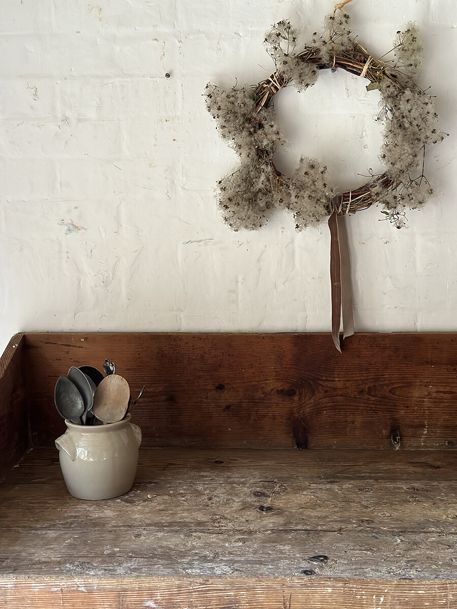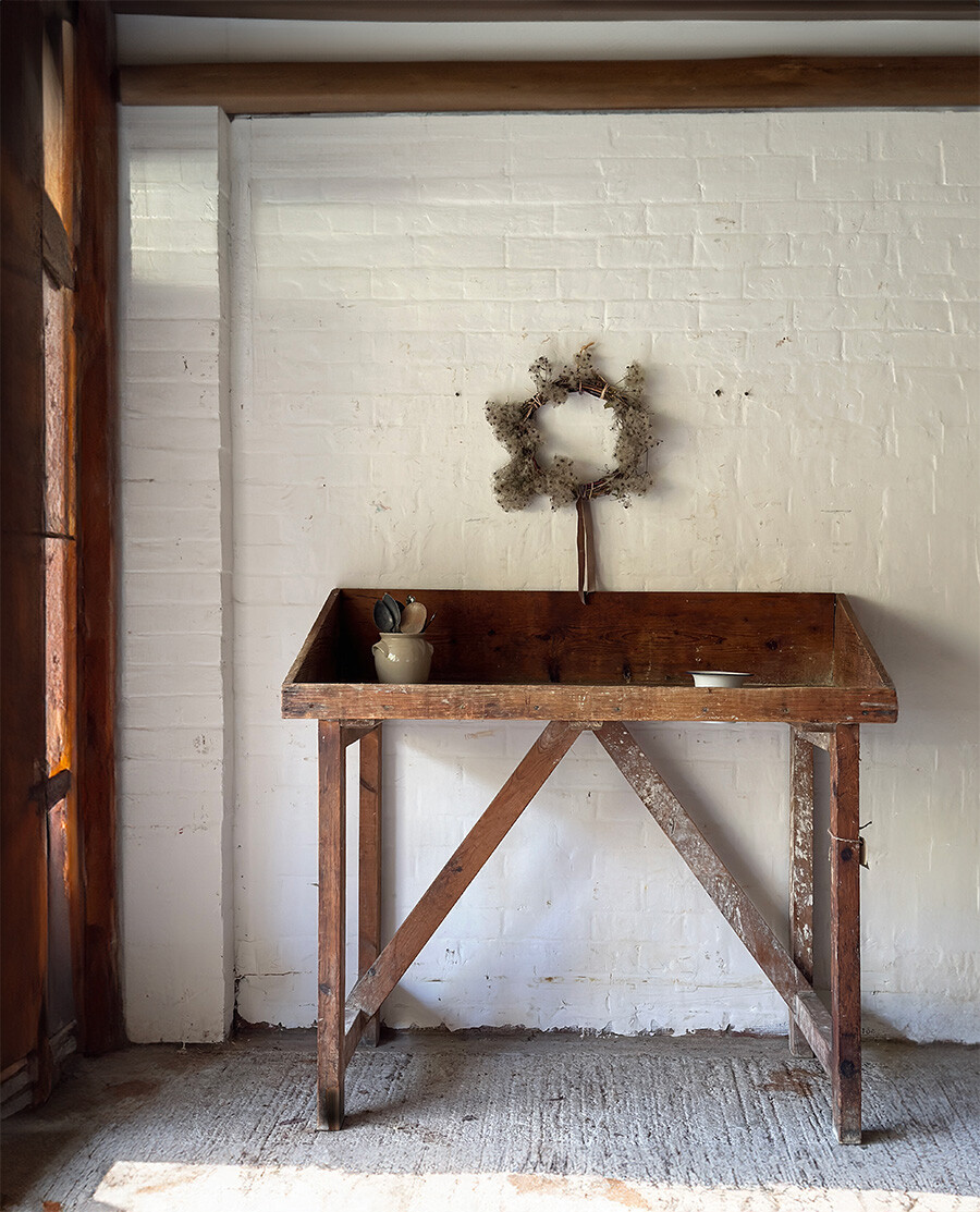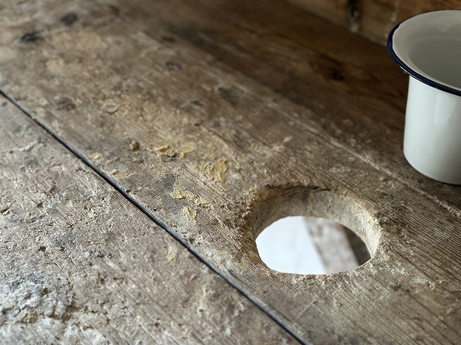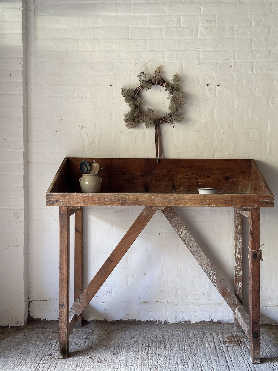밀가루 반죽 작업을 위해 제작된 앤틱 파인 베이킹 워크 테이블입니다. 작업대 상판에는 밀가루가 날리거나 흘리지 않게끔 펜스를 쳐두었고, 다리 부분은 반죽을 할 때에 가해지는 힘을 받칠 수 있는 구조로 제작되었습니다. 밀가루를 반죽했던 흔적들이 고스란히 함께 파티나로 내려 앉아 있는데, 오리지널 앤틱 브레드 보드 등에서도 같은 흔적들을 쉽게 찾아 볼 수 있습니다. 작업대 상판의 오른편에 작은 구멍이 뚫려 있는데, 이것은 남는 밀가루등을 쉽게 빼내기 위해 만들어진 구멍입니다.