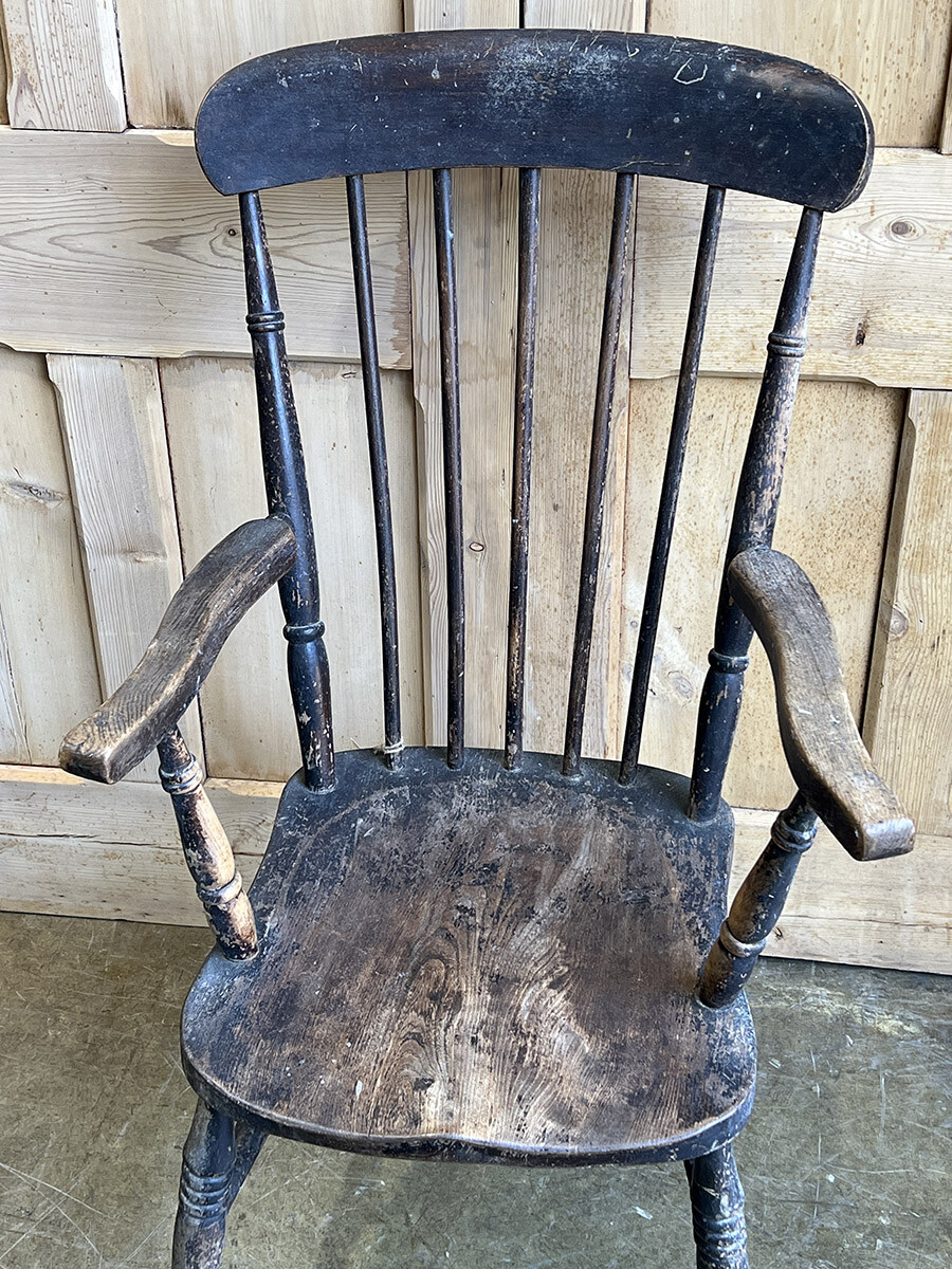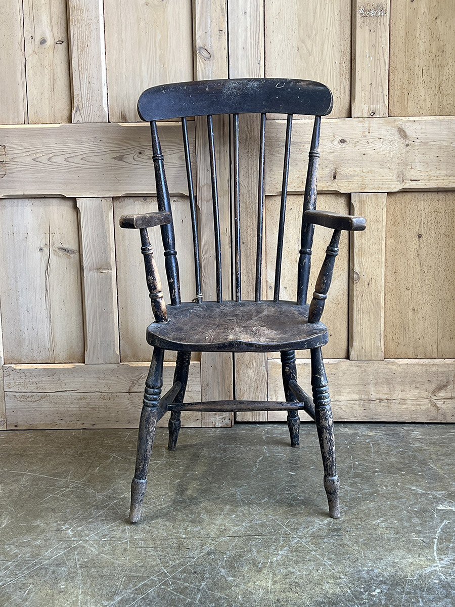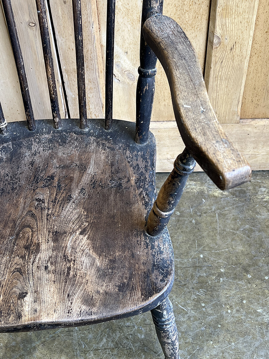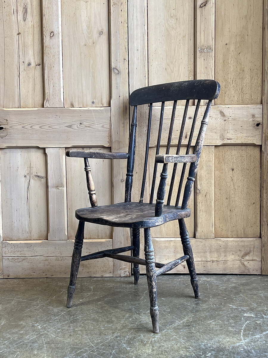 윈저 스틱백 체어는 윈저 체어의 원형이자 가장 기본적인 형태를 갖고 있습니다. 등받이를 이루는 스핀들 부분이 심플한 스틱(stick) 모양을 하고 있기에 스틱백(stickback) 체어라고 부릅니다. 스핀들 중 바깥 쪽의 좌,우 기둥들(uprights)에 스크롤 모양이 들어가게 선반으로 가공되어 있습니다. 팔걸이가 있는 의자를 암체어, 혹은 카버(caver)라고 부르는데 스탠다드 타입의 윈저 체어에 비해 모두 크게 만들어져 있습니다. 편하게 앉아서 작업을 하거나 휴식을 하라는 의미이기도 하죠. 적당한 방석이나 쿠션을 갖추신다면 더욱 안락한 의자로 사용하실 수 있습니다.