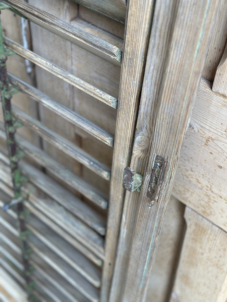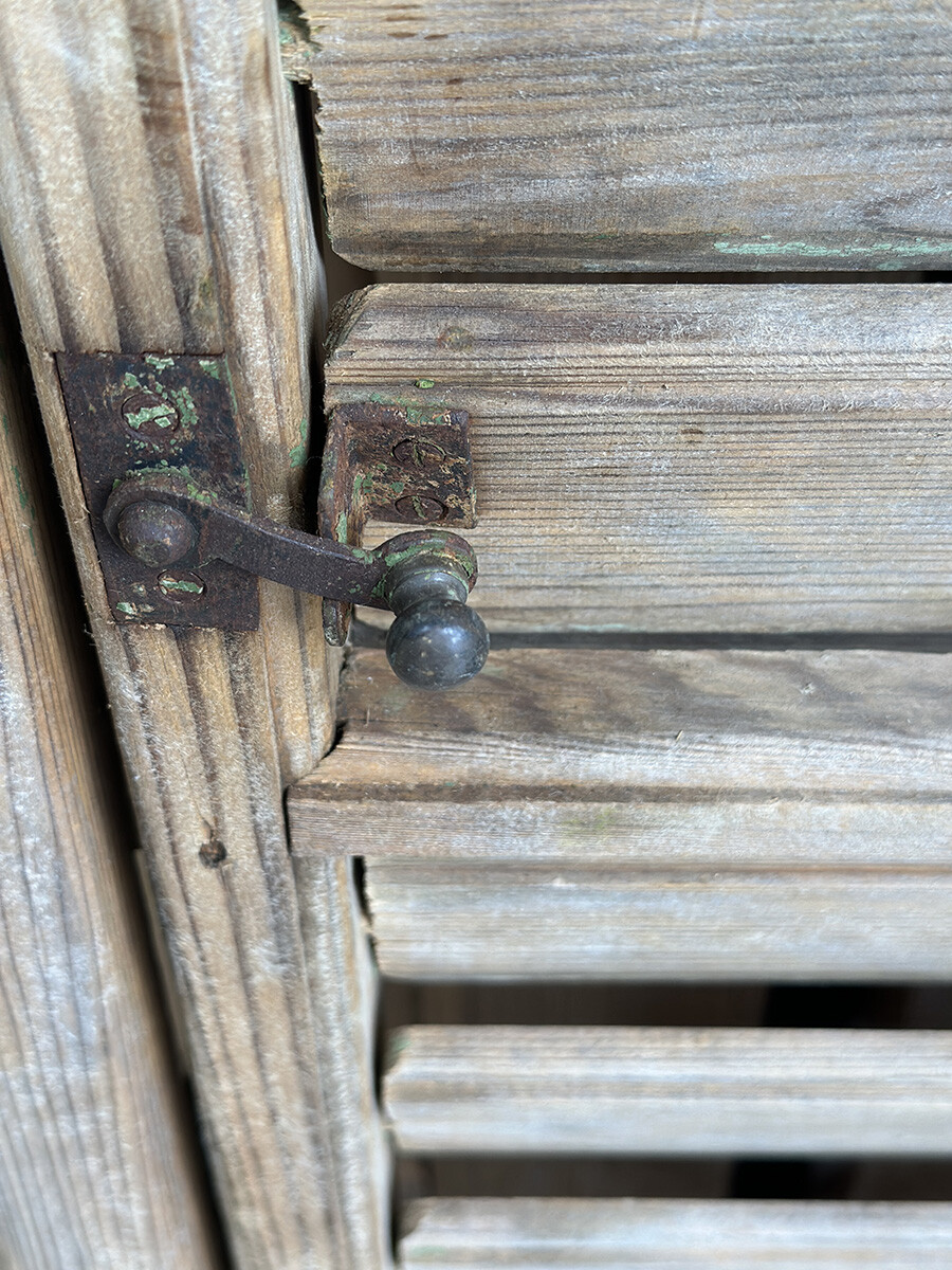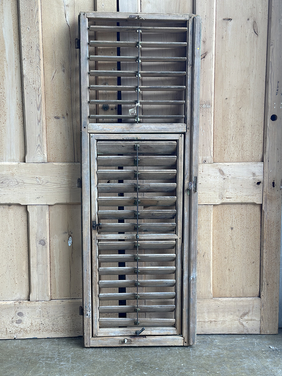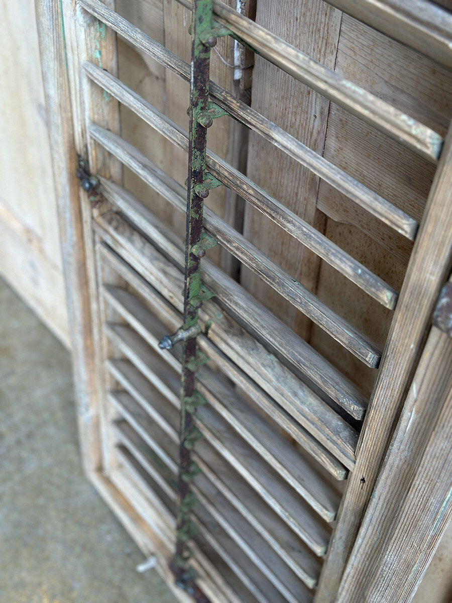 윈도우 셔터는 일반적으로 빛이나 찬바람을 막고, 돌풍과 우박 등에 의한 피해를 줄이고자 제작했고 사용되어 왔는데, 현재는 건축물에 실사용하는 경우는 물론 월 오나먼트나 파티션, 인테리어 연출에도 자주 사용되곤 합니다. 본 상품은 앤틱 파인의 파티나가 농후하게 배어있는 윈도우 셔터인데, 특히 상부와 하부를 나누어 셔터의 가림막을 조절할 수 있으며 하부 셔터는 일정각도 열릴 수 있도록 되어 있다는 점이 독특한 매력입니다. 딱 한 개만 수집되었습니다.