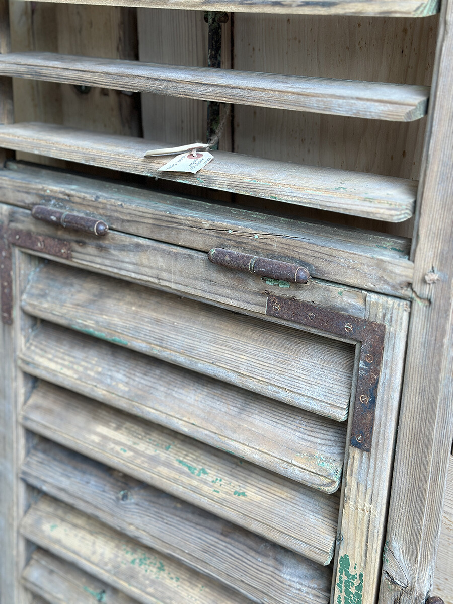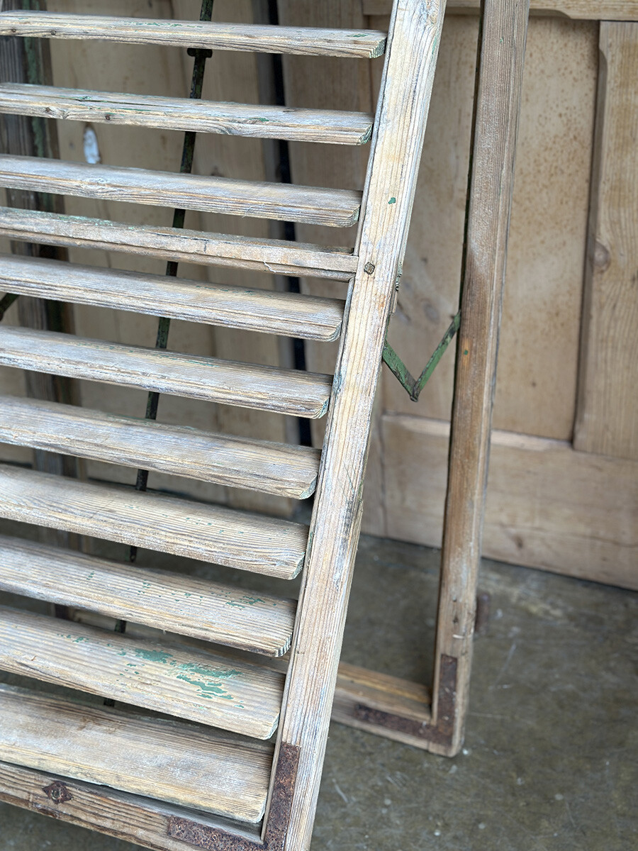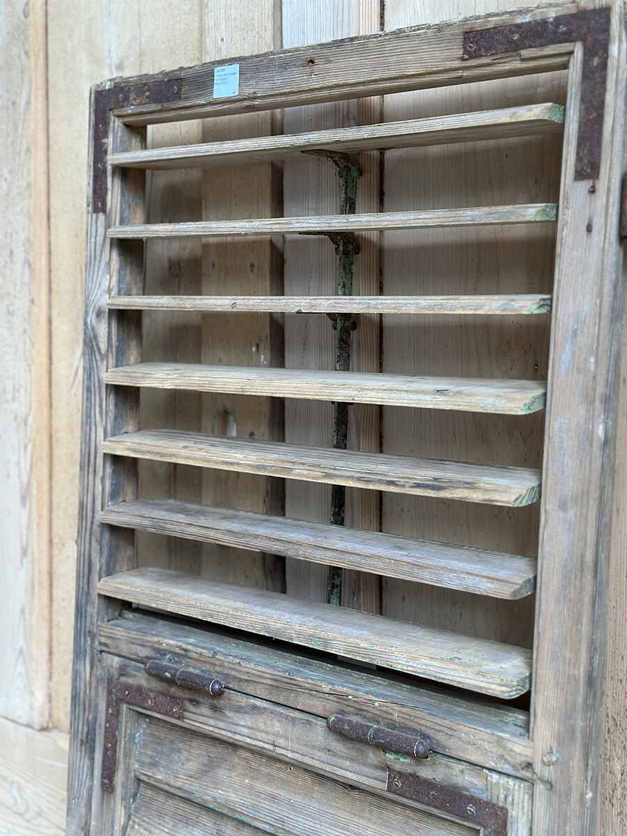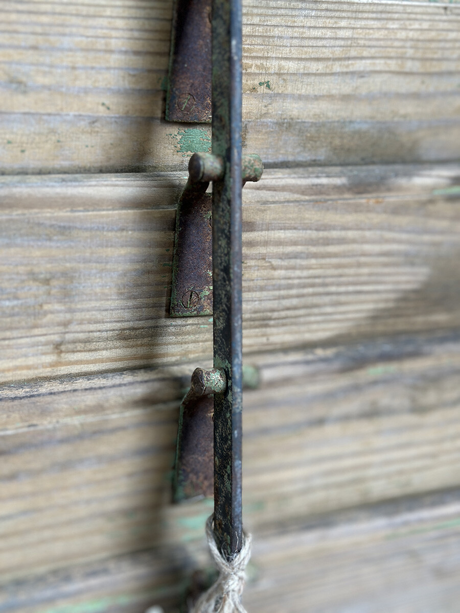 윈도우 셔터는 일반적으로 빛이나 찬바람을 막고, 돌풍과 우박 등에 의한 피해를 줄이고자 제작했고 사용되어 왔는데, 현재는 건축물에 실사용하는 경우는 물론 월 오나먼트나 파티션, 인테리어 연출에도 자주 사용되곤 합니다. 본 상품은 앤틱 파인의 파티나가 농후하게 배어있는 윈도우 셔터인데, 특히 상부와 하부를 나누어 셔터의 가림막을 조절할 수 있으며 하부 셔터는 일정각도 열릴 수 있도록 되어 있다는 점이 독특한 매력입니다. 딱 한 개만 수집되었습니다.
