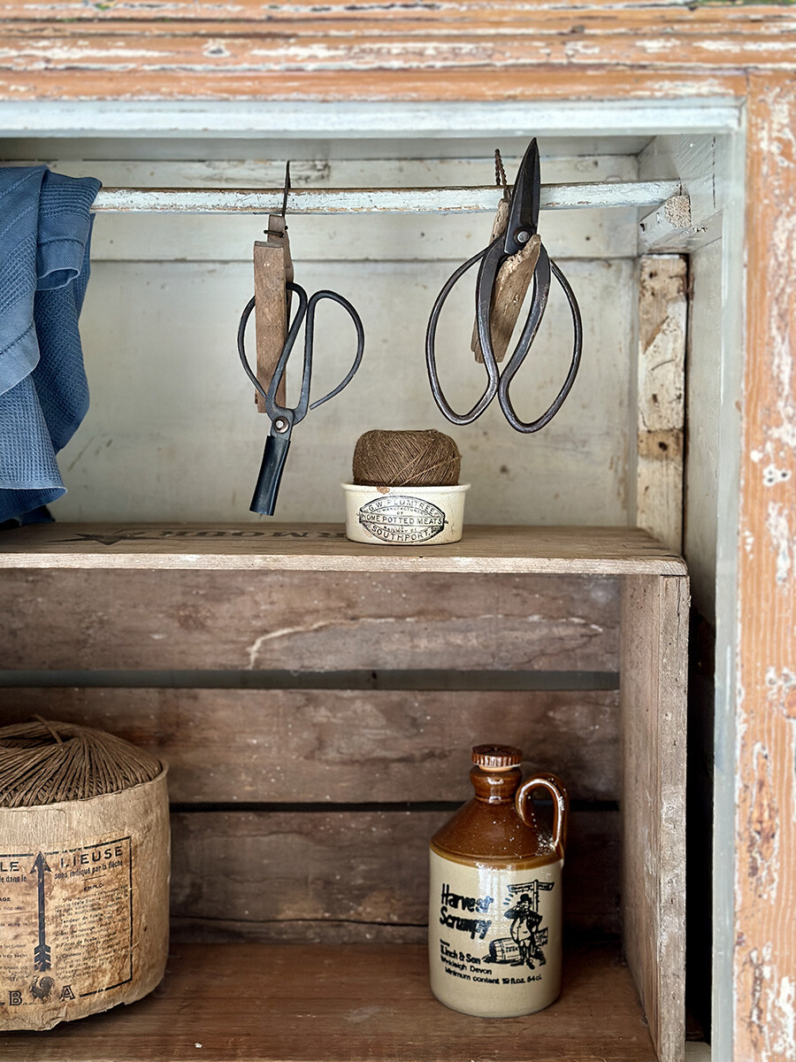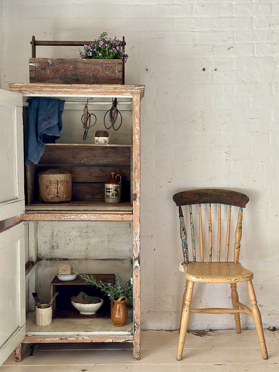 쉐비 시크 페인팅이 되어 있는 올드 빈티지 파인 소재의 아담한 사이즈의 커보드입니다. 커보드는 상부와 하부 2단으로 나뉘어 있습니다. 커보드 내부가 나뉘어 있더라도 도어는 전면부에 하나로 달려 있는 경우를 더 자주 볼 수 있는 것에 비해, 본 상품의 경우에는 상-하부에 도어가 각각 나뉘어 있어서 사용하기에 용이합니다.
