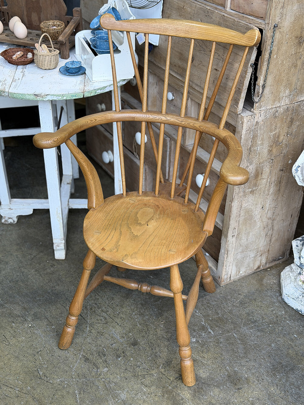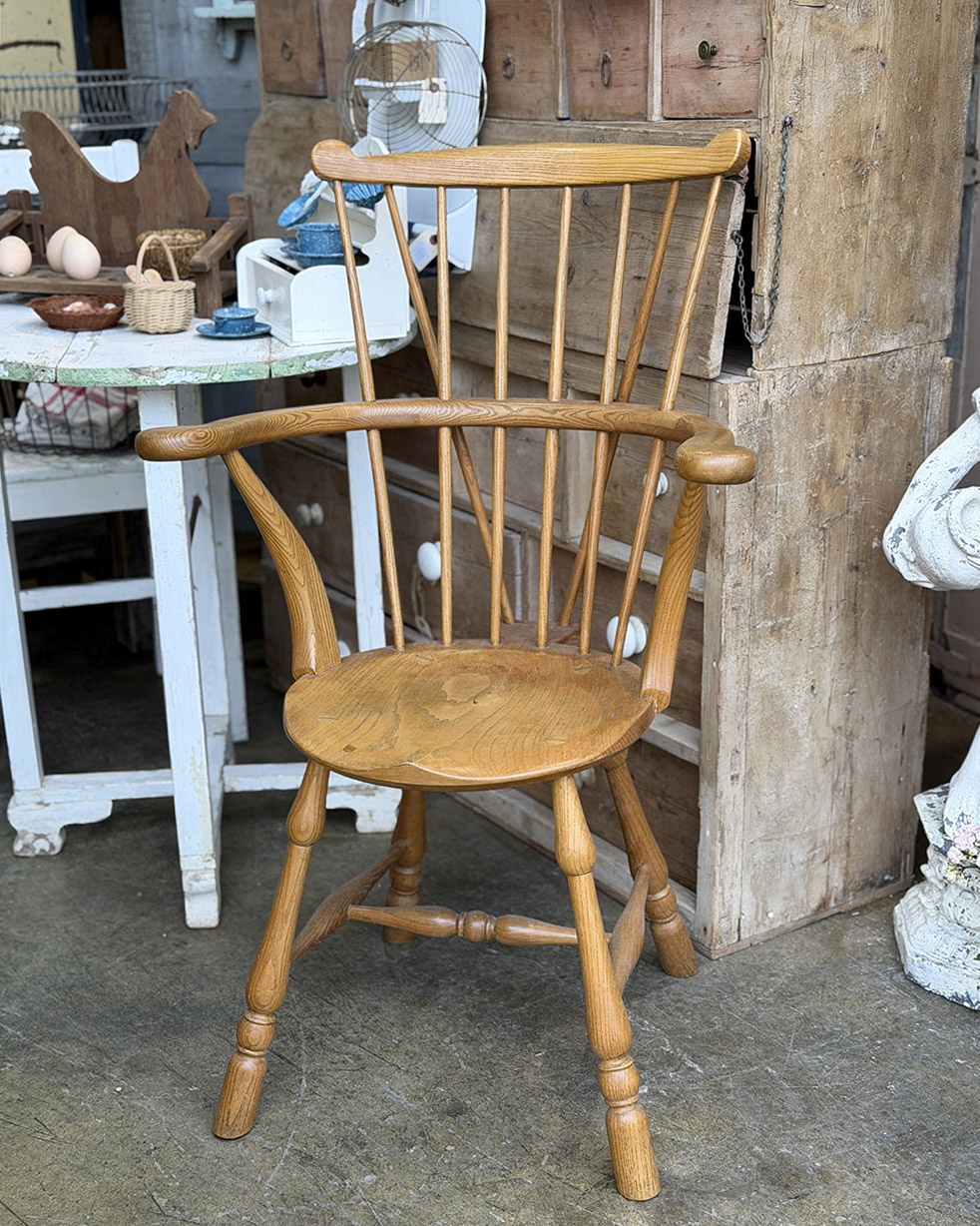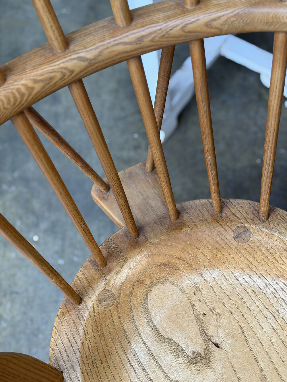 빈티지 라운드 시트 윈저 암체어로, 오크와 애쉬가 함께 사용된 전형적인 잉글리쉬 체어입니다. 좌판은 넓은 한 장의 오크를 깎아 만든 솔리드 구조이고, 등받이의 스핀들과 레그는 강도가 필요한 애쉬로 구성되어 있어 재료 선택부터 기능이 분명하게 드러나는 방식이죠. 곡선으로 휘어진 암레스트와 등받이의 흐름이 자연스럽게 이어지며, 하부에는 크리놀린 스트레처가 더해져 구조적인 안정감을 만들어냅니다.