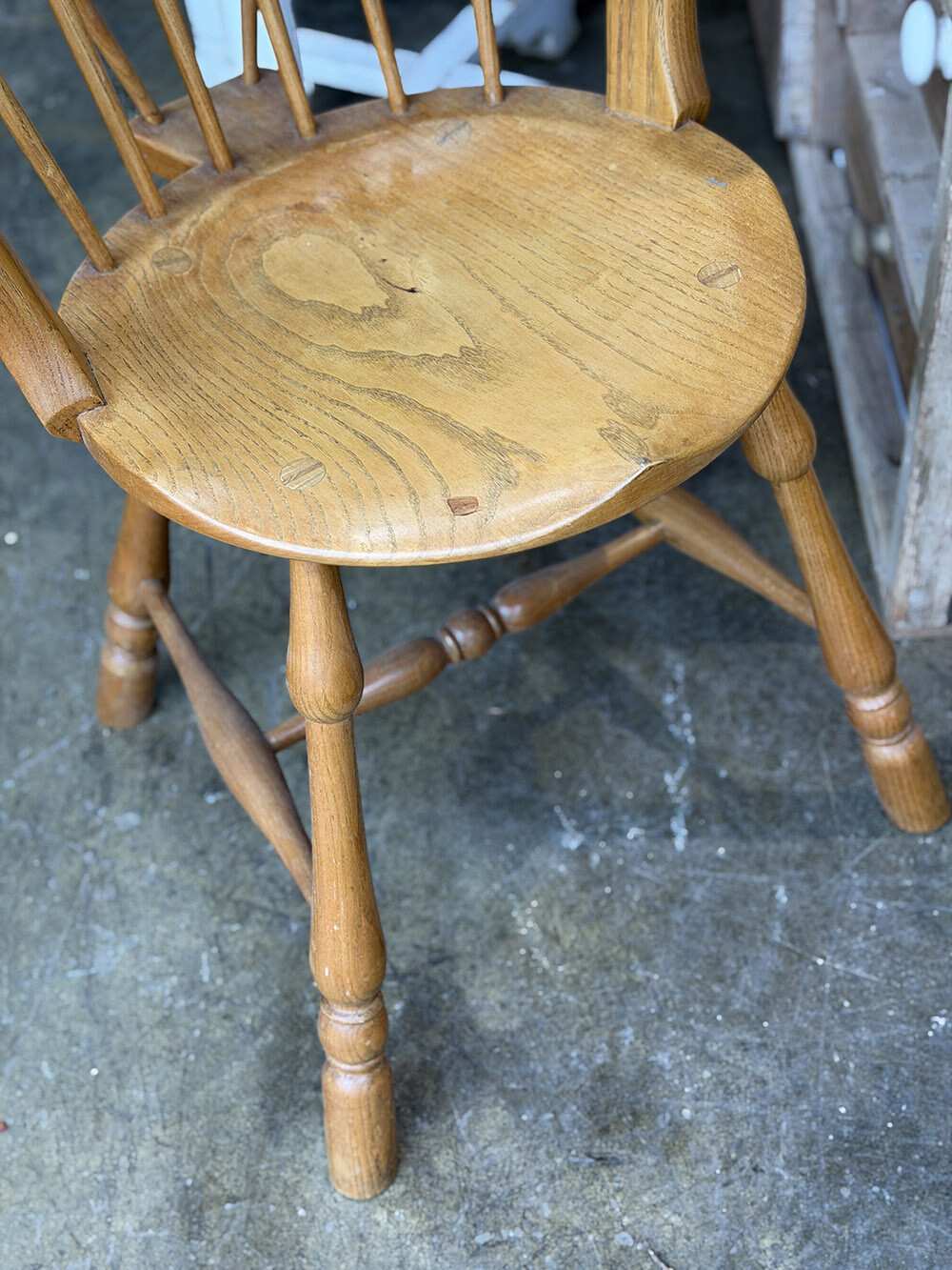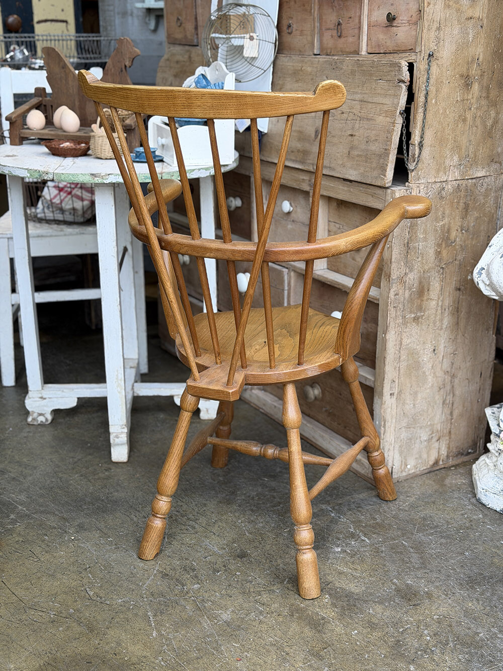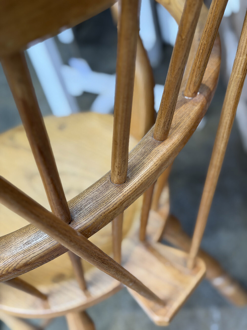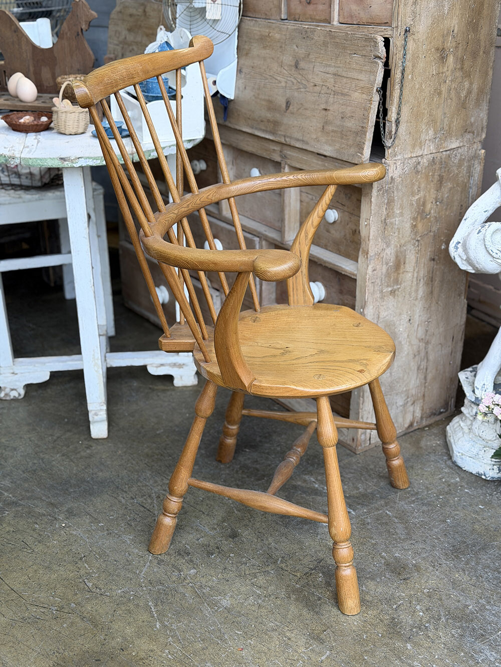 빈티지 라운드 시트 윈저 암체어로, 오크와 애쉬가 함께 사용된 전형적인 잉글리쉬 체어입니다. 좌판은 넓은 한 장의 오크를 깎아 만든 솔리드 구조이고, 등받이의 스핀들과 레그는 강도가 필요한 애쉬로 구성되어 있어 재료 선택부터 기능이 분명하게 드러나는 방식이죠. 곡선으로 휘어진 암레스트와 등받이의 흐름이 자연스럽게 이어지며, 하부에는 크리놀린 스트레처가 더해져 구조적인 안정감을 만들어냅니다.