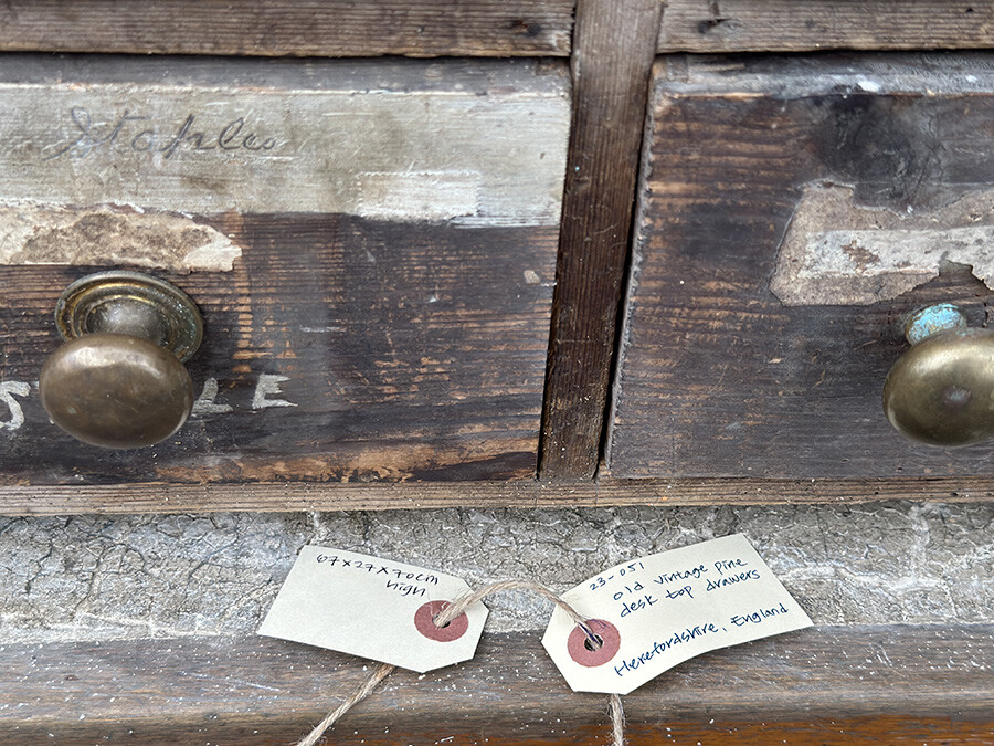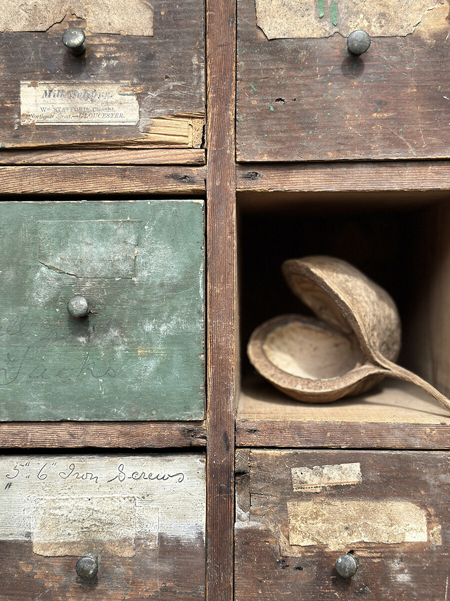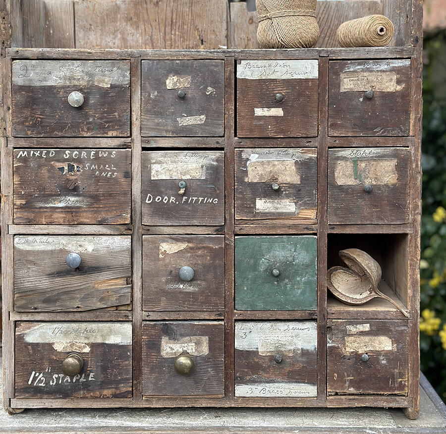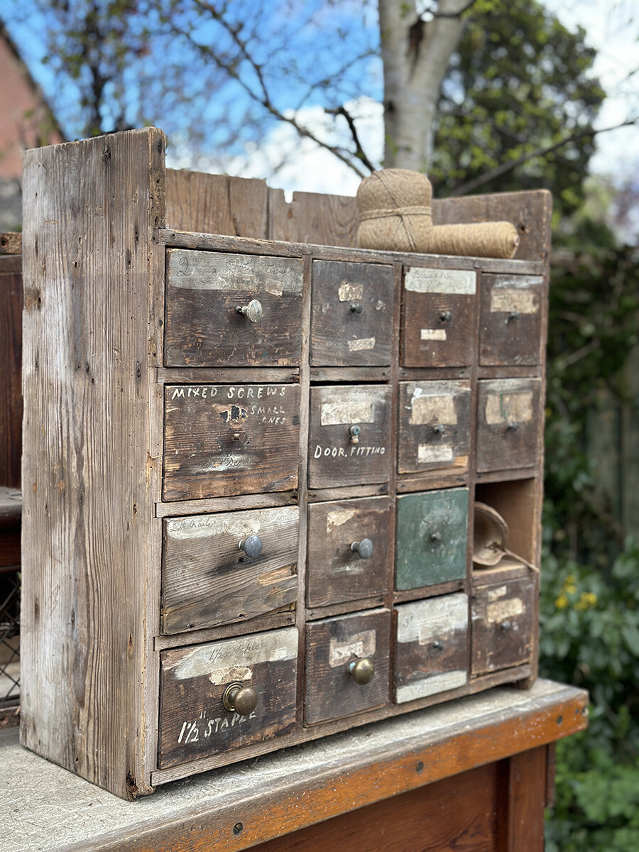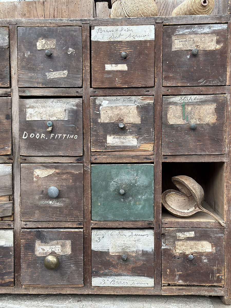 작업대나 책상 위에 올려두고 사용하는 아담한 사이즈의 데스크 탑 드로워입니다. 이 서랍장의 용도는 원래 목수나 기능공이 파츠를 넣어두고 사용했던 것으로 여겨지는데요, 서랍마다 부속품의 명칭이 쓰여 있는 글씨가 정겹게 느껴집니다. 가장 왼쪽 열에 있는 서랍들이 나머지 서랍들에 비해서 좀 더 크게 만들어져 있는데다가, 기계로 자르듯이 만들어져 있지 않아 단조롭지 않고 약간의 컬러감들이 섞여 있어서 유쾌함이 느껴지는 캐릭터 아이템이라고 할 수 있겠네요.
