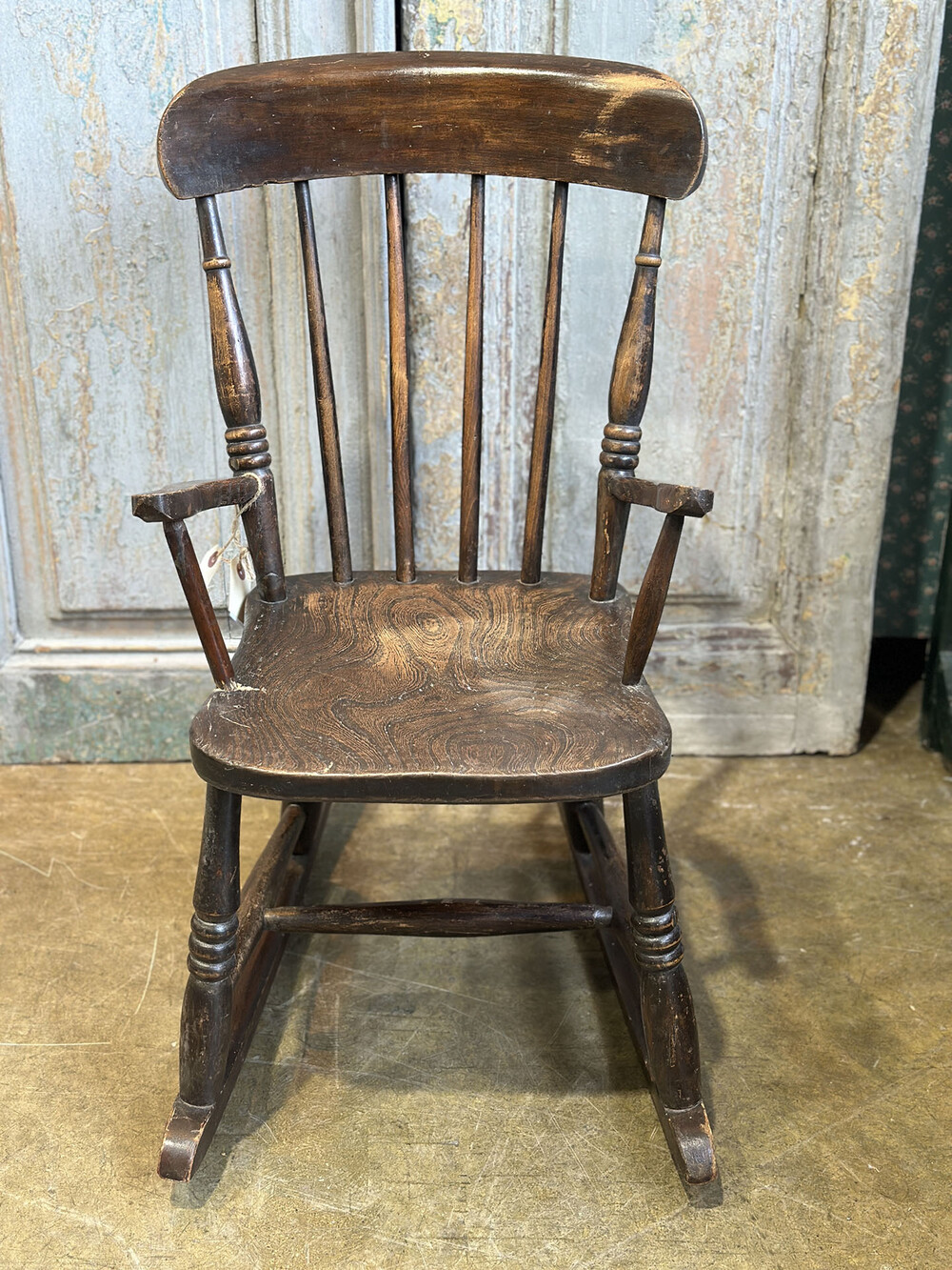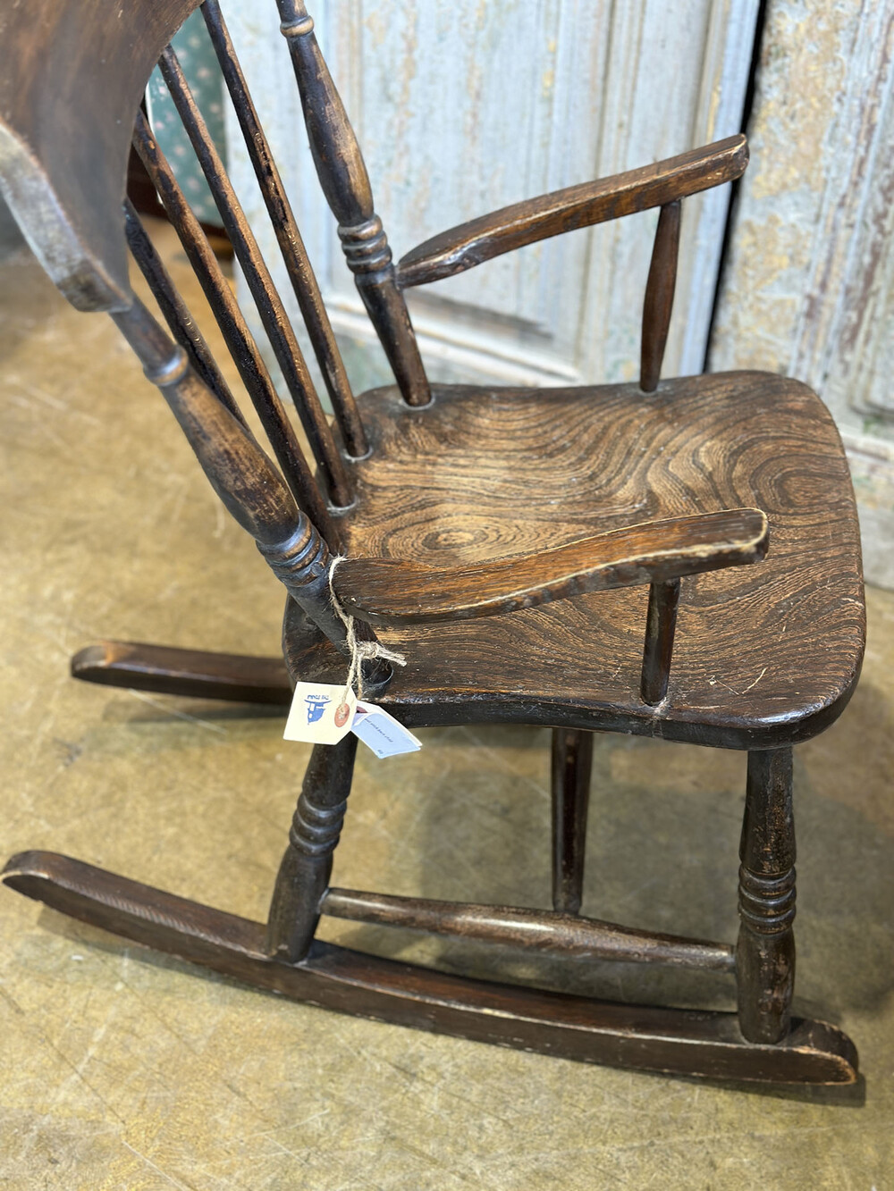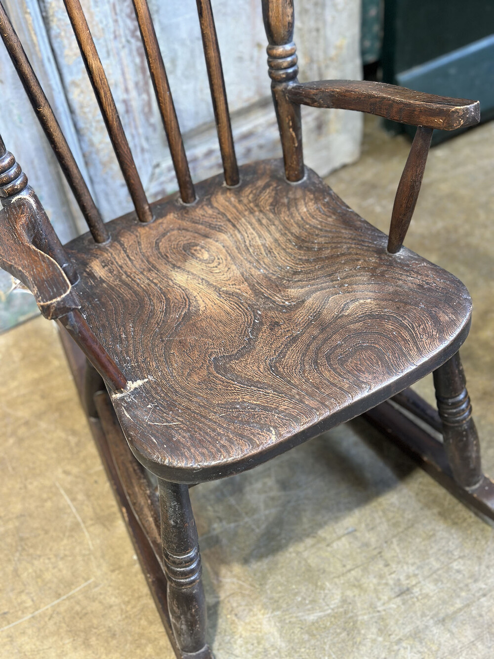 23-068 Old vintage elm seat stick back rocking chair for chil