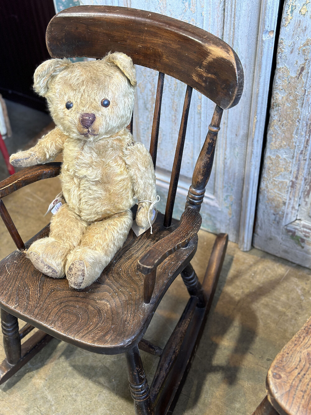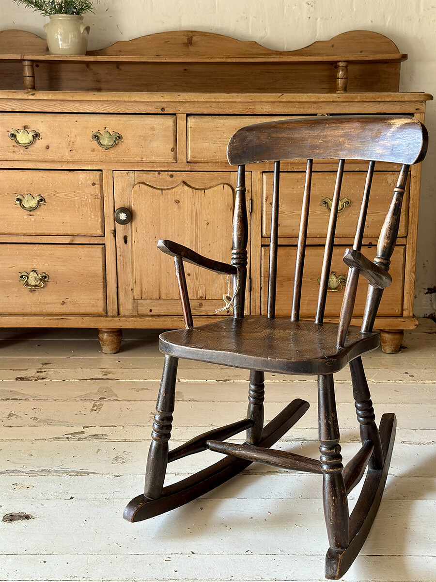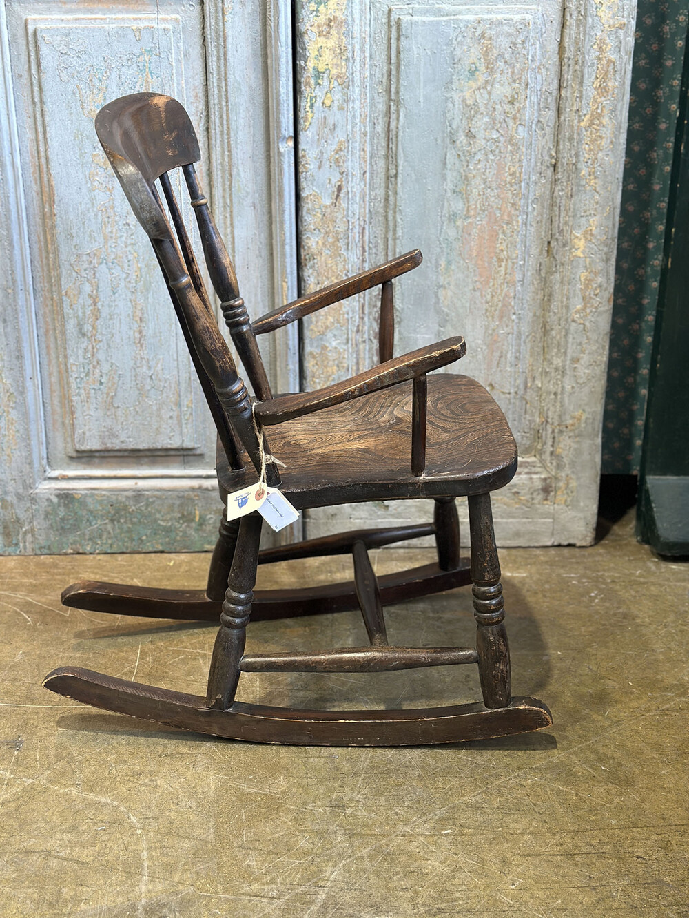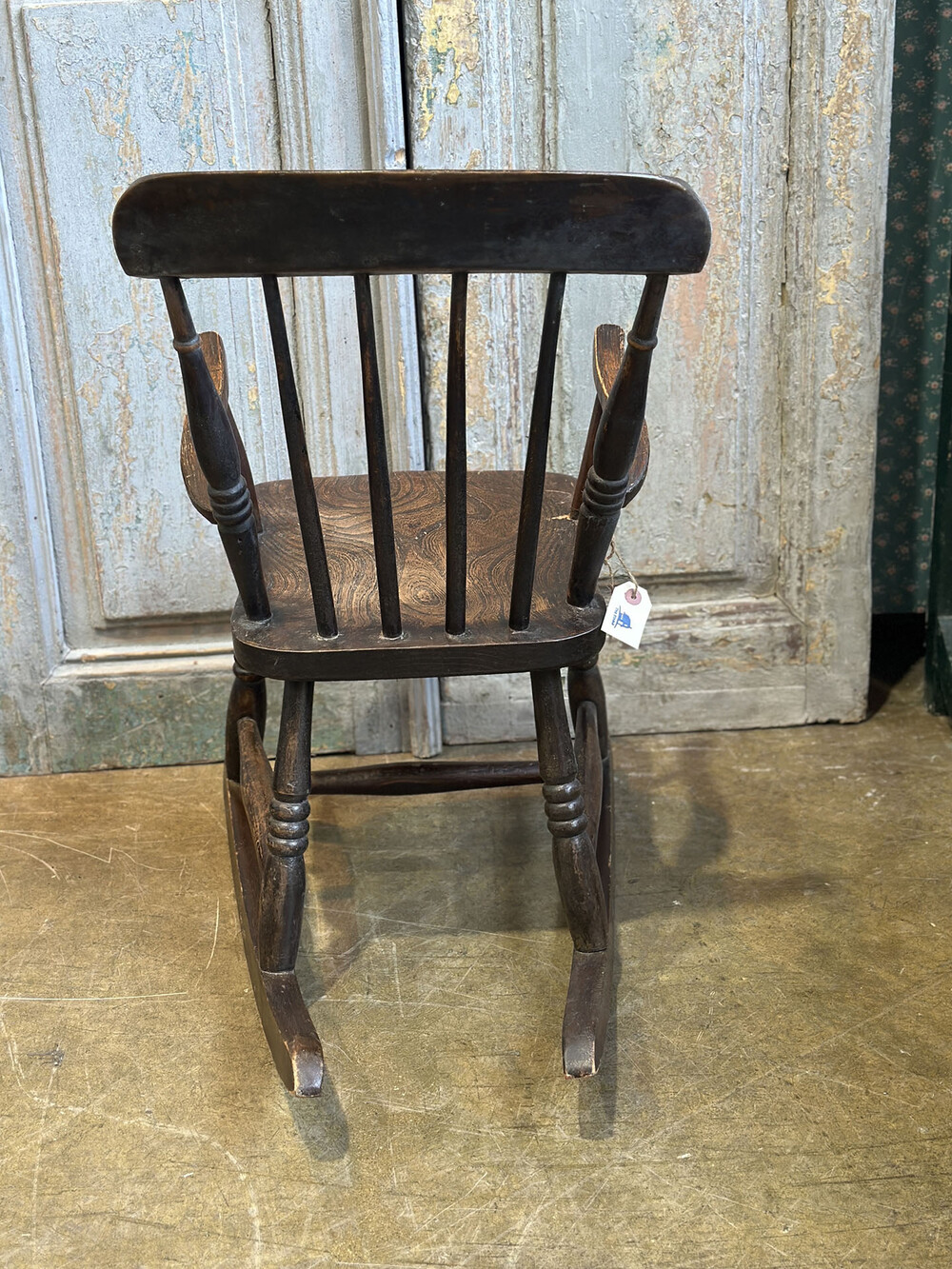23-068 Old vintage elm seat stick back rocking chair for chil