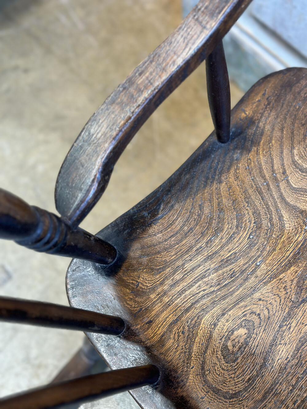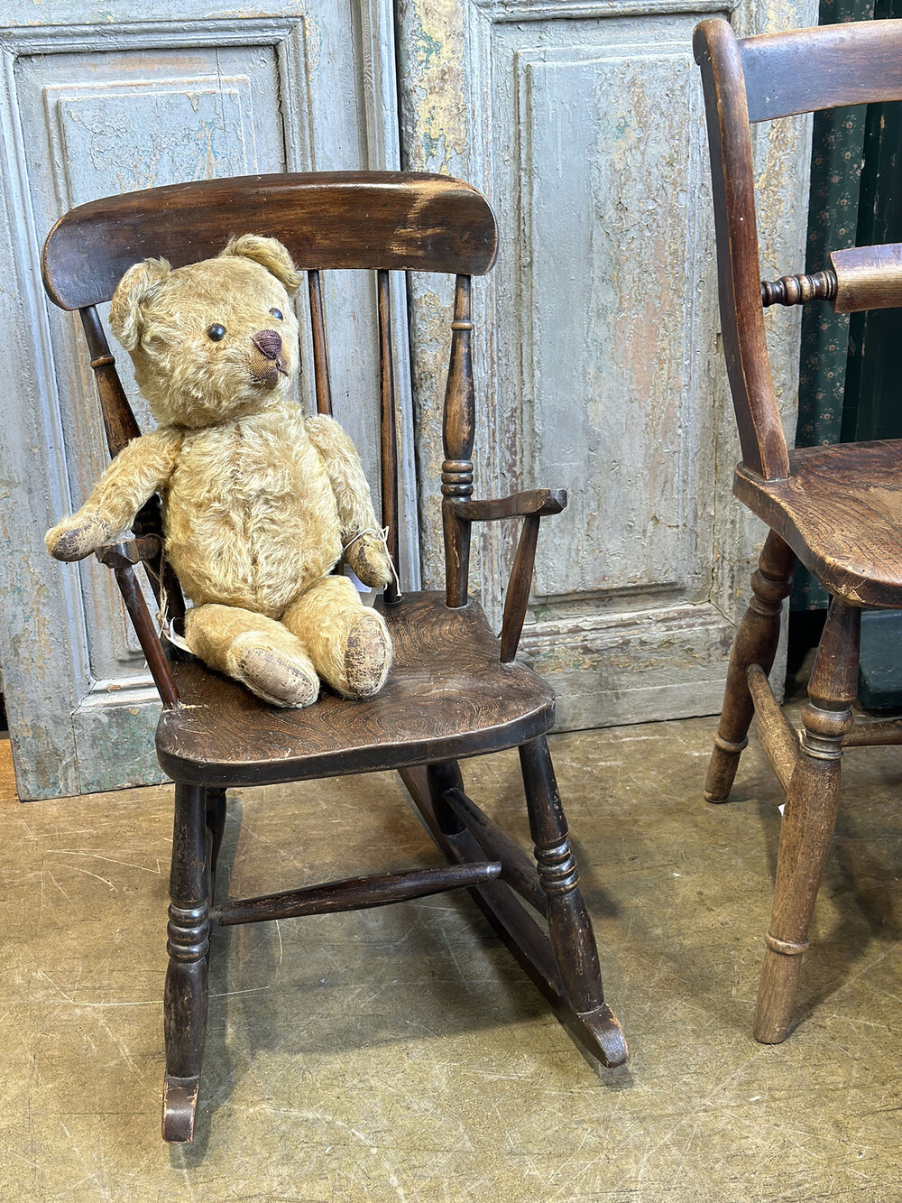 클래식 윈저 체어의 기본형태인 스틱백(stickback) 윈저 체어를 토대로 제작된 어린이용 록킹 체어입니다. 이 체어의 희소성은 소재에서도 특히 찾아볼 수 있는데, 시트 부분이 잉글리쉬 엘름(elm ; 느릅나무)으로 제작되었다는 점입니다. 잉글리쉬 엘름(elm ; 느릅나무) 소재의 가구들에 특별한 프리미엄이 얹혀진 이유는, 특정 시점부터 영국 내에서 엘름 나무의 벌목은 금지된 상태이기 때문입니다. 즉, 잉글리쉬 엘름으로 새가구를 만들 수 없고, 고가구에서만 잉글리쉬 엘름을 만날 수 있다는 확실한 희소성이 발생한 것이죠. 1900년대 초 영국에 수입된 목재에서 전해진 병충해로 인해서 영국 뿐 아니라 유럽 여러 나라의 엘름의 태반을 고사시키는 일이 발생했고, 이후 잠시 잠잠해지는 듯 했으나 1940년대에 다시 크게 번지는 바람에 영국에서는 엘름이 보호종으로 지정되어 지금에 이르러서도 귀한 대접을 받게 되었습니다.