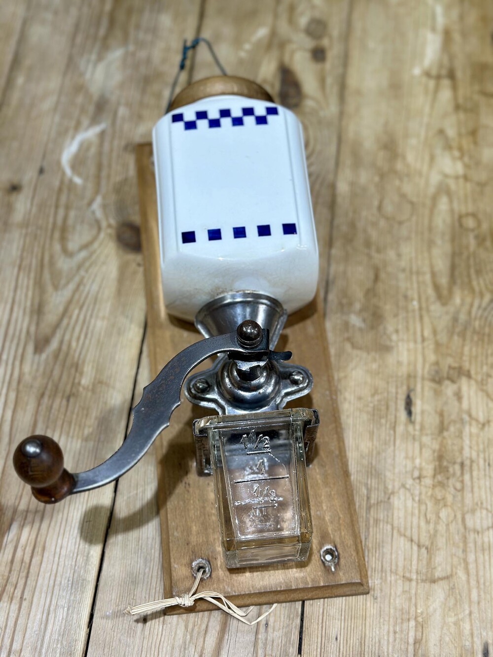 벽걸이 방식의 빈티지 프렌치 커피 밀입니다. 원두를 보관하는 부분은 세라믹 도기로 만들어져 있으며, 리드가 포함되어 있습니다.