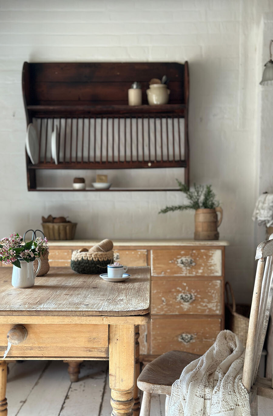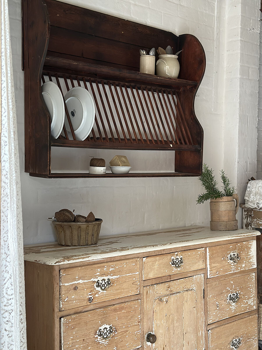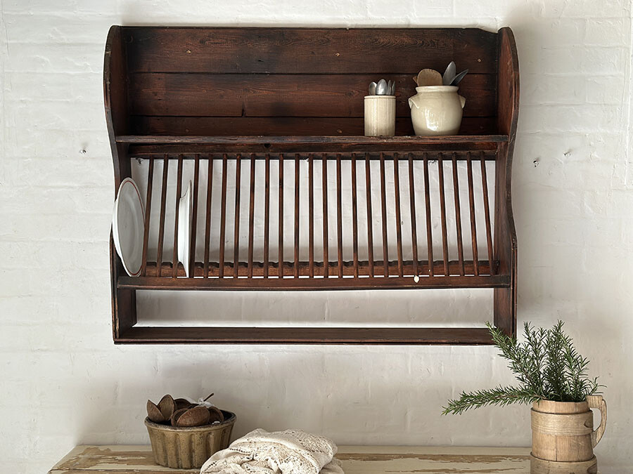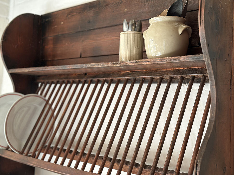 짙은 마호가니 톤이 깊은 분위기를 자아내는 에스토니아산 앤틱 플레이트 랙(Antique Plate Rack)입니다. 19세기 말에서 20세기 초 사이에 제작된 것으로 추정되며, 실용성과 장식성을 겸비한 전통적인 주방 가구입니다. 가장 큰 특징은 전면에 배열된 수직 슬롯 구조로, 접시를 세워 보관할 수 있도록 설계되어 있어요. 그 위쪽에는 오픈된 윗단 선반이 있어, 길이가 긴 도기류나 조리 도구 등을 자유롭게 수납하기 좋고, 상부가 막혀 있지 않아 다양한 형태의 키친웨어도 부담 없이 올릴 수 있습니다.