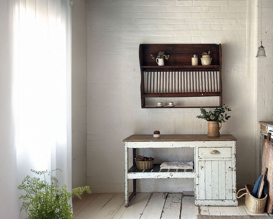 또한 하단부에는 좁은 폭의 슬림 쉘프가 하나 더 마련되어 있어, 소형 양념통이나 찻잔, 작은 키친 아이템들을 간편하게 정리할 수 있는 구조입니다. 곡선이 살아 있는 양 측면의 실루엣과 진한 우드 컬러가 공간에 깊이를 더하며, 단순한 수납을 넘어 포인트 가구로서의 매력을 발산합니다. 빈티지 접시나 소품, 허브 화분 등을 조합하면 감각적인 월 디스플레이 연출도 가능합니다.