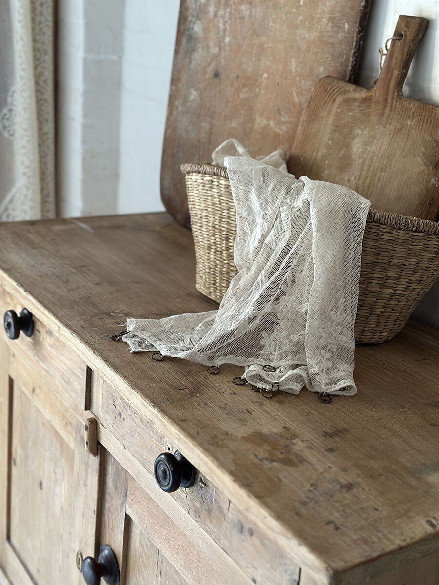 서랍 두 개와 넉넉한 수납공간이 있는 양문 수납장으로 구성되어 있어 실용성 또한 뛰어납니다. 오리지널 도자기 손잡이와 열쇠 구멍 디테일은 당시 장인의 손길을 느낄 수 있게 해주며, 전체적으로 은은하게 마모된 표면과 자연스러운 옹이는 이 가구만의 고유한 매력을 강조합니다. 화이트 벽이나 러스틱한 공간에 잘 어울리며, 주방, 거실, 복도 등 어디에 두어도 차분하고 고풍스러운 포인트가 됩니다.