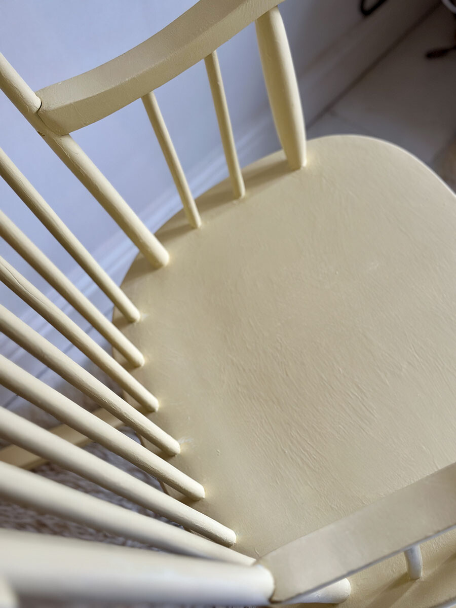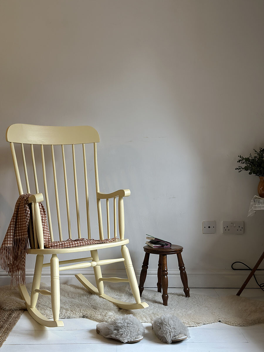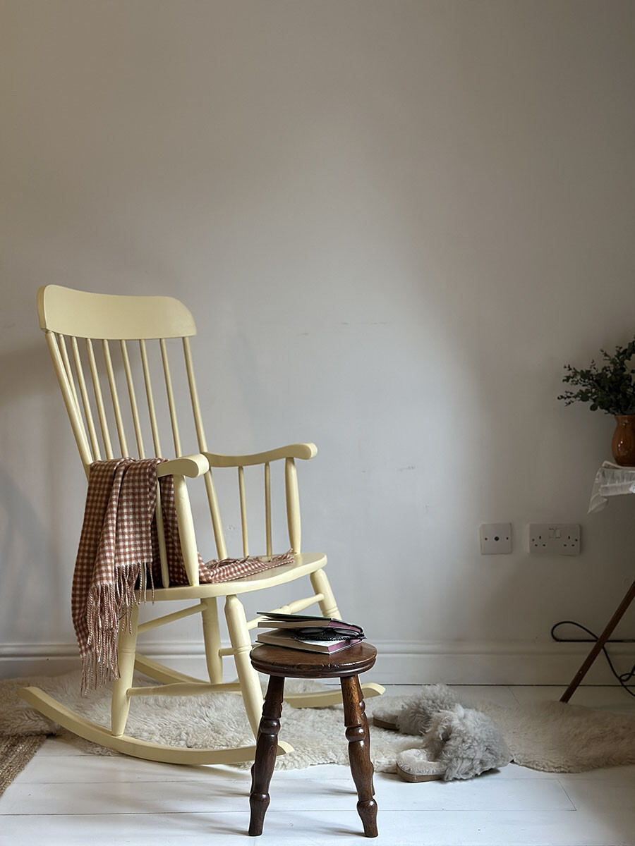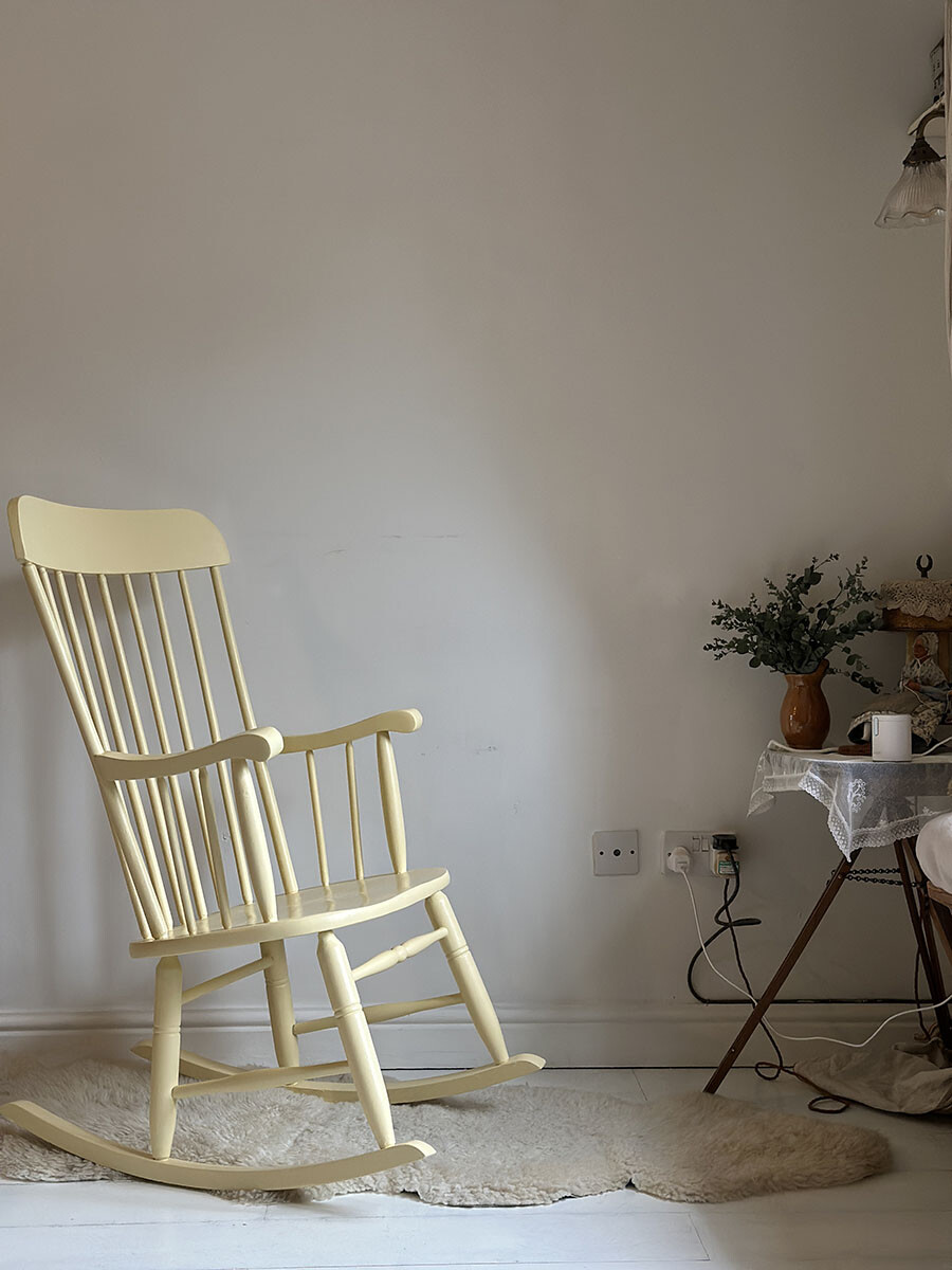부드러운 파스텔 톤의 레몬 옐로우 컬러로 페인팅된 이 록킹 체어는 쉐비 시크(Shabby Chic) 감성이 가득 담긴 사랑스러운 가구입니다. 윈저 스타일의 스틱백 디자인을 기반으로 제작된 이 체어는, 클래식한 실루엣 위에 밝고 따스한 색감을 입혀 공간을 한층 더 따뜻하게 만들어줍니다.