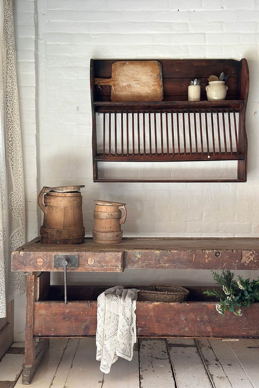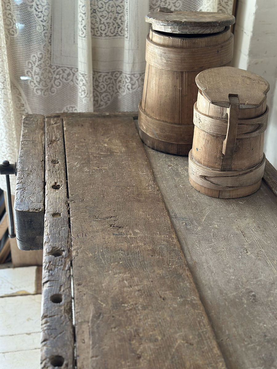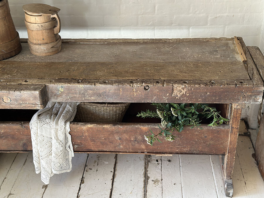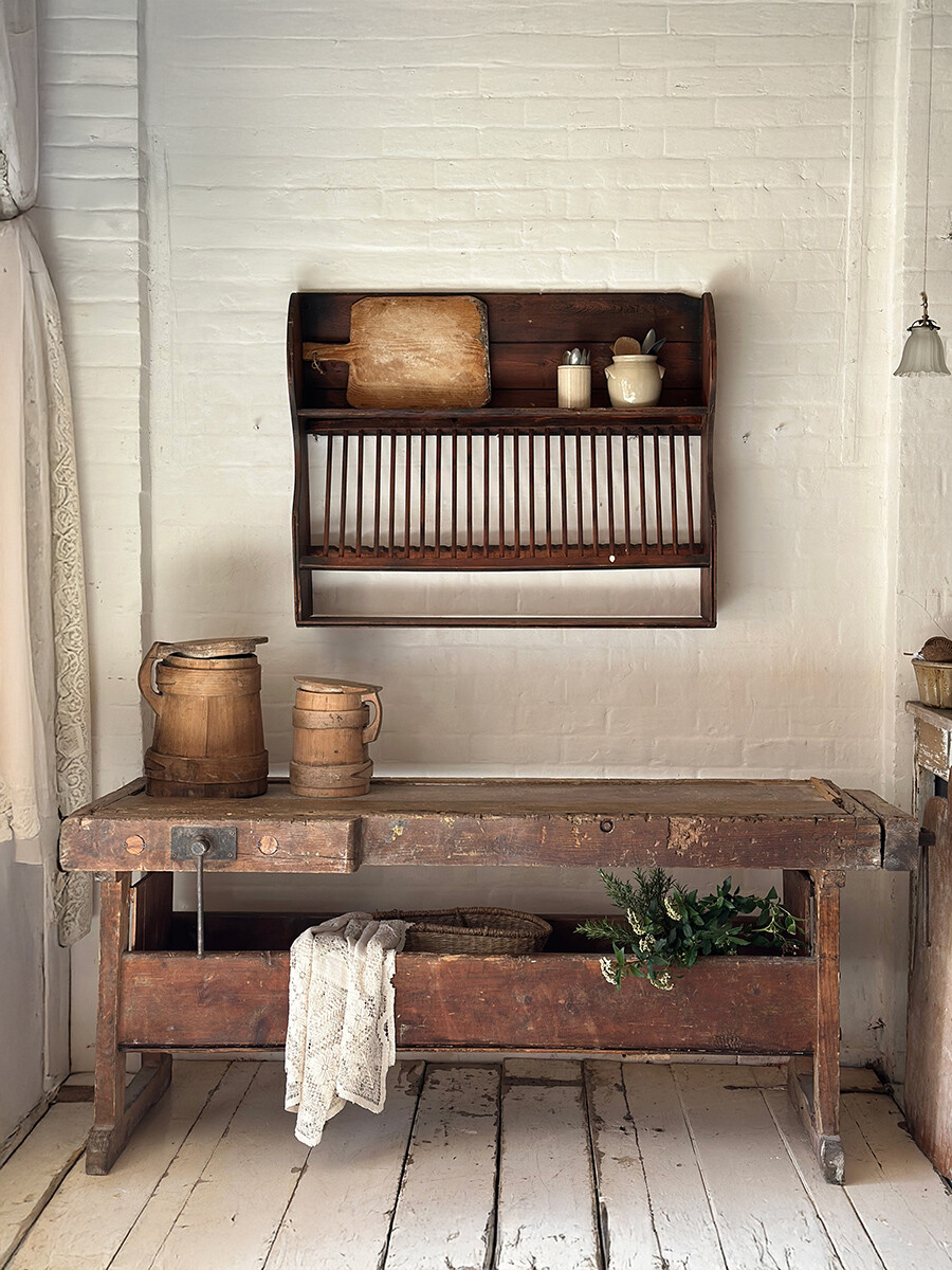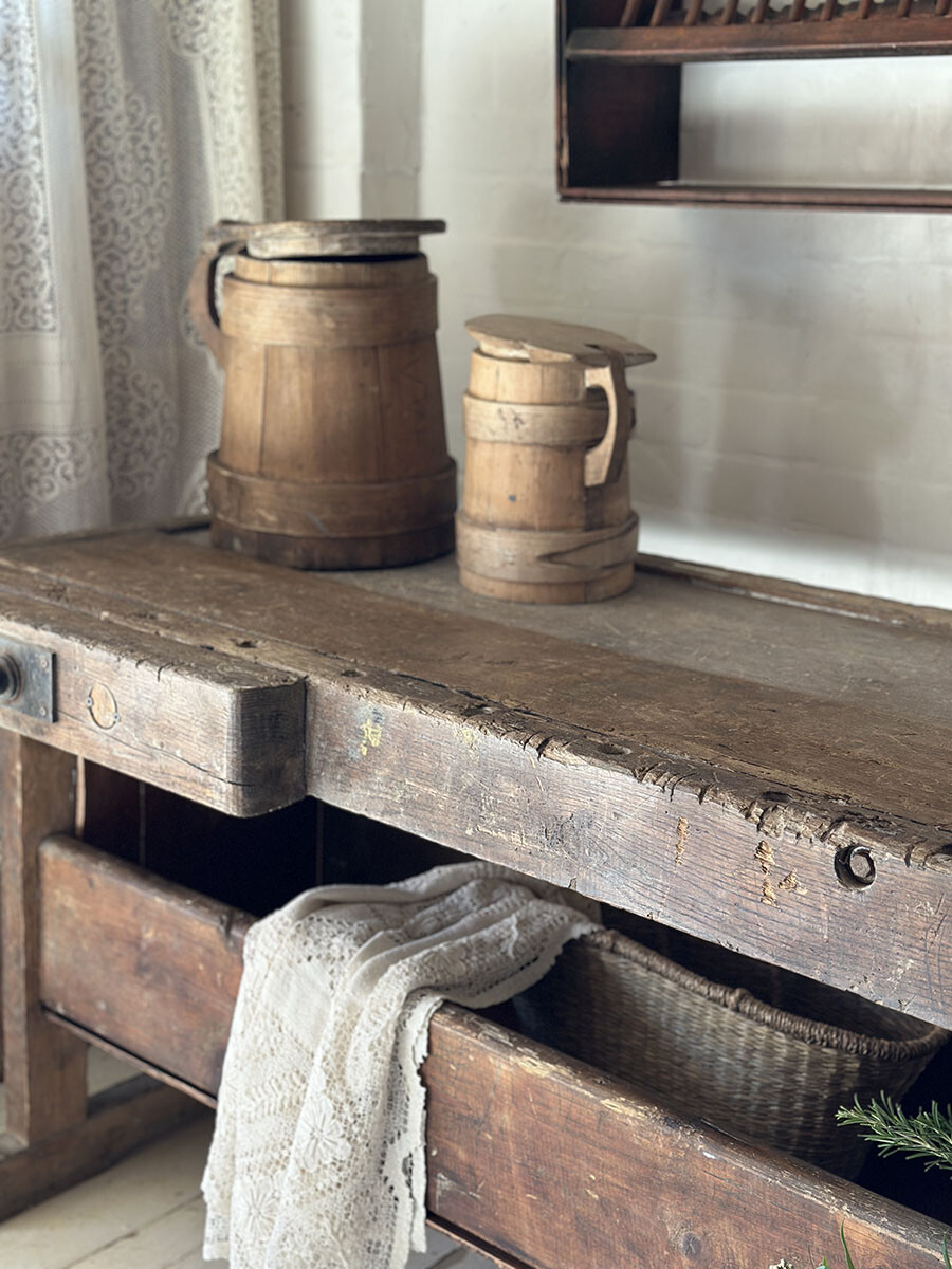 1800년대 후반에서 1900년대 초반 사이에 제작된 워크벤치로 런던에서 수집되었습니다. 수십 년간 수많은 손길을 거치며 마모된 상판, 고요히 패여버린 결 자국, 그리고 그 모든 흔적 위로 켜켜이 쌓인 깊은 파티나(patina)가 이 워크벤치가 살아온 시간을 고스란히 증명해줍니다. 마치 그 시절의 작업실 한 켠을 통째로 옮겨온 듯한 존재감. 그 묵직한 감성과 실용성을 동시에 품고 있죠.