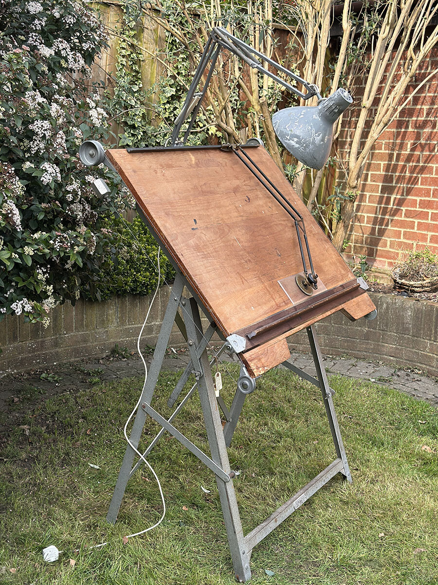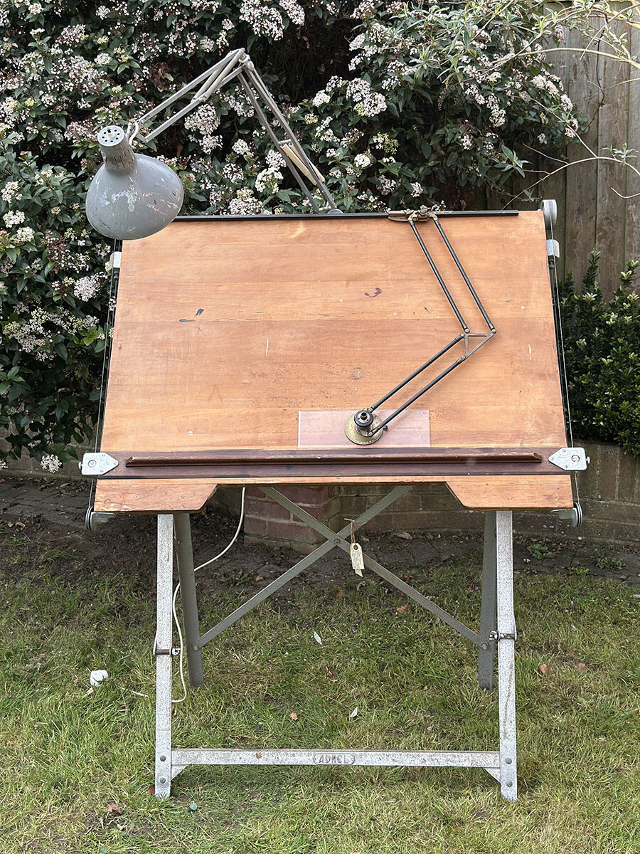 25-074 Vintage ADMEL architects drawing board with a drawing arm and Anglepoise lamp