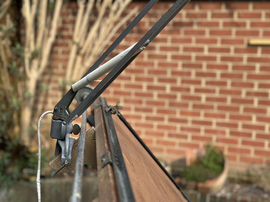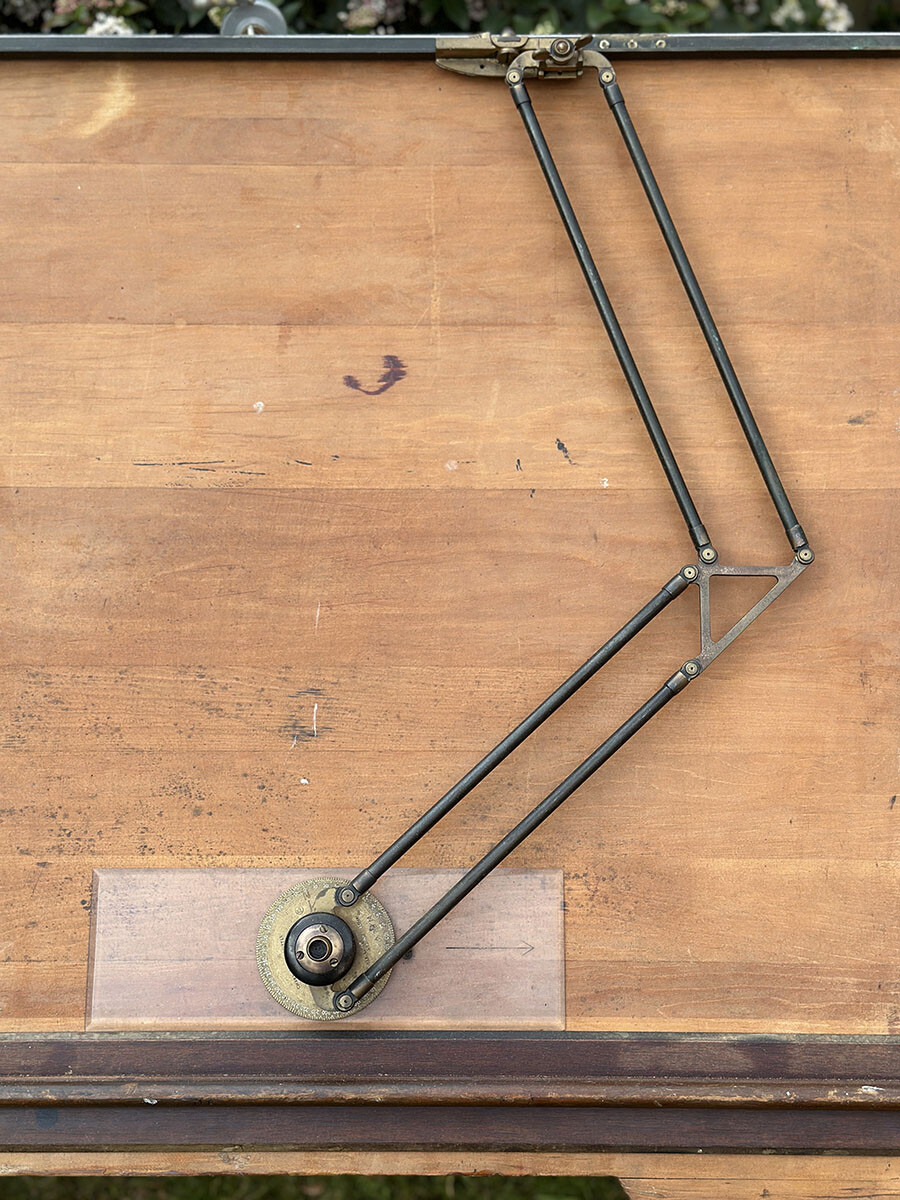 이 책상의 핵심 기능 중 하나는 중앙에 장착된 스케일 암입니다. LAWES RABJOHNS 특유의 메커니즘으로 설계된 이 암은 여러 관절로 구성되어 있어 부드럽게 회전하고 이동하며, 정밀한 직선 작업이나 스케일 측정이 가능하게 도와줍니다. 원형 피벗을 중심으로 안정감 있게 움직이며, 드로잉 작업 시 뛰어난 실용성을 보여줍니다. 스케일 암은 X축 포지셔닝 포인트를 변경할 수 있도록 되어 있고, 탈착이 가능하게끔 되어 있습니다.