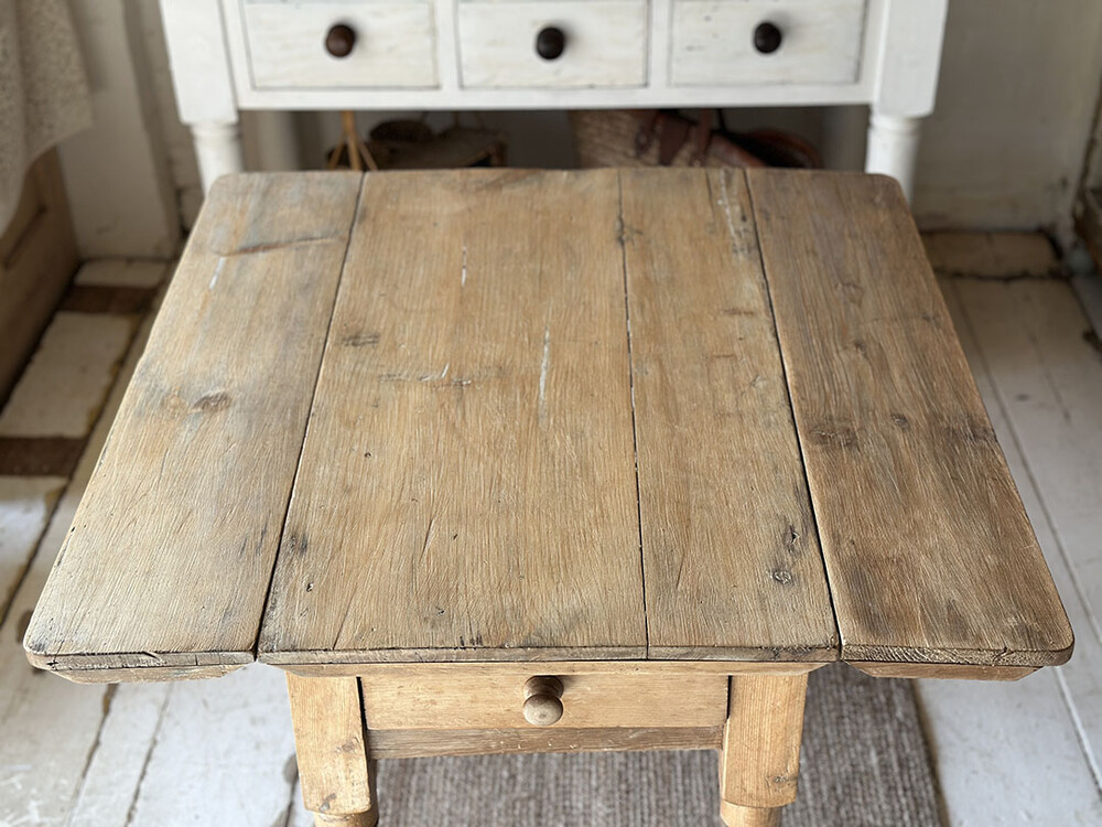 아늑한 분위기를 자아내는 빈티지 파인 드랍리프 테이블입니다. 테이블 상판의 양쪽은 아래로 접히는 구조이며, 펼칠 때에는 상판 아래에 장착된 지지대를 이용해 고정할 수 있습니다.