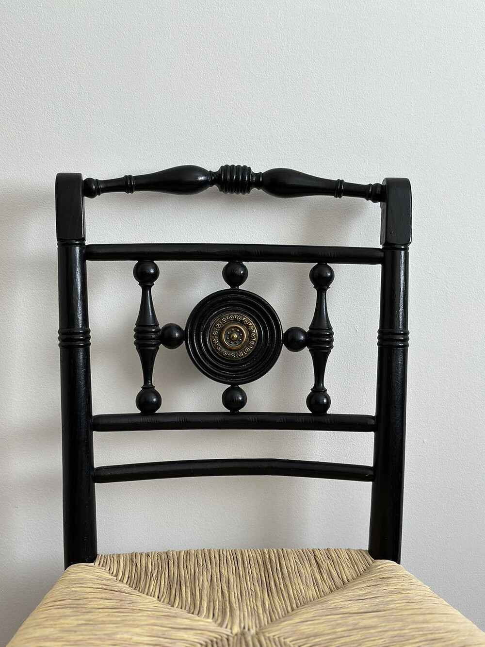 영국 옥스퍼드에서 수집된 이 베드룸 체어 역시, 등받이에는 18세기 후반 신고전주의 양식의 장식 조형이 적용되어 있습니다. 다리 부분에는 여전히 빅토리안 터닝 레그와 장부 맞춤 방식의 짜임 구조를 볼 수 있지만, 빅토리아 시대에 비해 다리는 더욱 가늘어졌고, 19세기 후반에 개발된 스팀 벤딩 기술을 활용해 목재를 휘어 만든 곡선형 커브 파츠들이 전반적으로 적용된 것이 특징입니다. 또한 등받이 장식에 더해진 골드 컬러 터치와 러쉬 시트의 색감이 흑단(에보니; ebony) 톤과 조화를 이루며, 한층 고급스러운 분위기를 자아냅니다. 이러한 컬러링은 에드워디안 시대에 유행했던 특징이기도 해요.