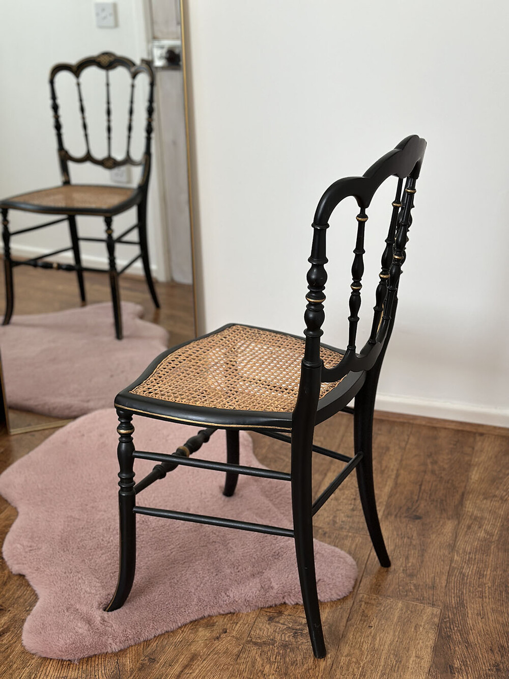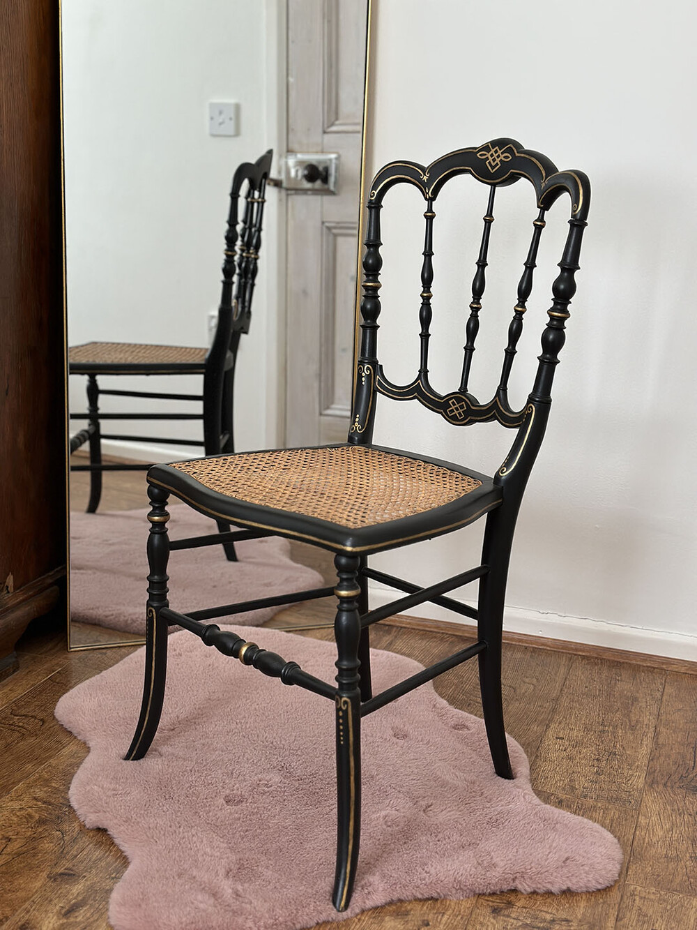 영국 옥스퍼드에서 수집된 이 베드룸 체어는 골드 컬러와 블랙 컬러의 조화가 상당히 고급스러운데요, 흑단(에보니) 컬러의 체어에 신고전주의적 요소를 가진 골드 컬러의 핸드 페인팅과 케인 시트가 어우러져 선명한 인상을 남기고 있습니다. 다리 부분에는 여전히 빅토리안 터닝 레그와 장부 맞춤 방식의 짜임 구조를 볼 수 있지만, 빅토리아 시대에 비해 다리는 더욱 가늘어졌고, 19세기 후반에 개발된 스팀 벤딩 기술을 활용해 목재를 휘어 만든 곡선형 커브 파츠들이 전반적으로 적용된 것이 특징입니다.