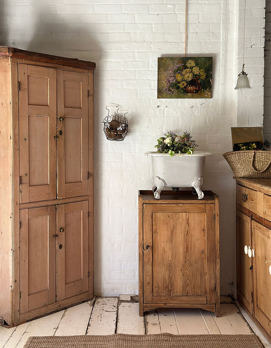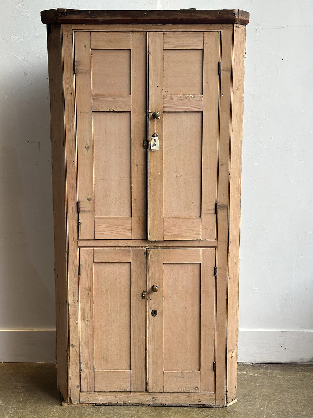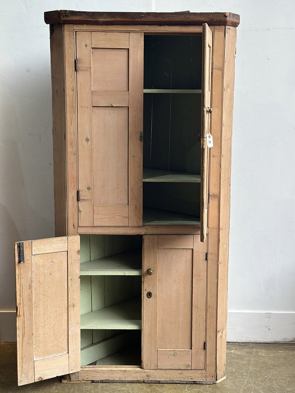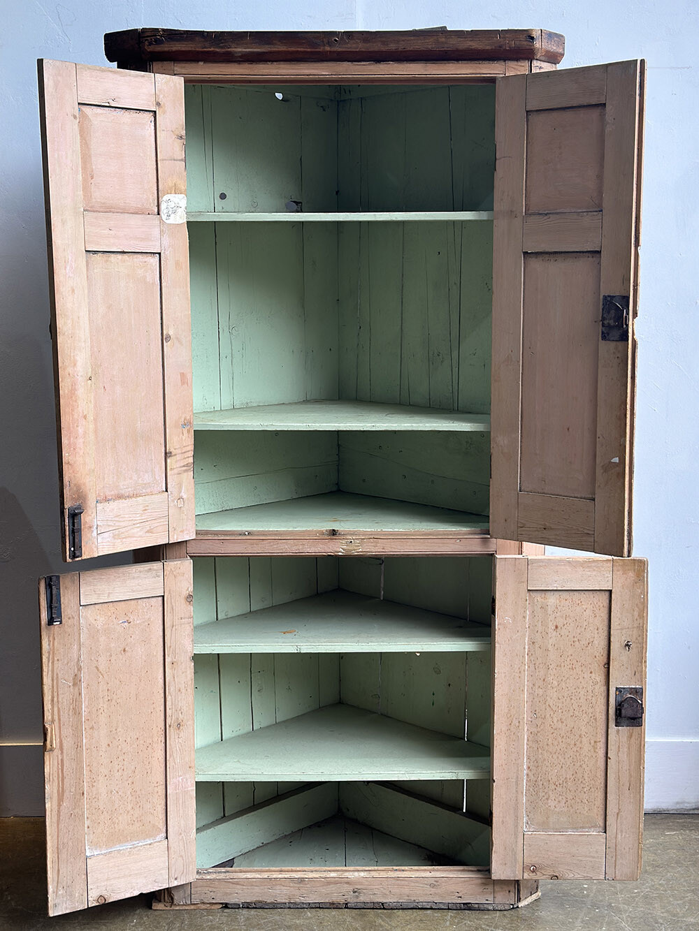 앤틱 파인 소재의 개폐형 코너 유닛입니다. 이름 그대로 실내의 코너 공간에 맞춰 배치할 수 있도록 삼각형 형태로 제작된 이 캐비넷은, 상부의 코니스 장식과 도어의 몰딩, 하부의 구조 등에서 신고전주의의 영향을 받은 빅토리안 컨트리 가구 디자인의 전형적인 요소를 고스란히 담고 있습니다.