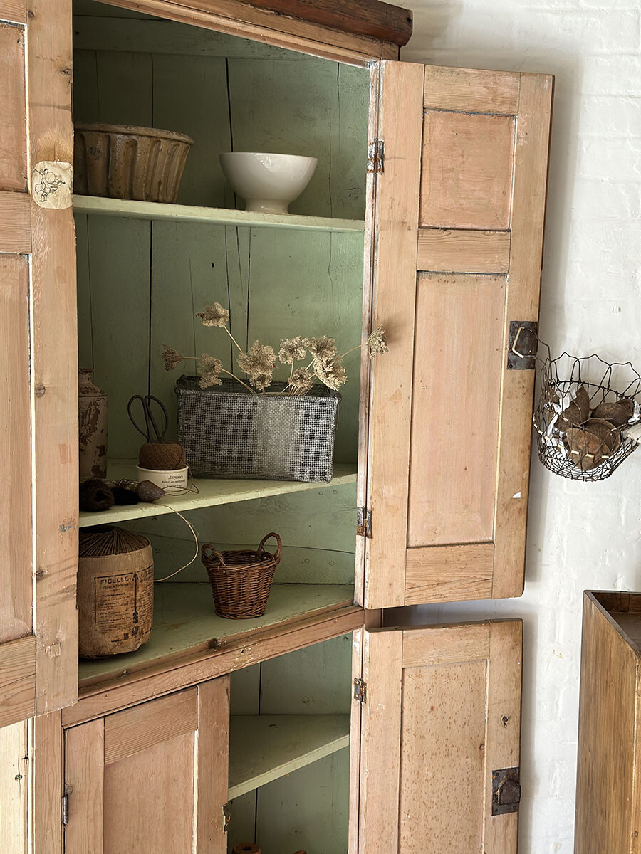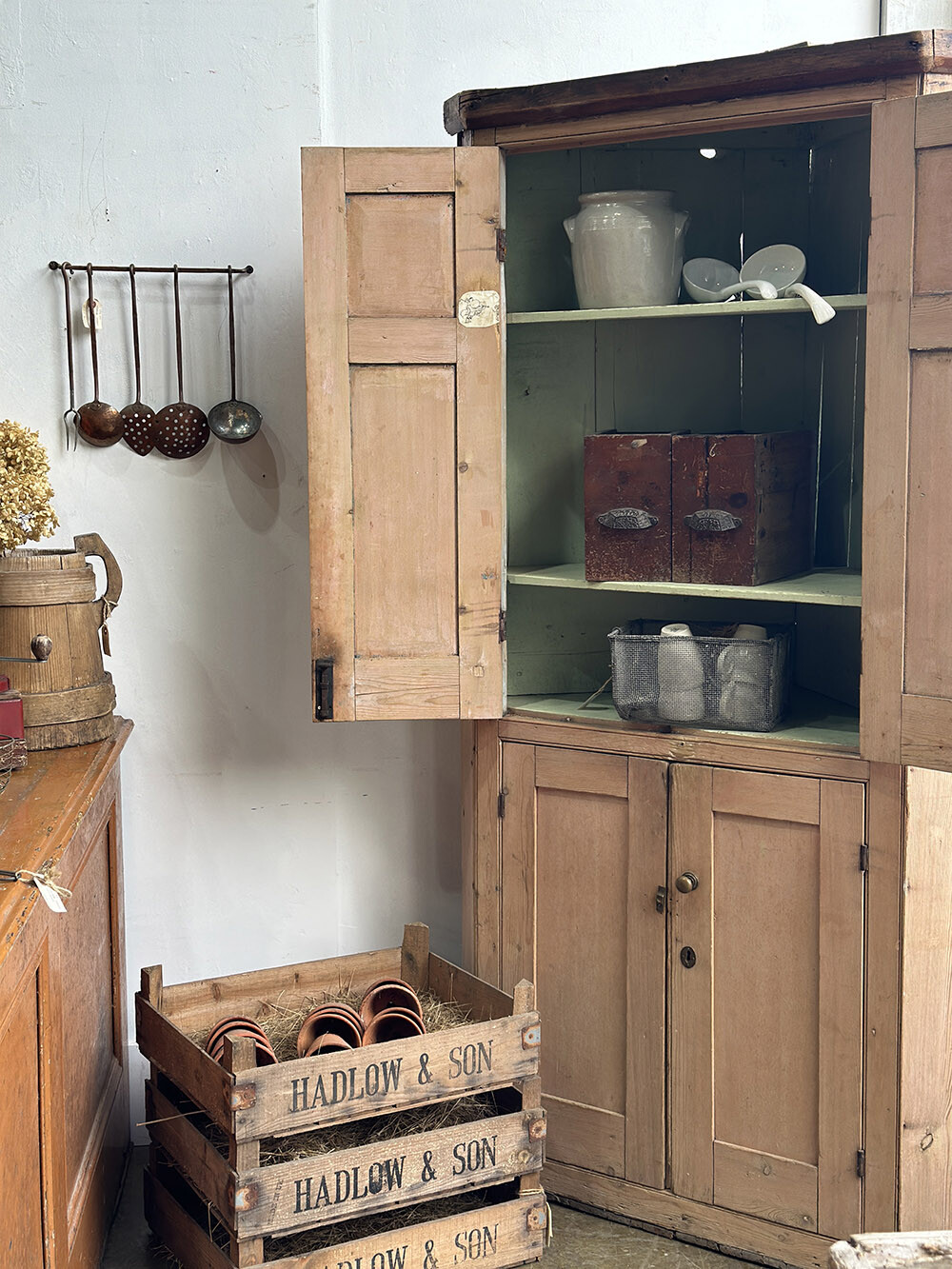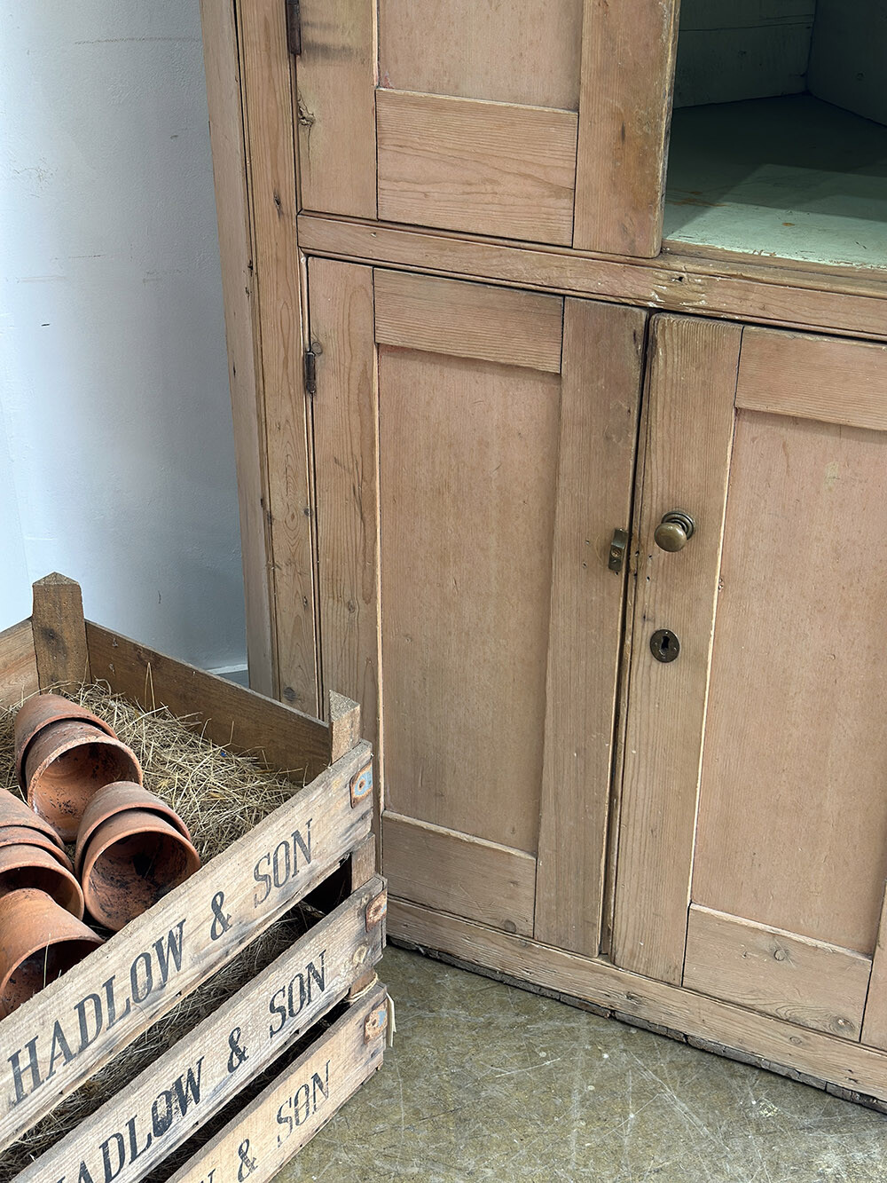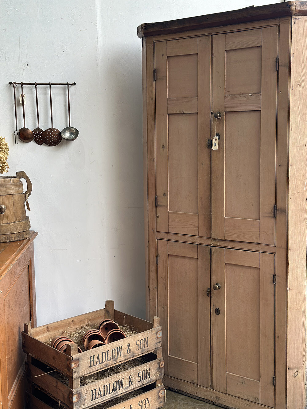 앤틱 파인 소재의 개폐형 코너 유닛입니다. 이름 그대로 실내의 코너 공간에 맞춰 배치할 수 있도록 삼각형 형태로 제작된 이 캐비넷은, 상부의 코니스 장식과 도어의 몰딩, 하부의 구조 등에서 신고전주의의 영향을 받은 빅토리안 컨트리 가구 디자인의 전형적인 요소를 고스란히 담고 있습니다.