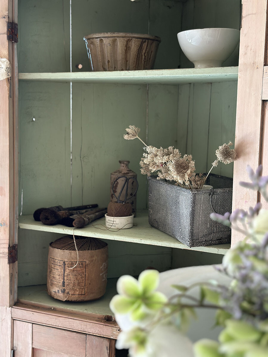 구조는 상단과 하단으로 나뉘며, 각각 2개의 선반이 있어 총 3단으로 구성되어 있습니다. 내부는 쉐비 시크 스타일의 페인팅으로 마감되어 있어, 문을 닫았을 때와 열었을 때 서로 다른 색채 감각을 느낄 수 있습니다.