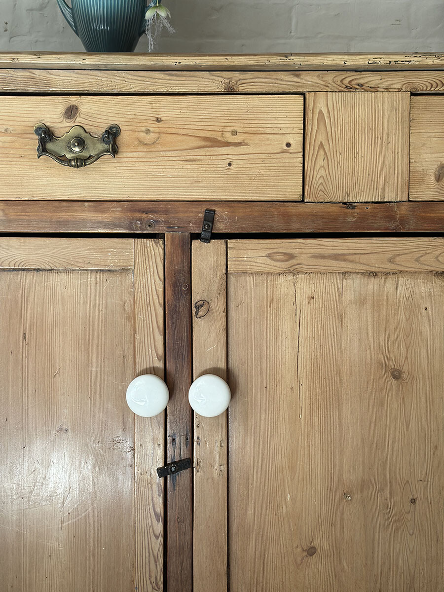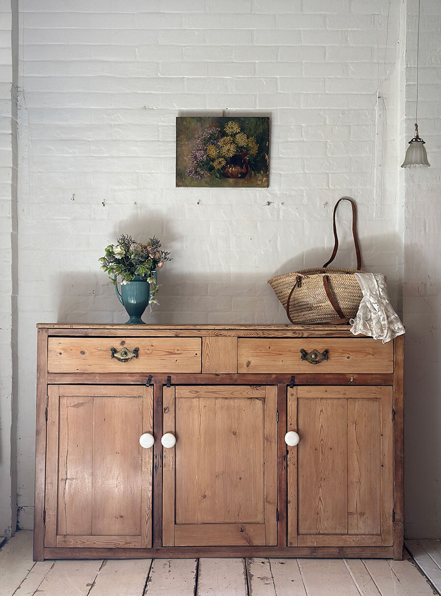 빅토리안 특유의 절제된 선과 실용성이 돋보이는 사이드보드입니다. 이 가구는 1800년대 후반, 영국 빅토리아 시대에 제작된 진귀한 파인 가구로, 최소 120년을 훌쩍 넘은 ‘앤틱 파인’으로 분류됩니다. 수집 당시 들은 바에 따르면, 이 사이드보드는 원래 뒷판이 없는 상태였으며, 이는 19세기 캐비넷류 가구에서 종종 볼 수 있는 제작 방식입니다. 벽에 밀착시켜 사용하는 전제하에 제작된 경우, 굳이 뒷면을 마감하지 않는 것이 일반적이었기 때문입니다. 현재 보이는 뒷판은 직전 소장자가 리플레이스하여 추가한 것이며, 손잡이 역시 원래 것이 아닌 후대 교체된 것으로 보이고, 지금은 세라믹 플레인 노브가 부착되어 있습니다. 복원된 요소들이 자연스럽게 어우러져 전체적인 조화를 해치지 않으면서도 기능성과 미감을 보완해줍니다.