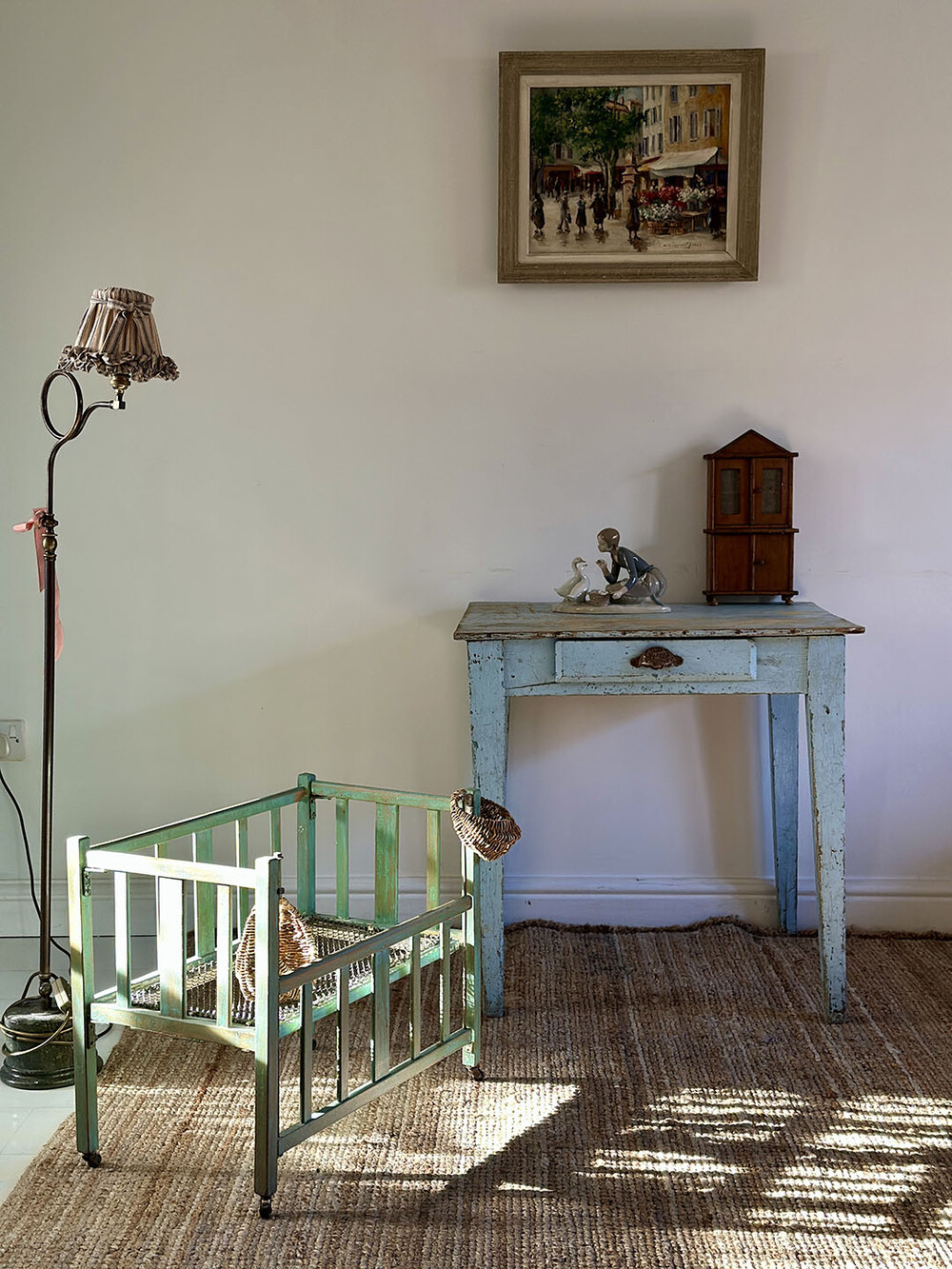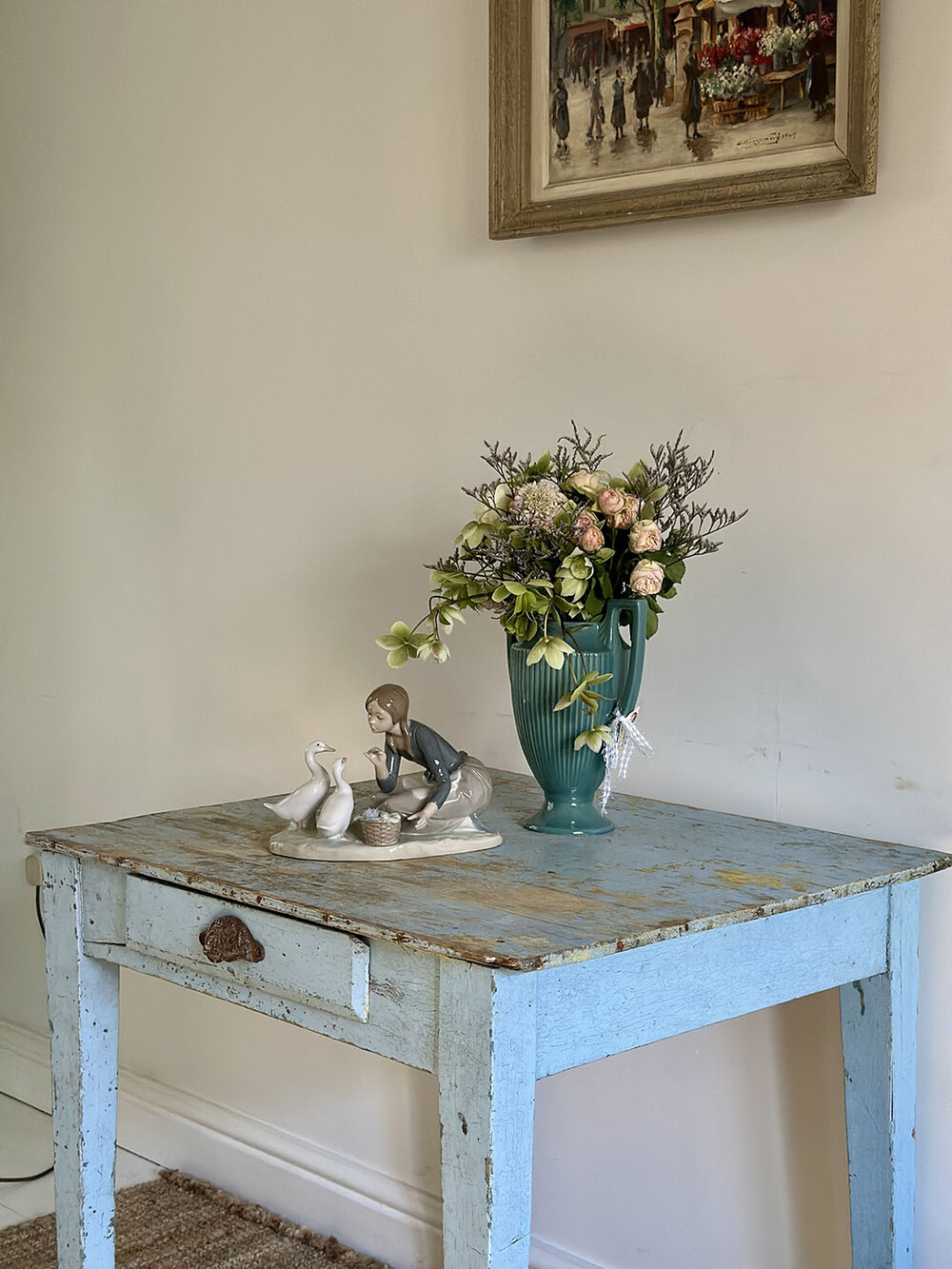 은은한 파우더 블루 컬러 위로 세월의 결이 차분하게 스며든, 프렌치 쉐비 시크 테이블입니다. 얇은 상판, 장식을 배제한 직선적인 엣지, 아래로 갈수록 가늘어지는 테이퍼드 레그. 프렌치 컨트리 퍼니쳐 특유의 간결하고 기능적인 미감을 고스란히 담고 있죠.